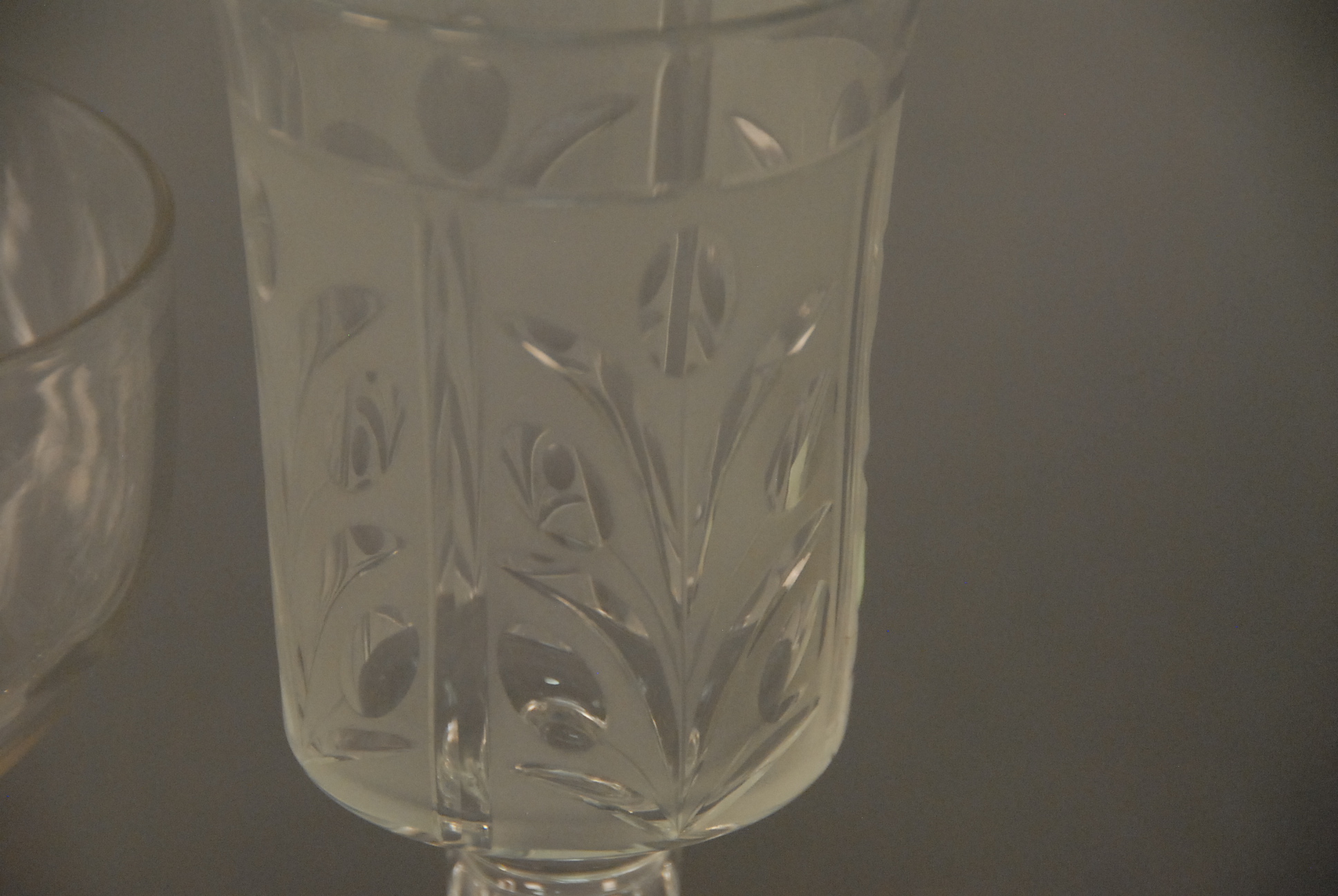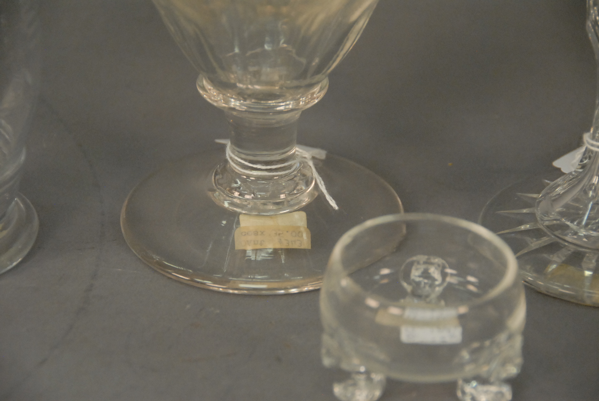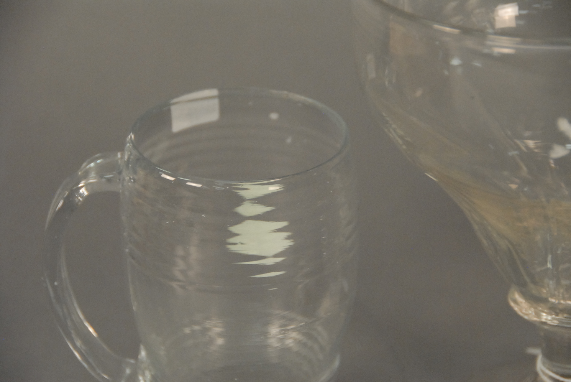 Four piece lot of clear glass to include one tall frosted to clear stem marked French circa 1740, one mug, one salt, and one compote. stem: ht. 9 in. mug: 5 in. Provenance: Property from a Private Collection Sold for the Benefit of the Virginia Historical Society.