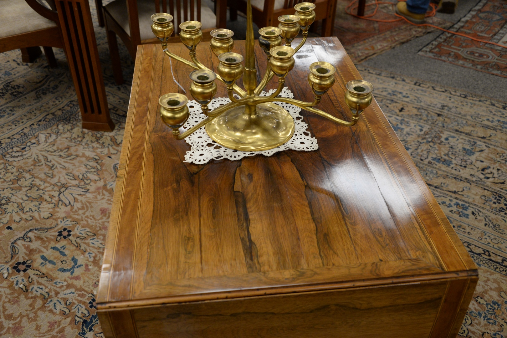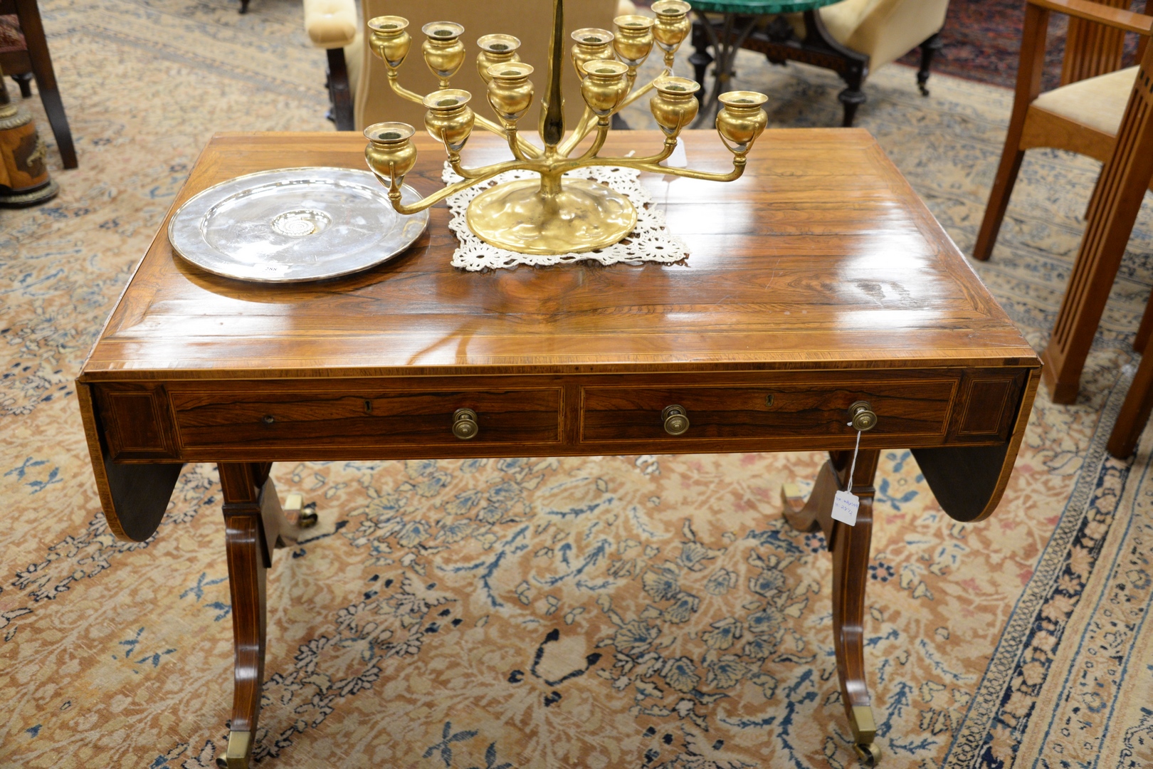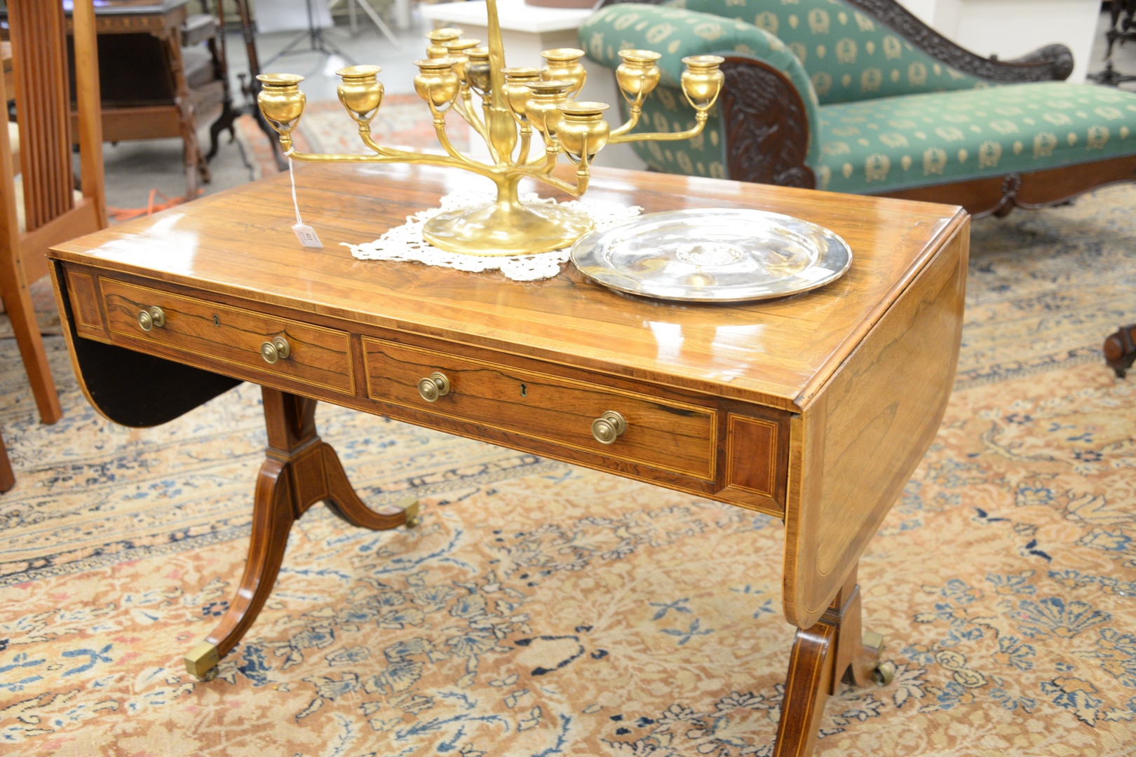 Lot 327: George IV Rosewood Sofa Table with banded inlaid top and drop leaves, two drawers and two false drawers set on four downswept member…