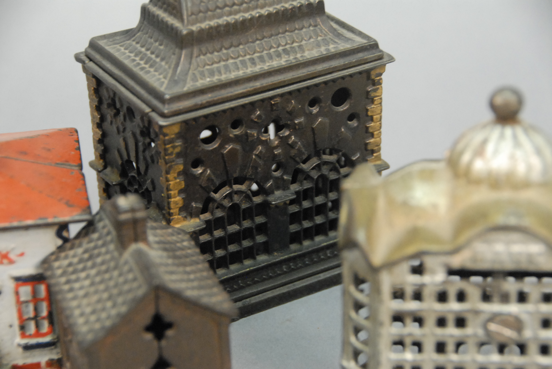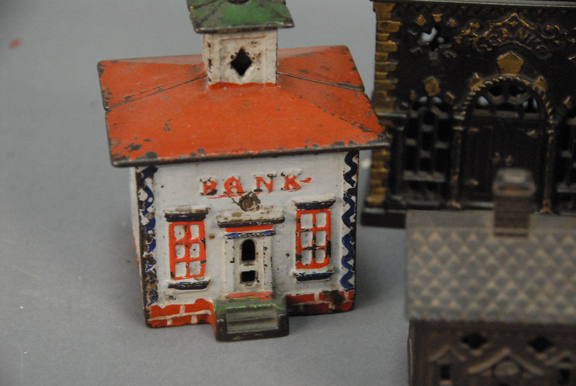Lot 327: Group of four cast iron still banks to include ornate still bank building, school house with copula, miniature house with chimney, a…