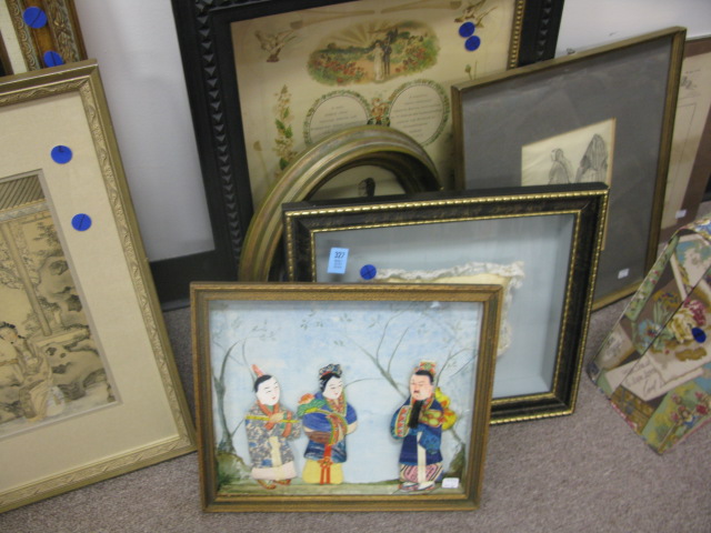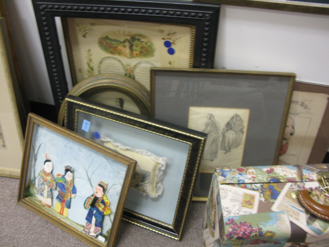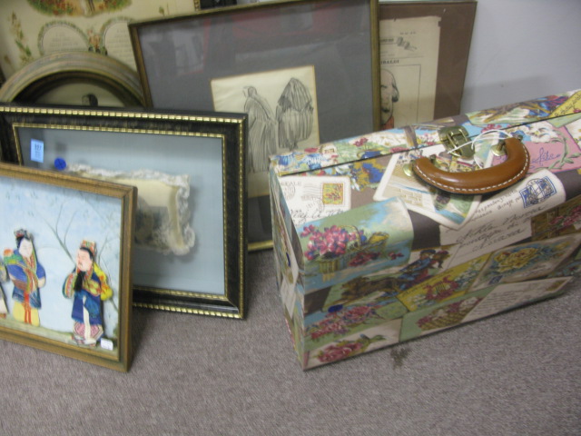 Group of prints, pencil drawing, shadow box, suitcase, etc