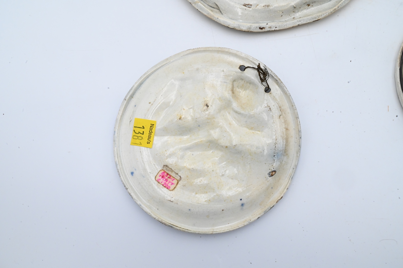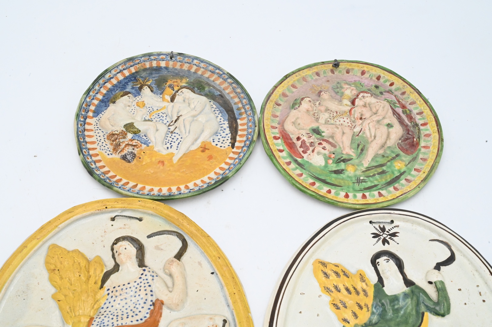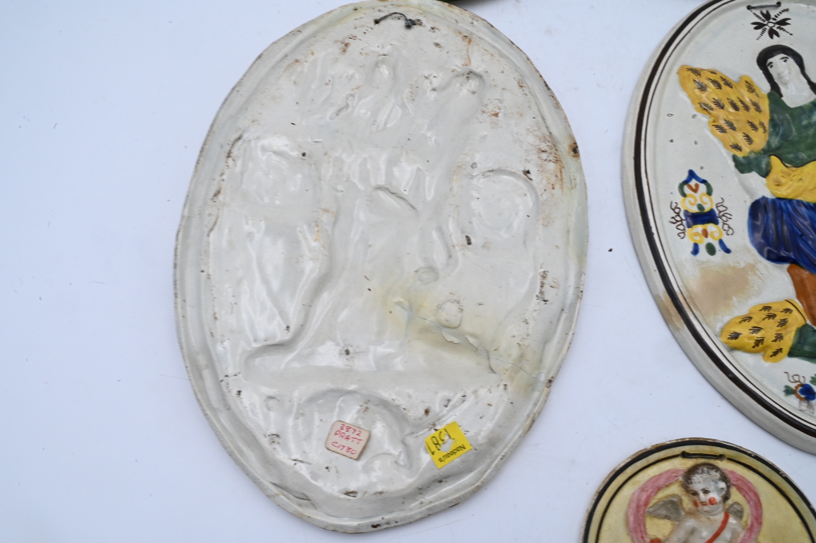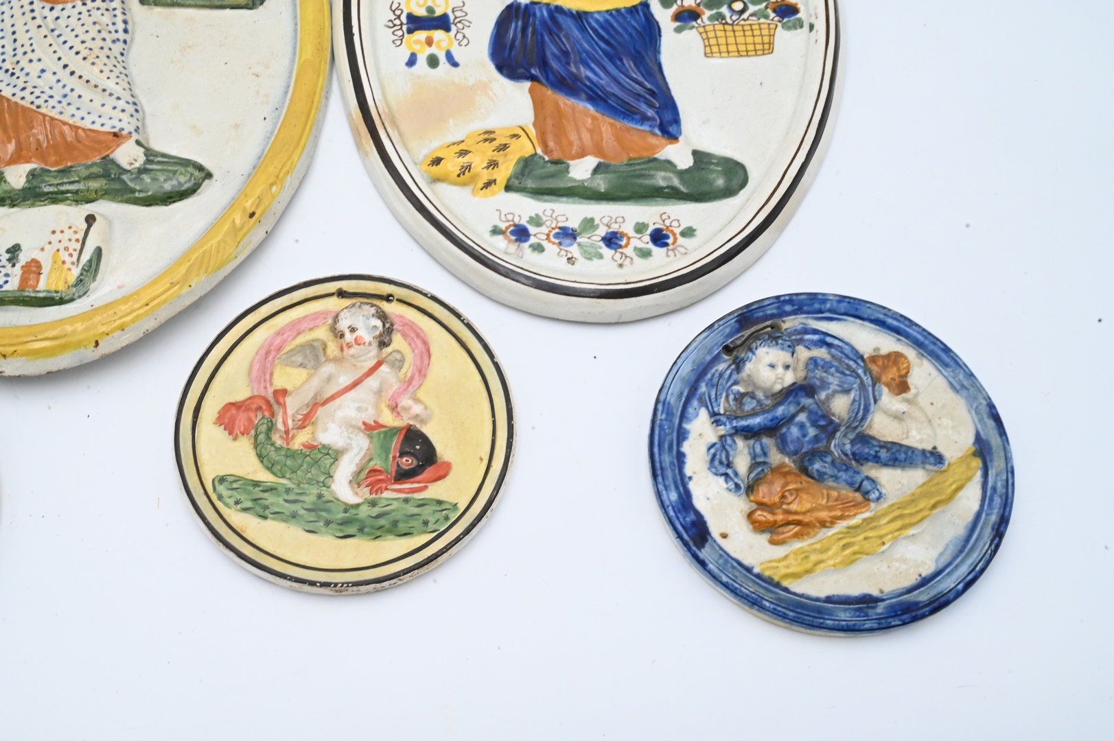 Group of Staffordshire and Pratt Wall Plaques, figural oval plaques, two having wheat figures, etc., tallest 13 inches, largest in diameter 7 inches.