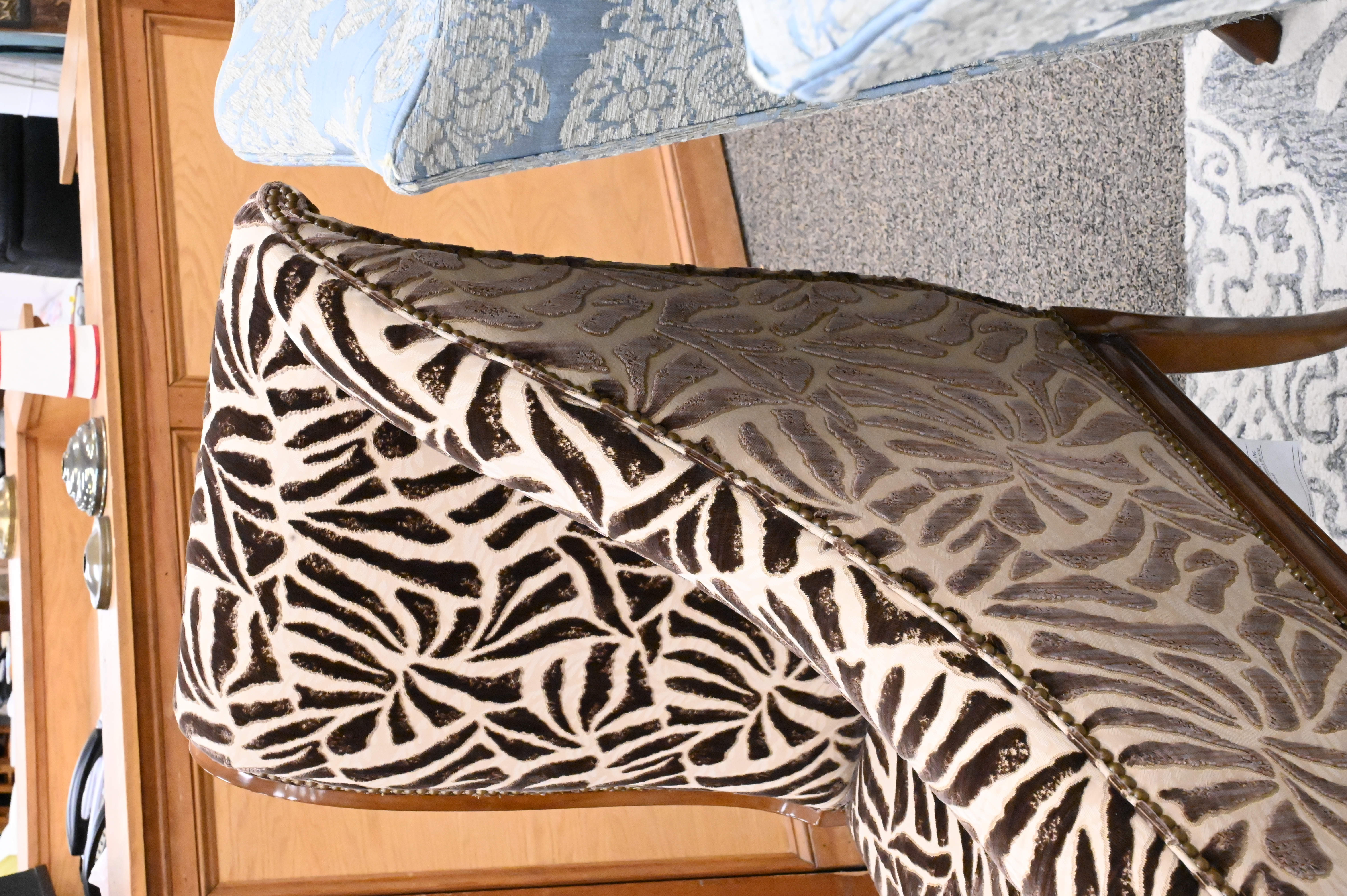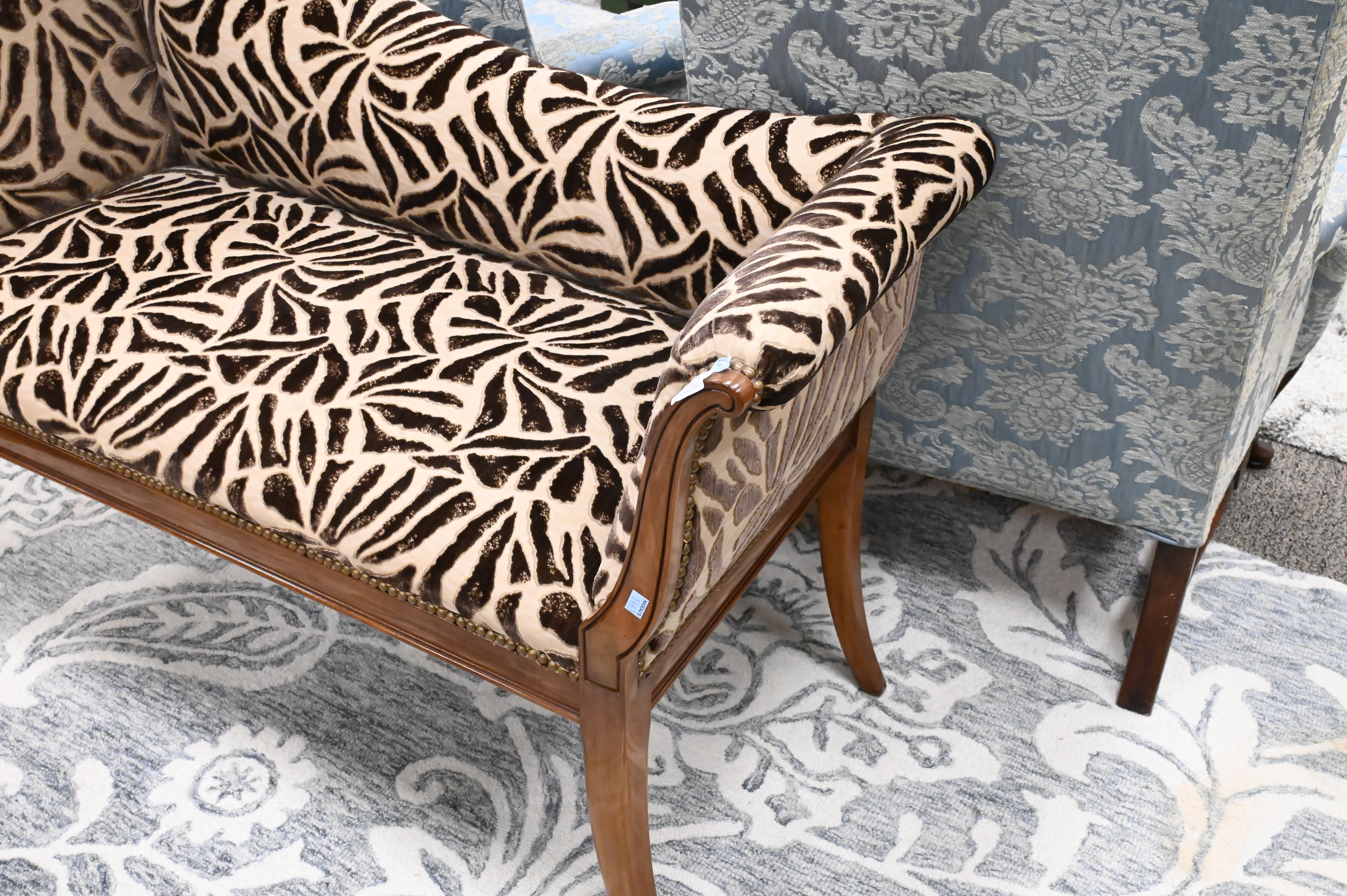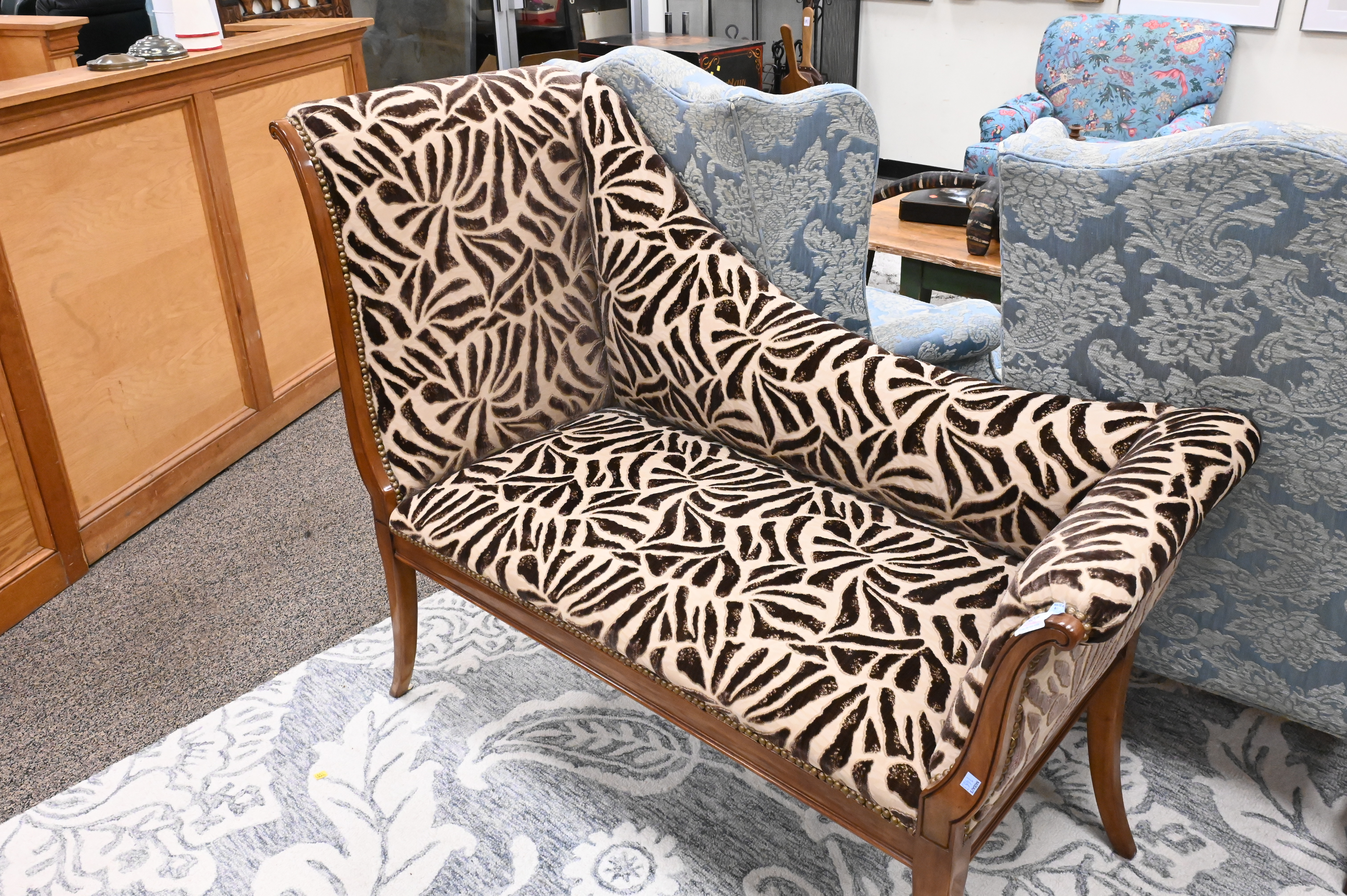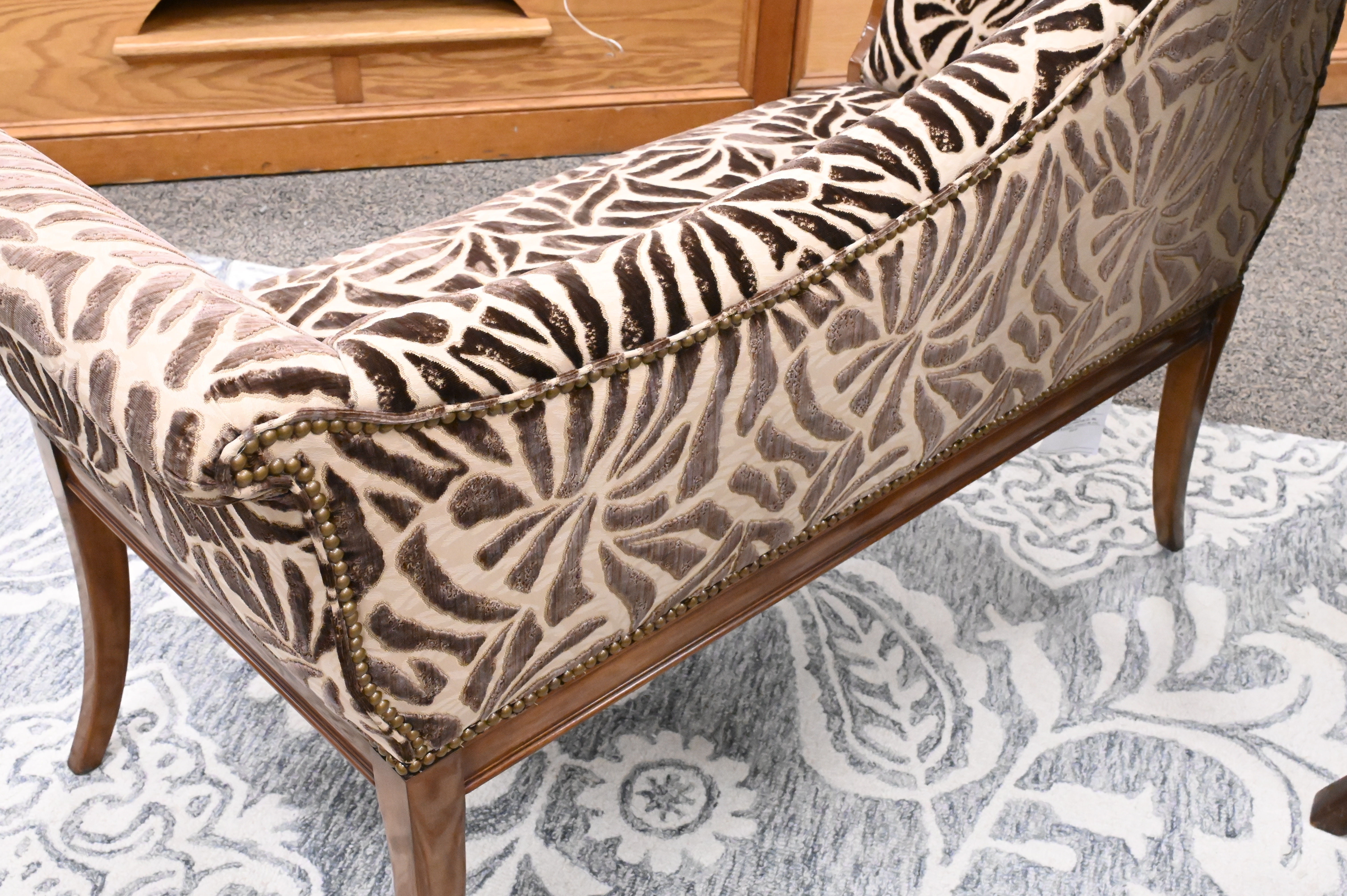 Karges Furniture Upholstered Chaise Lounge, having shaped back, height 42 inches, length 55 inches, depth 23 inches.