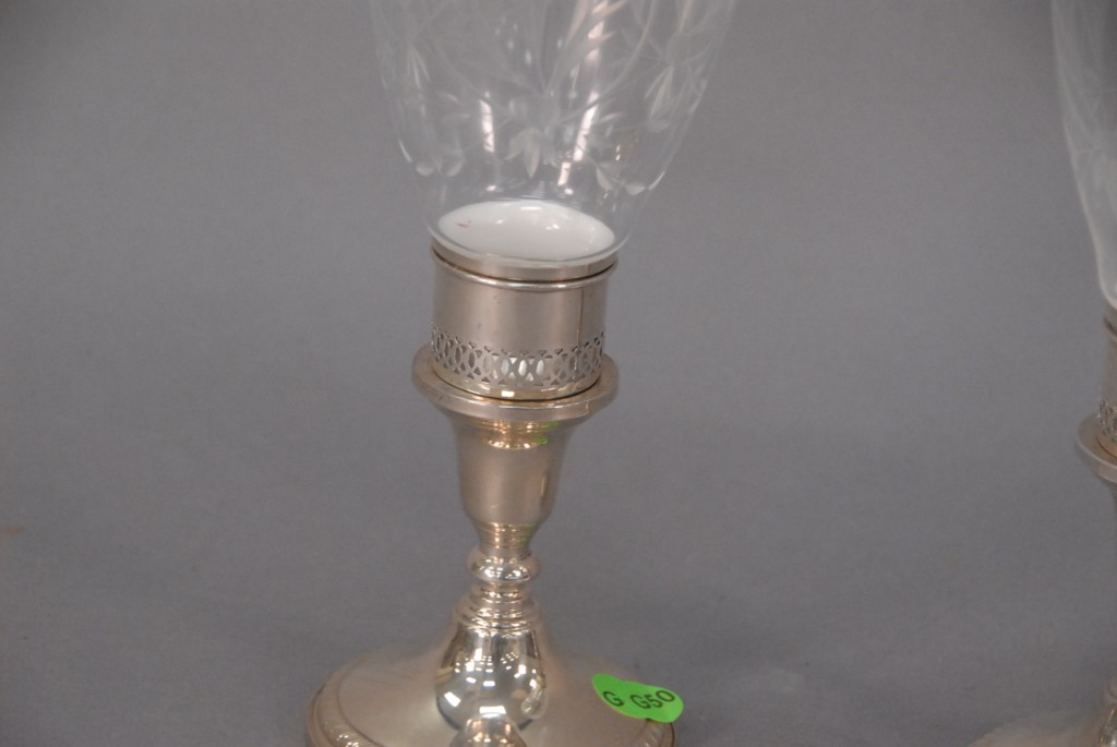 Pair of short sterling silver candle holders with crystal shades, ht. 13.