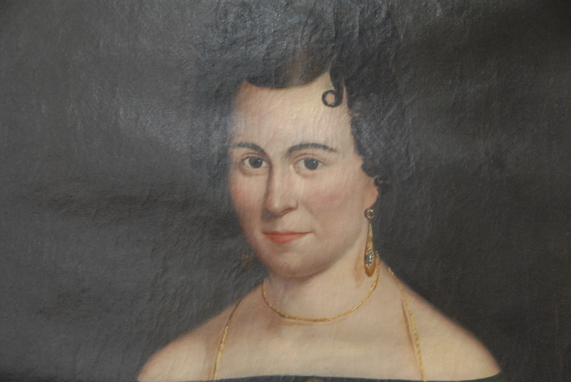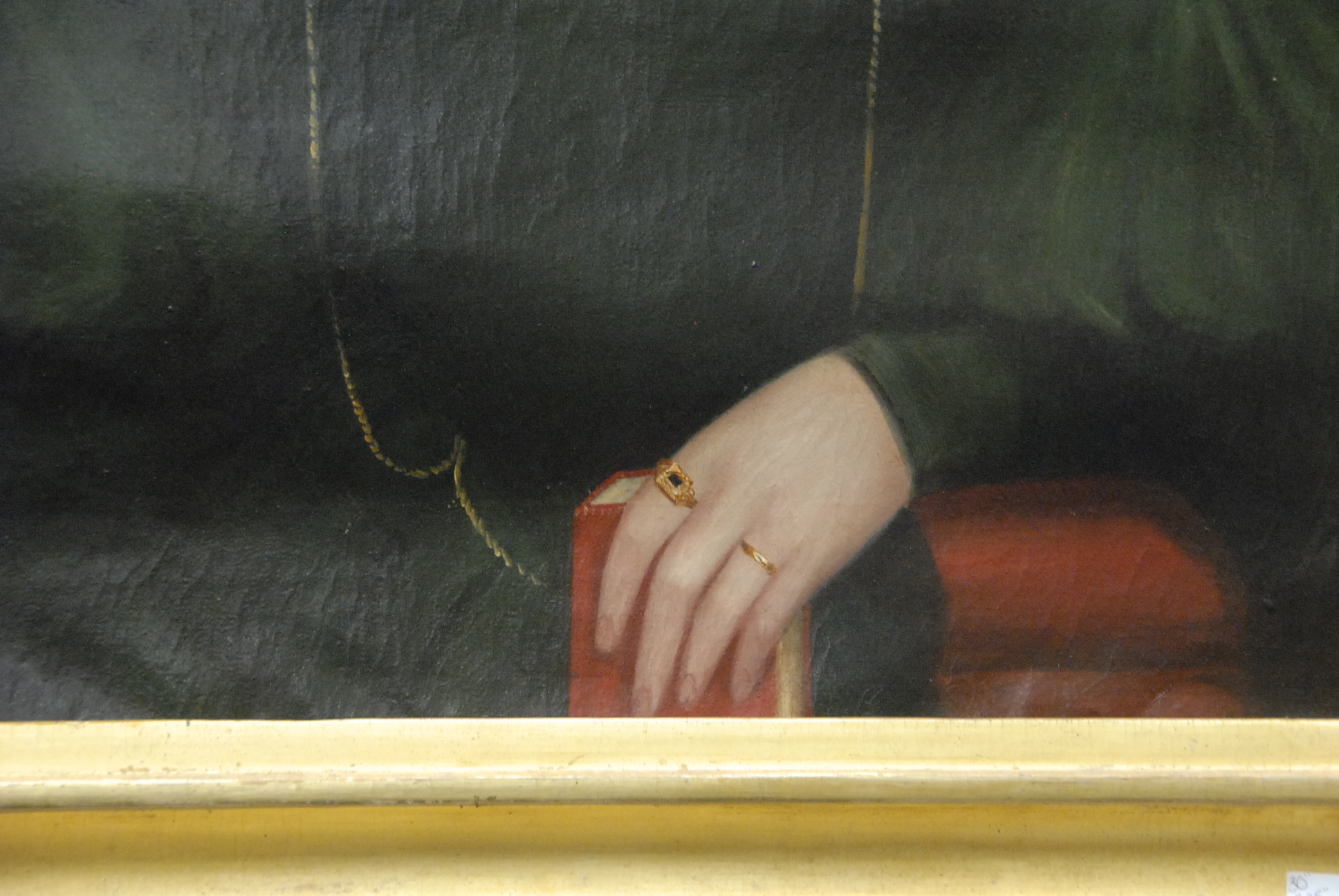 Lot 327: Primitive PORTRAIT OF A WOMAN with book in hand oil on canvas original gilt frame. 30 x 25