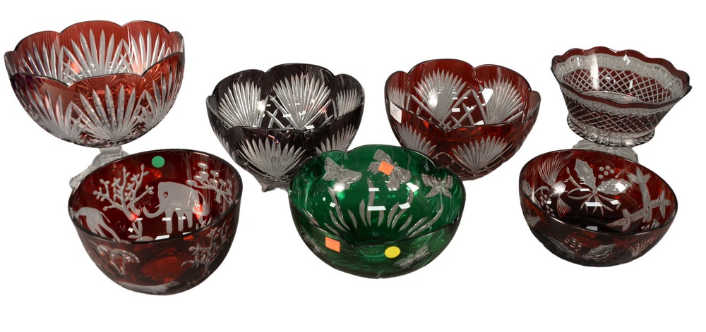 Lot 327: Seven Piece Color Cut to Clear Glass Group, to include five cranberry cut to clear, one having animals; one green cut to clear; alon…
