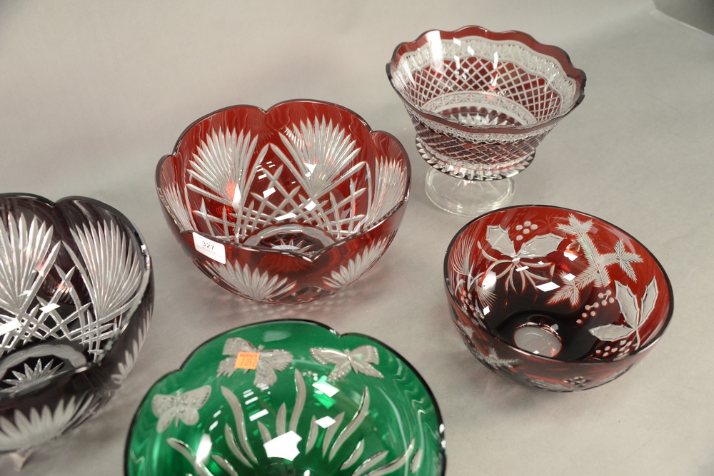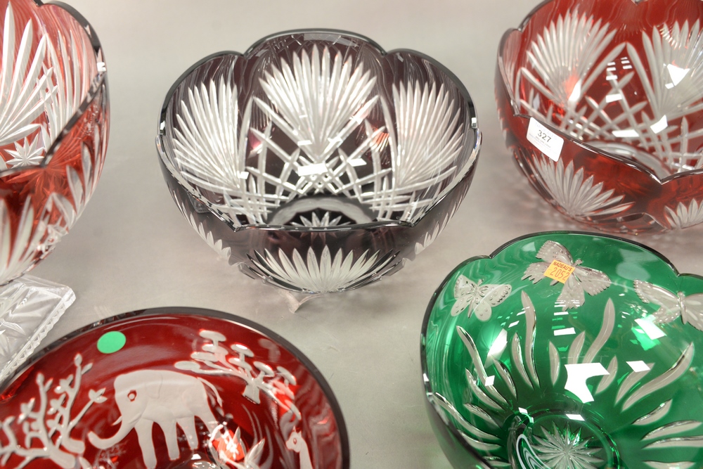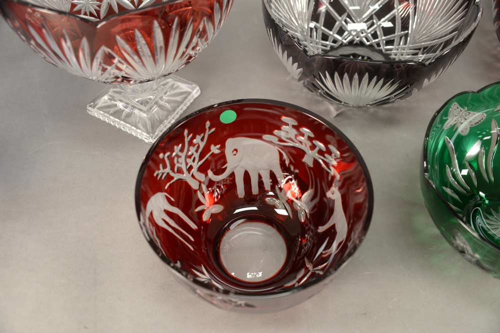 Lot 327: Seven Piece Color Cut to Clear Glass Group, to include five cranberry cut to clear, one having animals; one green cut to clear; alon…