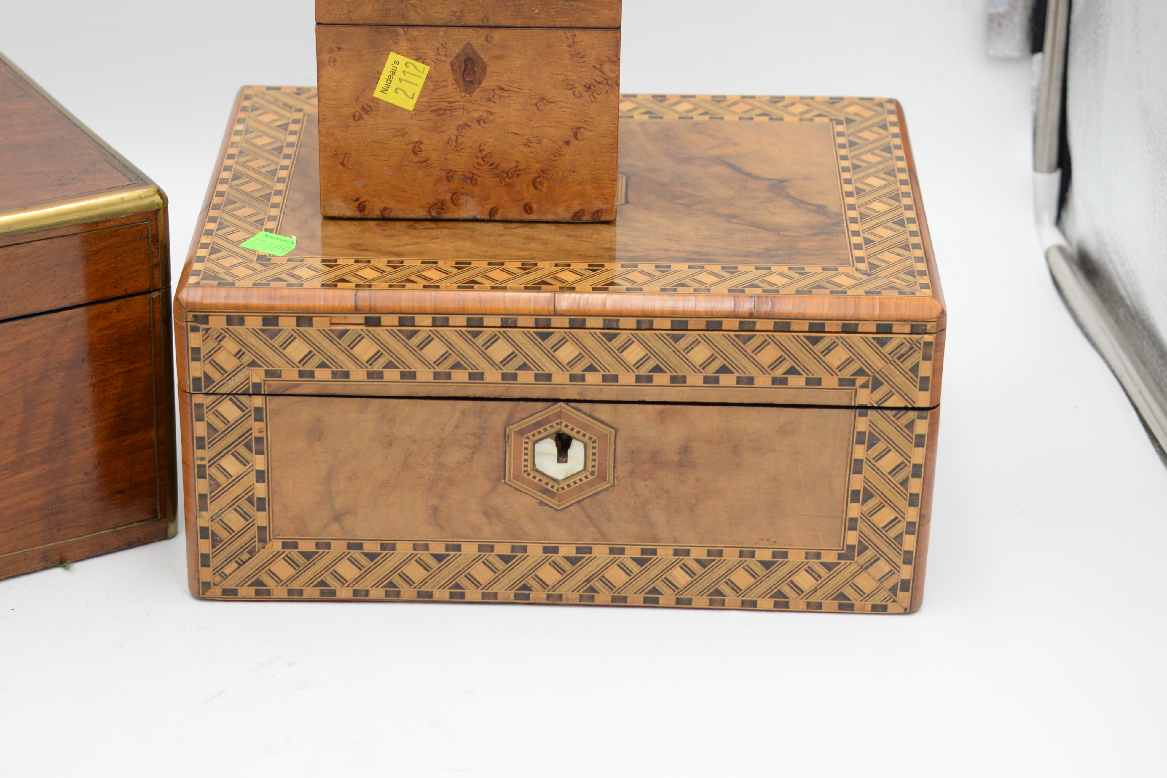 Three Boxes To Include, parquetry inlaid lift top humidor, height 5 1/2 inches, 12×9, brass bound lap desk and burl tea box