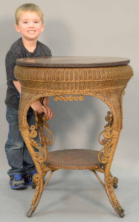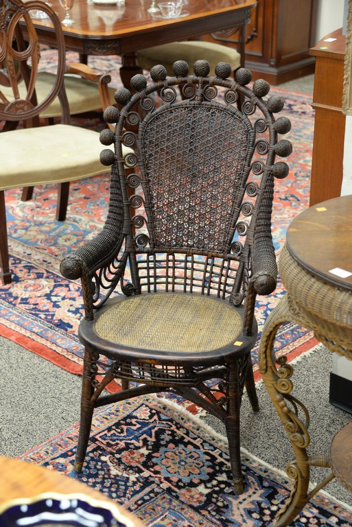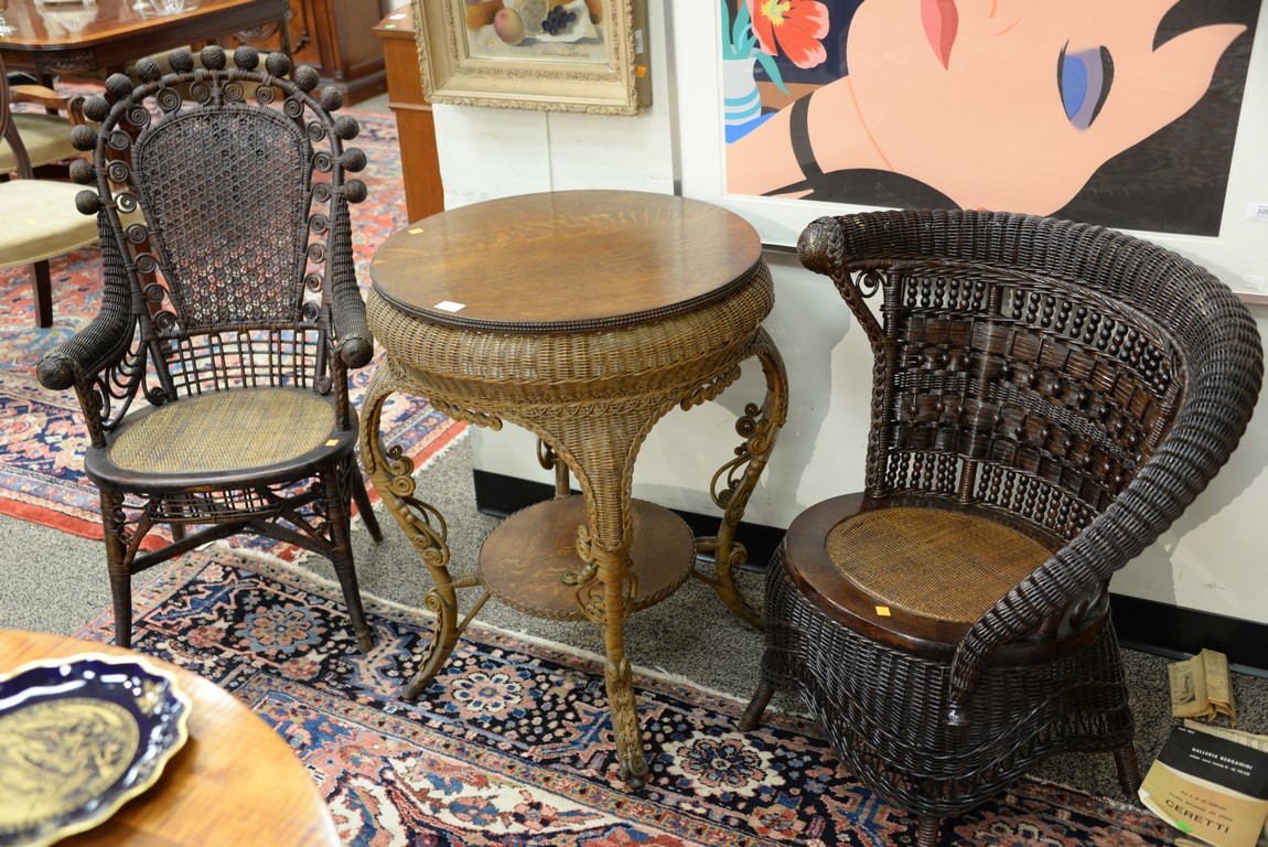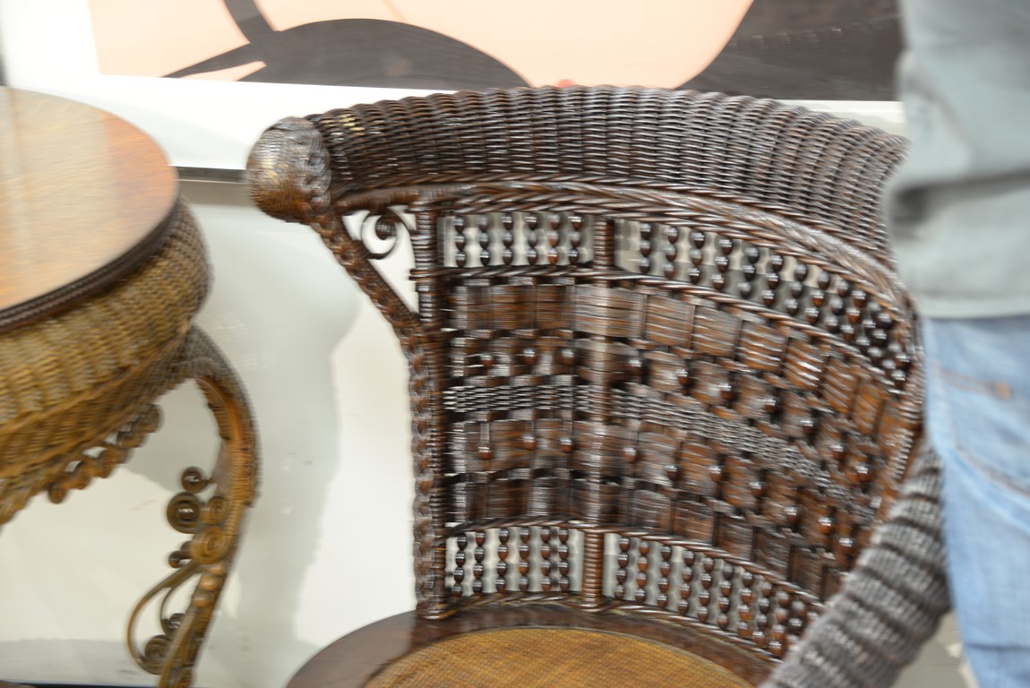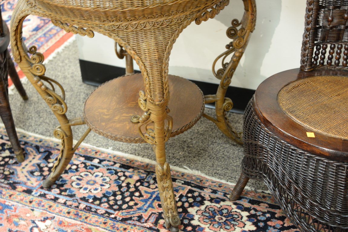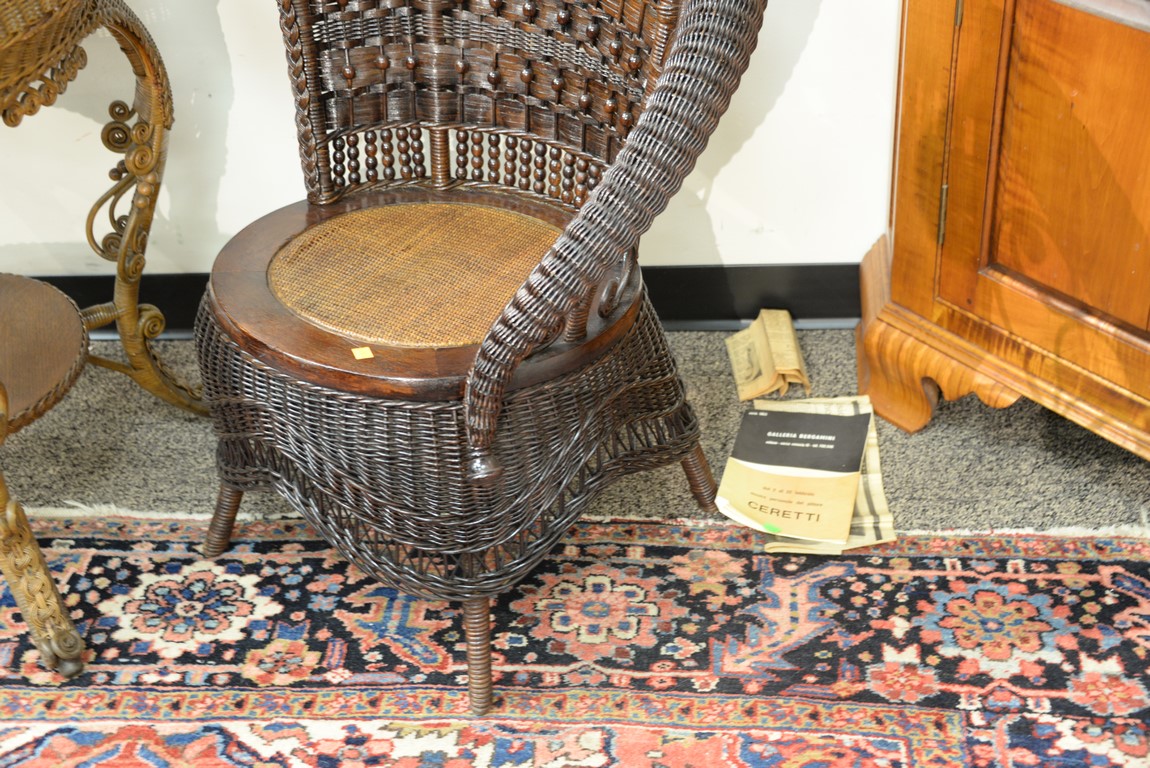 Three piece lot to include a lolly pop Victorian wicker chair and a wicker corner chair. dia. 23 3/4in.
