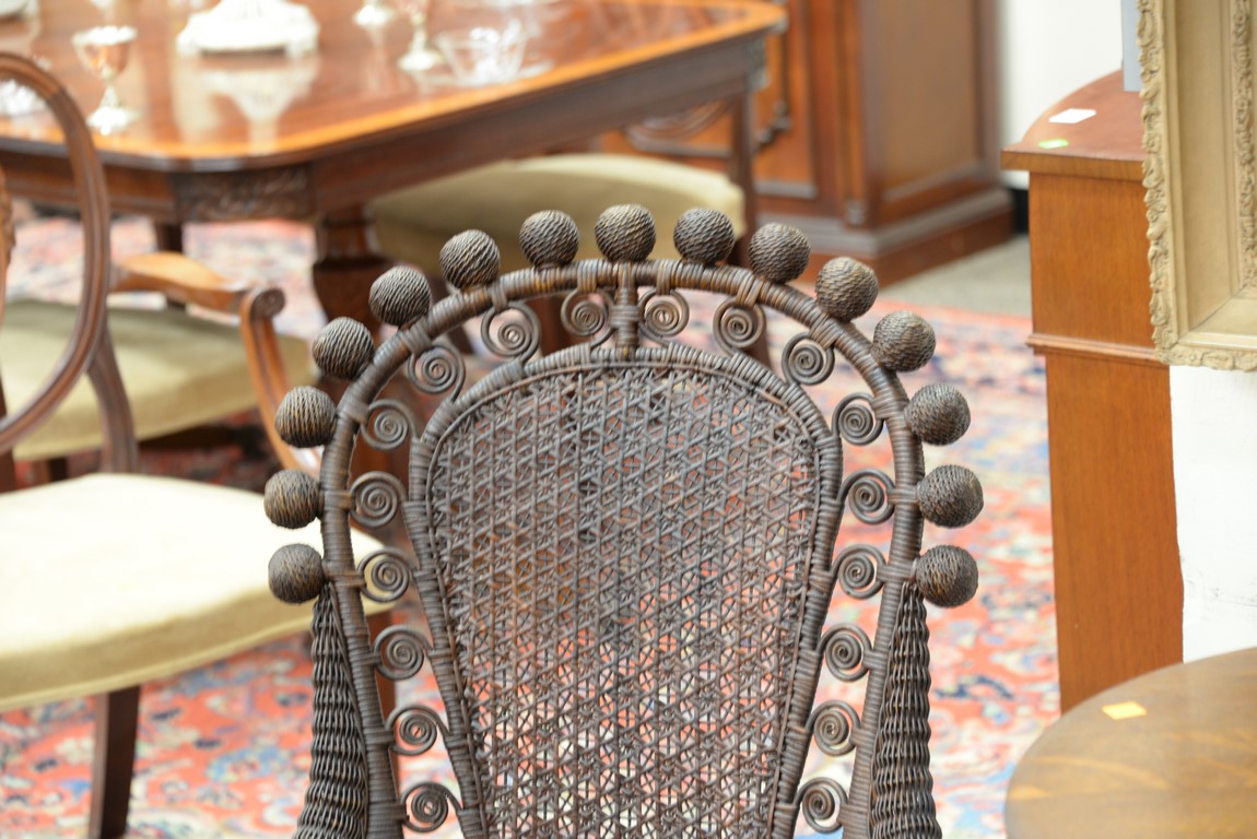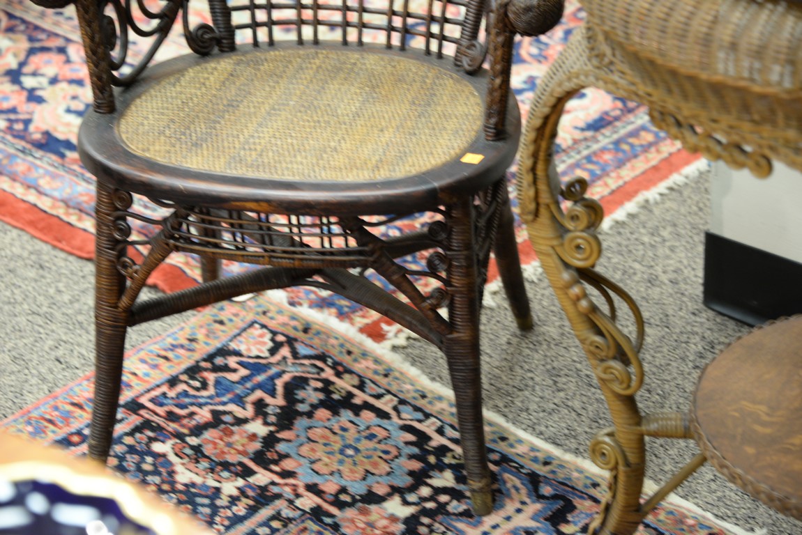 Lot 327: Three piece lot to include a lolly pop Victorian wicker chair and a wicker corner chair