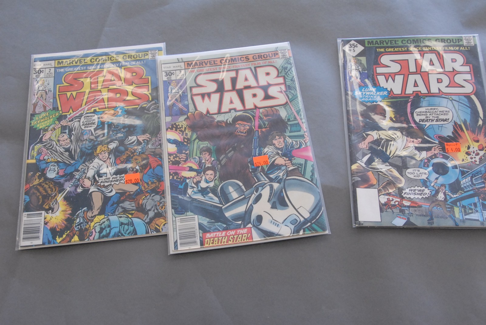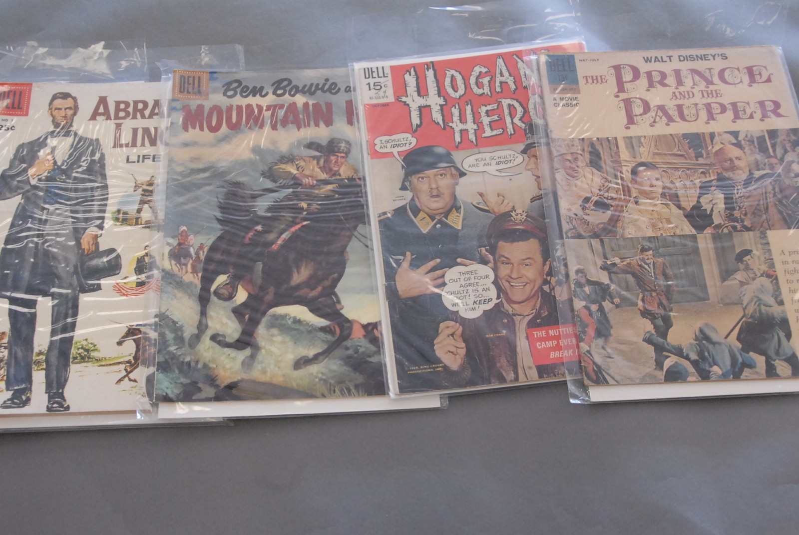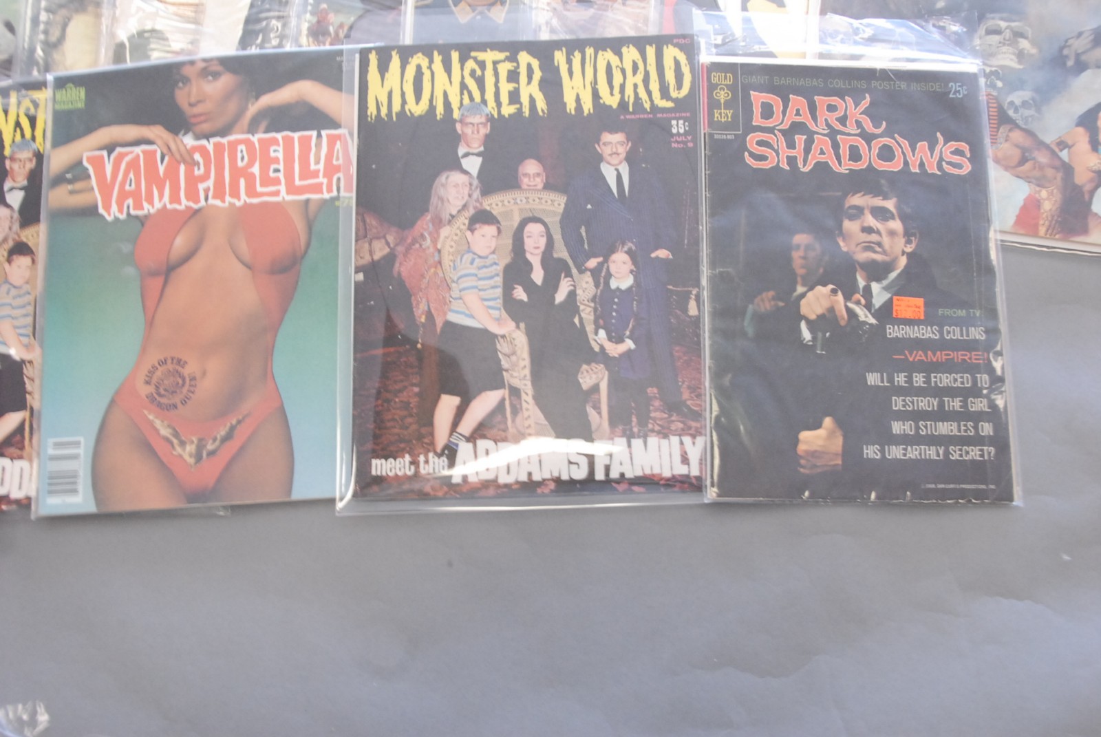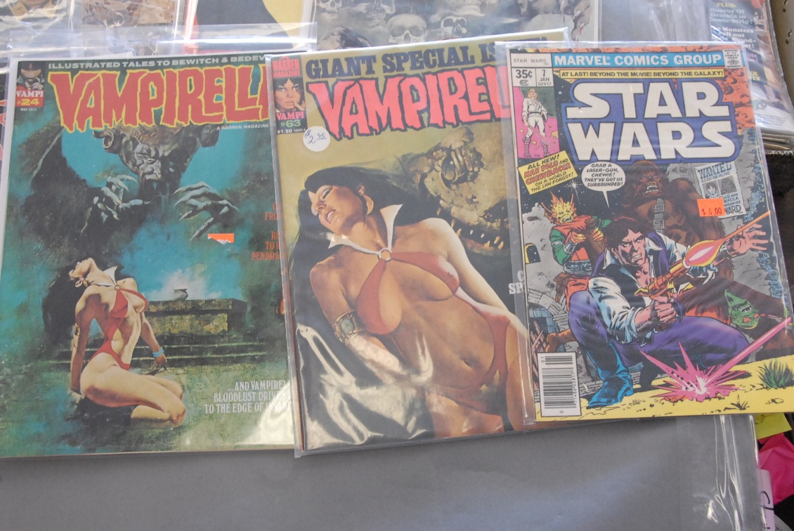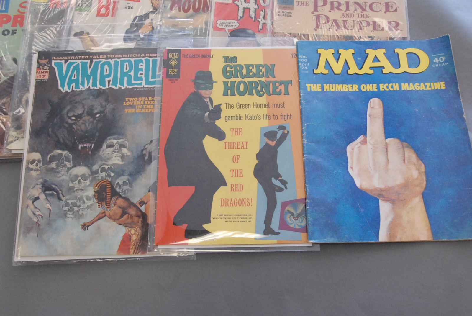 Box lot of twenty comic books including The Green Hornet, Vamperella, Monster World, Star Wars, Hogan’s Heroes, Mountain Men, and more