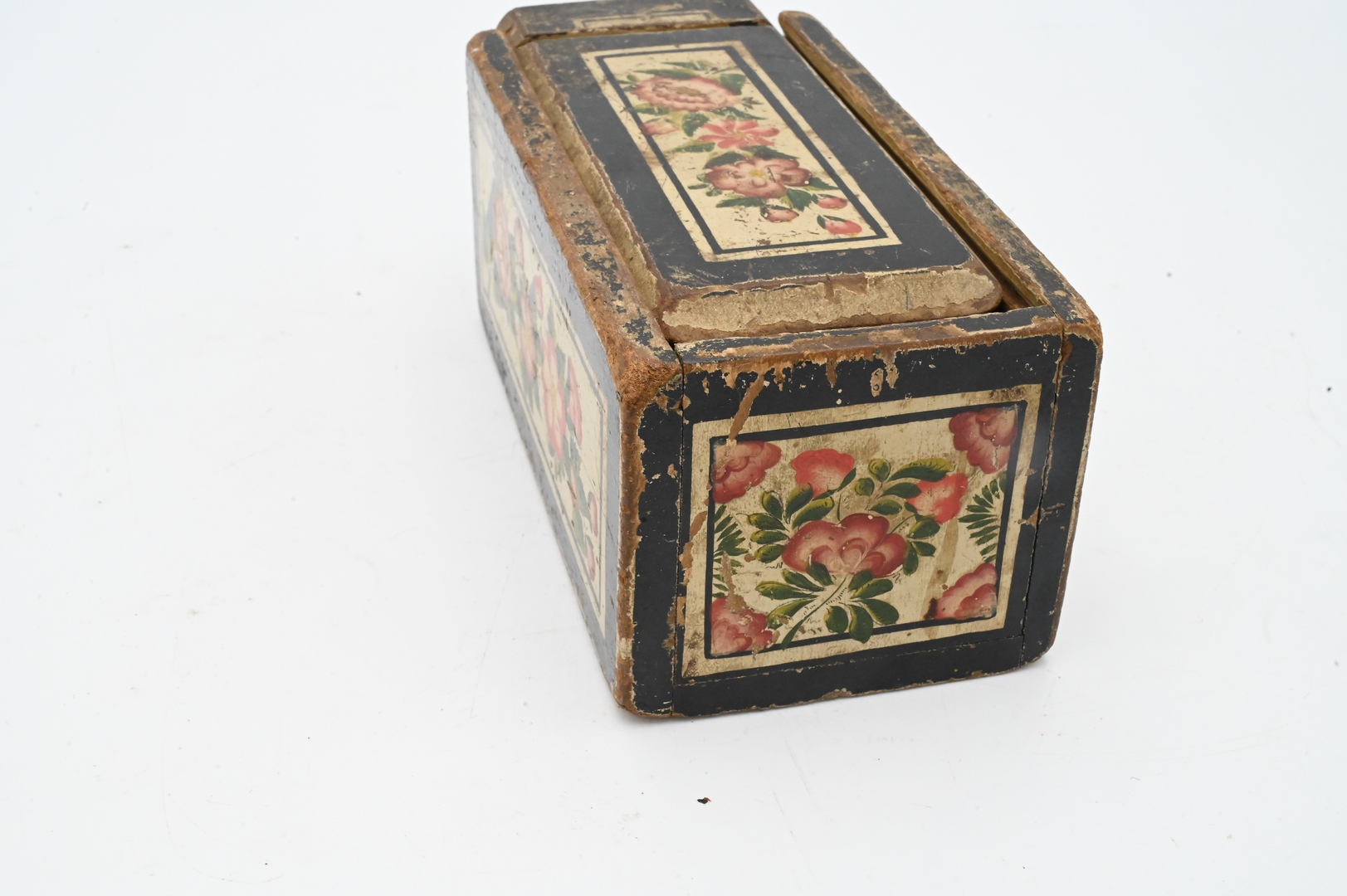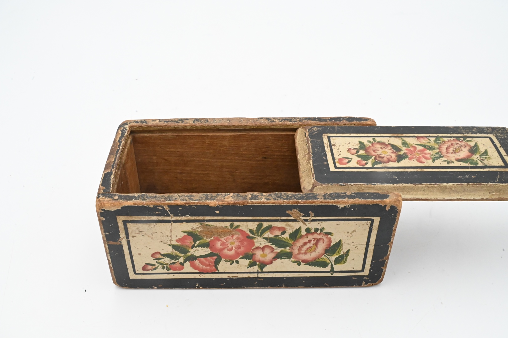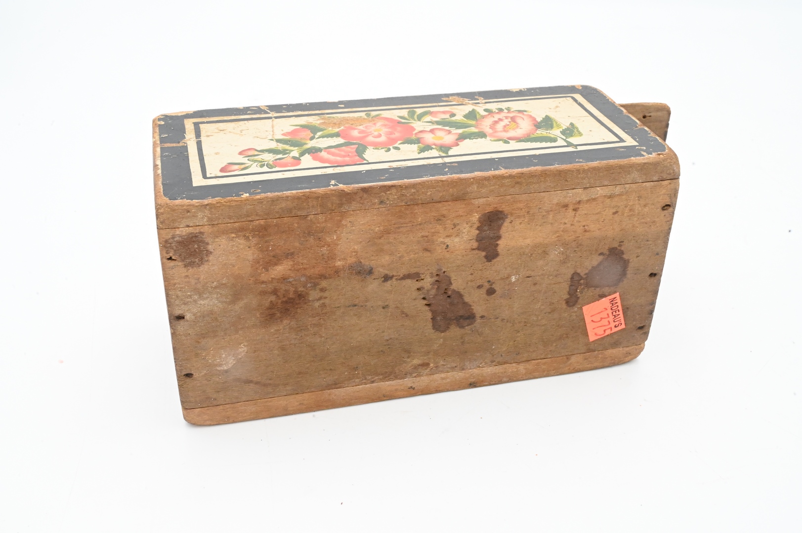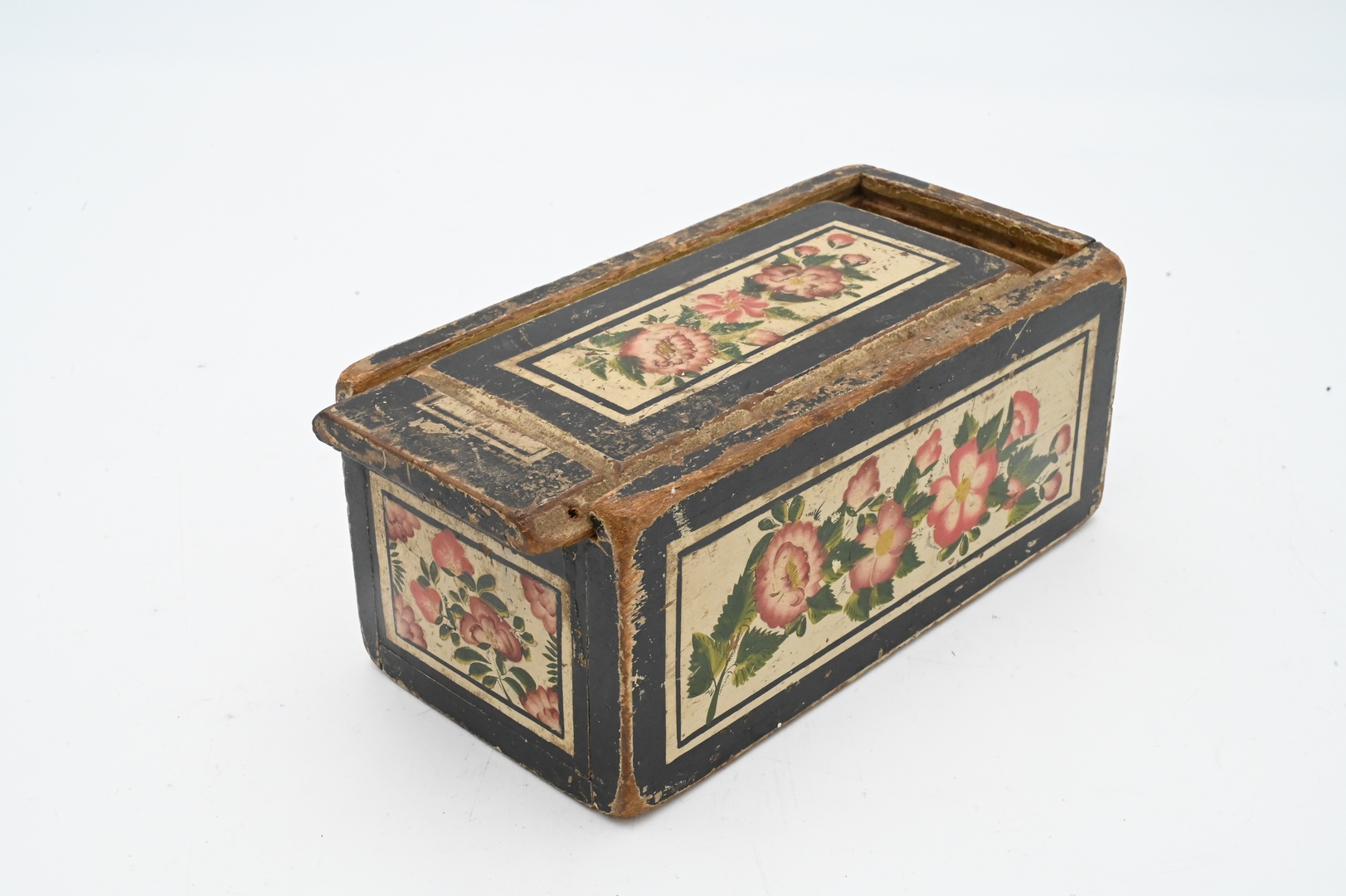 Candle Box, having slide cover, hand painted with flowers and dark borders, graphite inscription undercover, 18th/early 19th century, height 3 3/8 inches, top 4″ x 8″, Provenance: Estate of Cyril H. Moore Jr, Kent, Connecticut.
