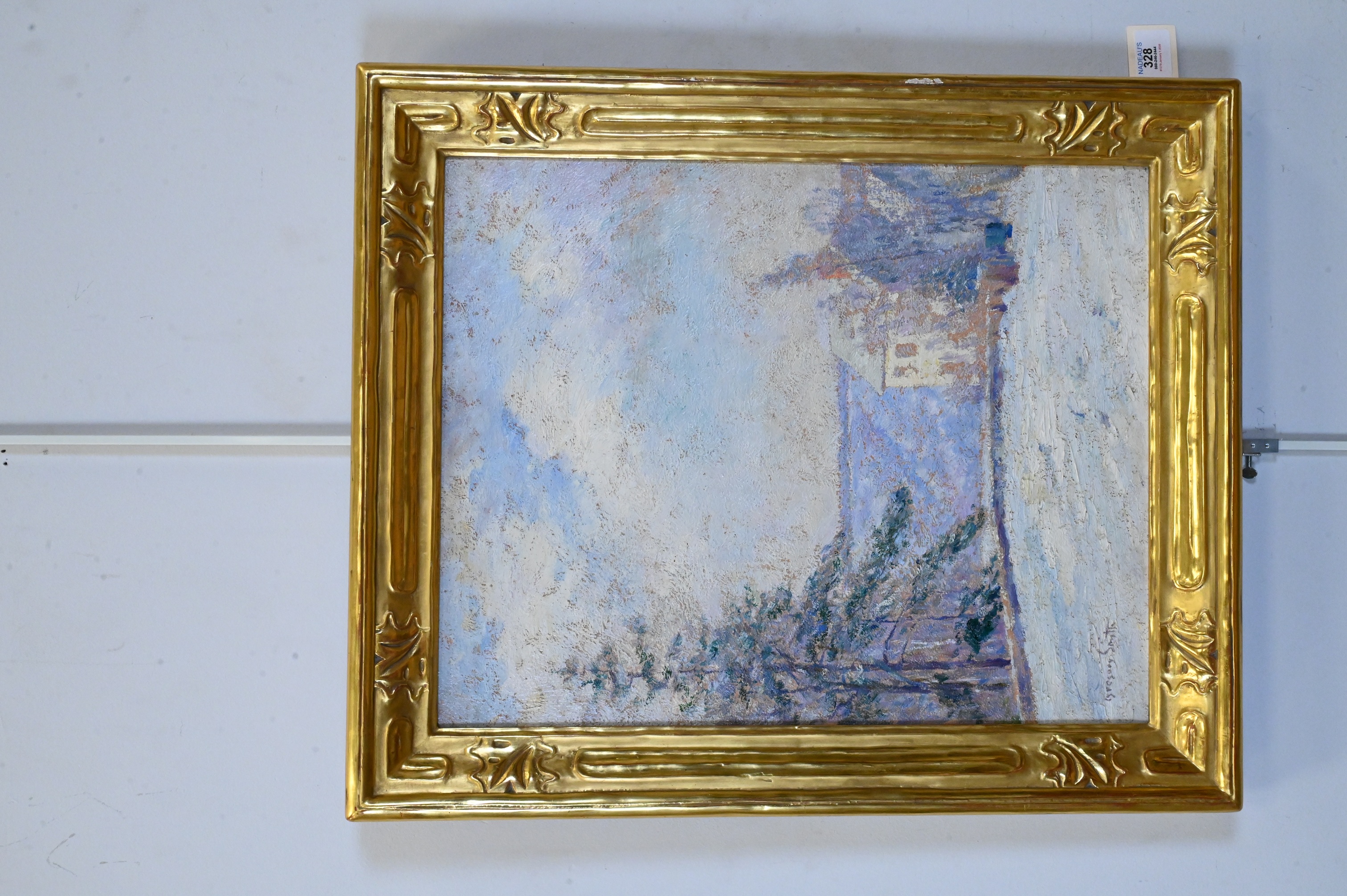 Oil on board, presented in American Arts and Crafts gilt frame by Wunderlich Bros., Indianapolis
