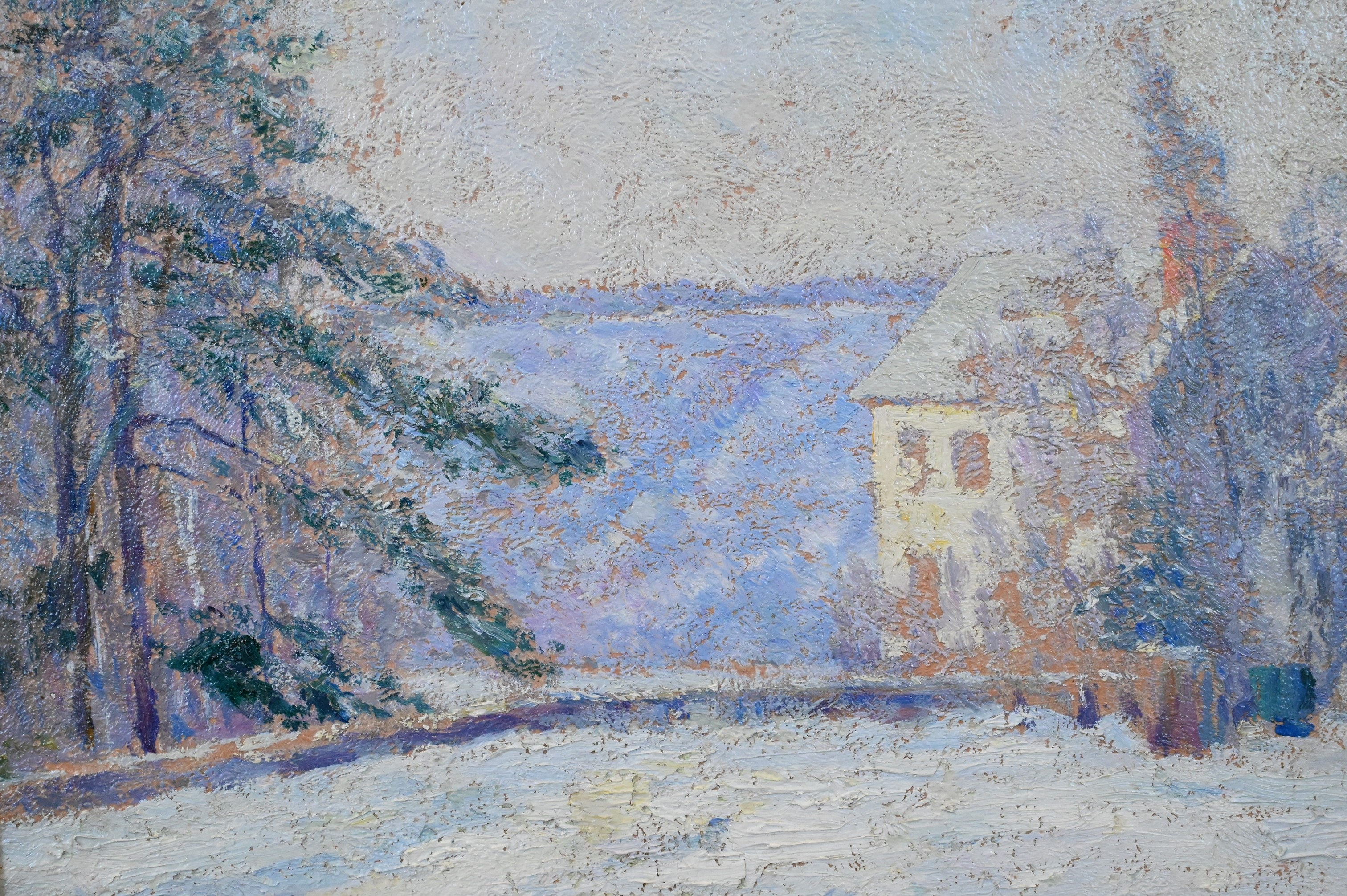 impressionist winter landscape depicting a hillside home overlooking a broad, snow-covered valley, Smith’s characteristic palette of soft violets, icy blues, and pale golds lends an atmospheric luminosity to the sky and distant hills, while thick impasto strokes describe frosted trees and drifts of fresh snow