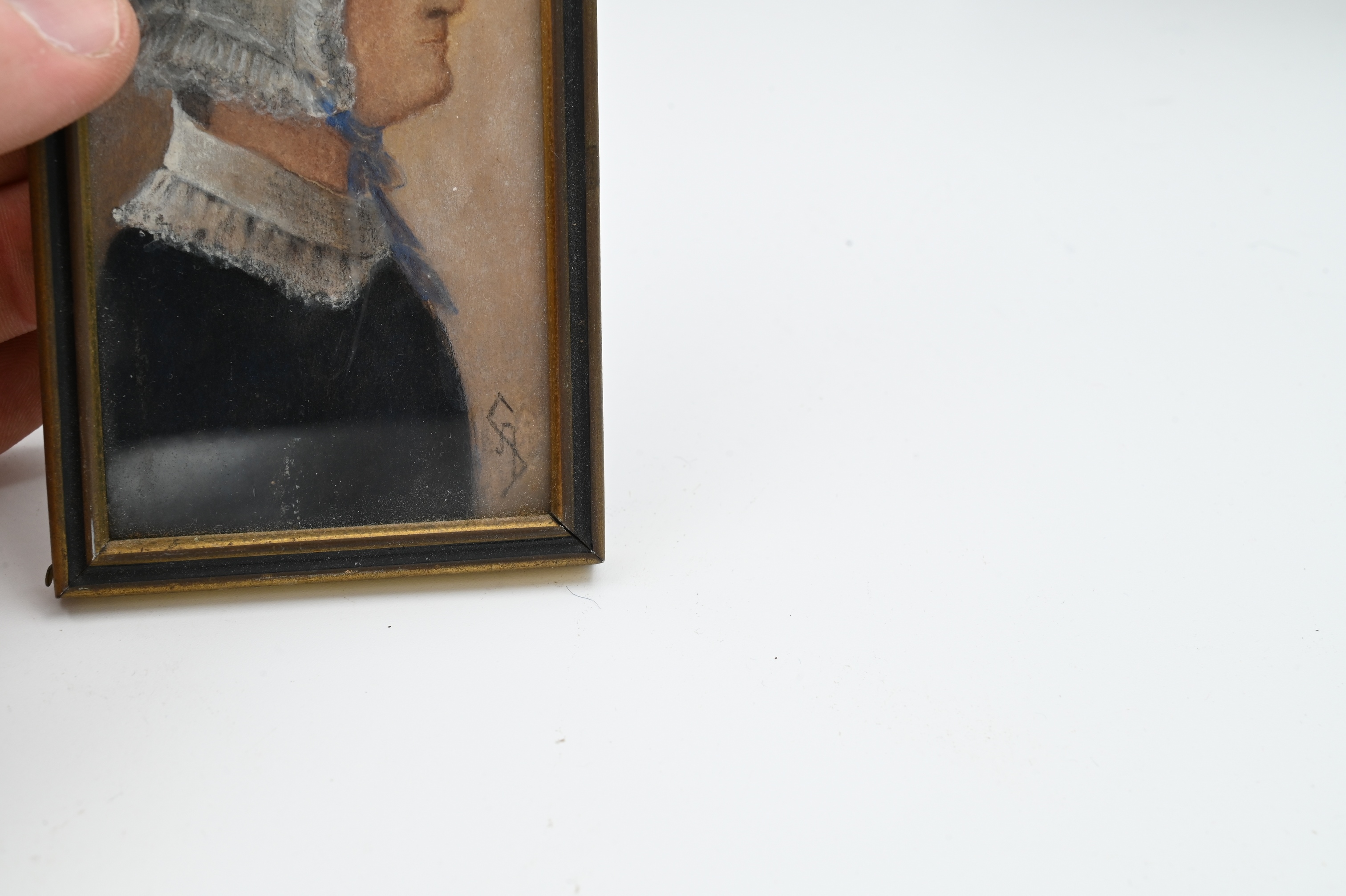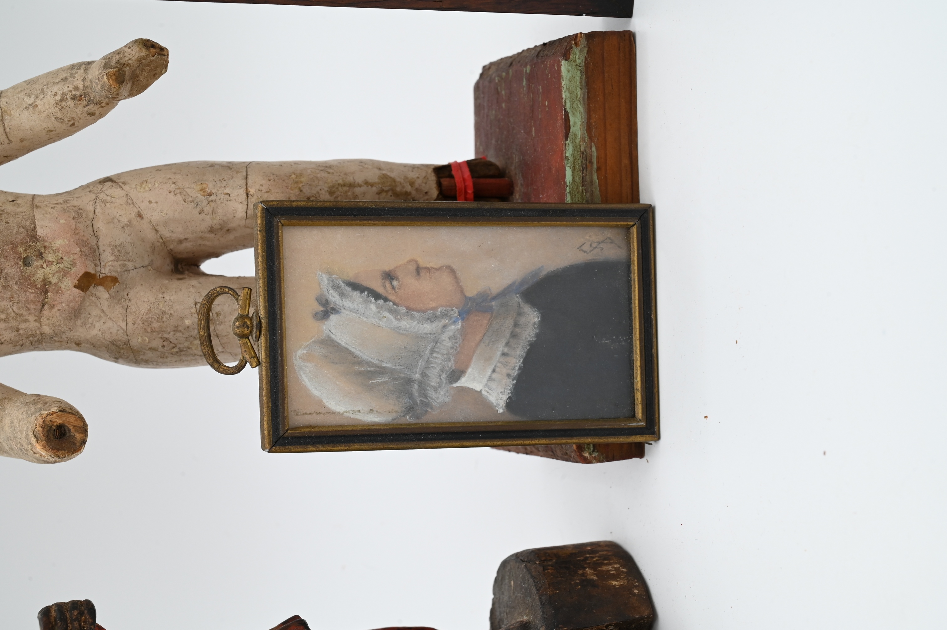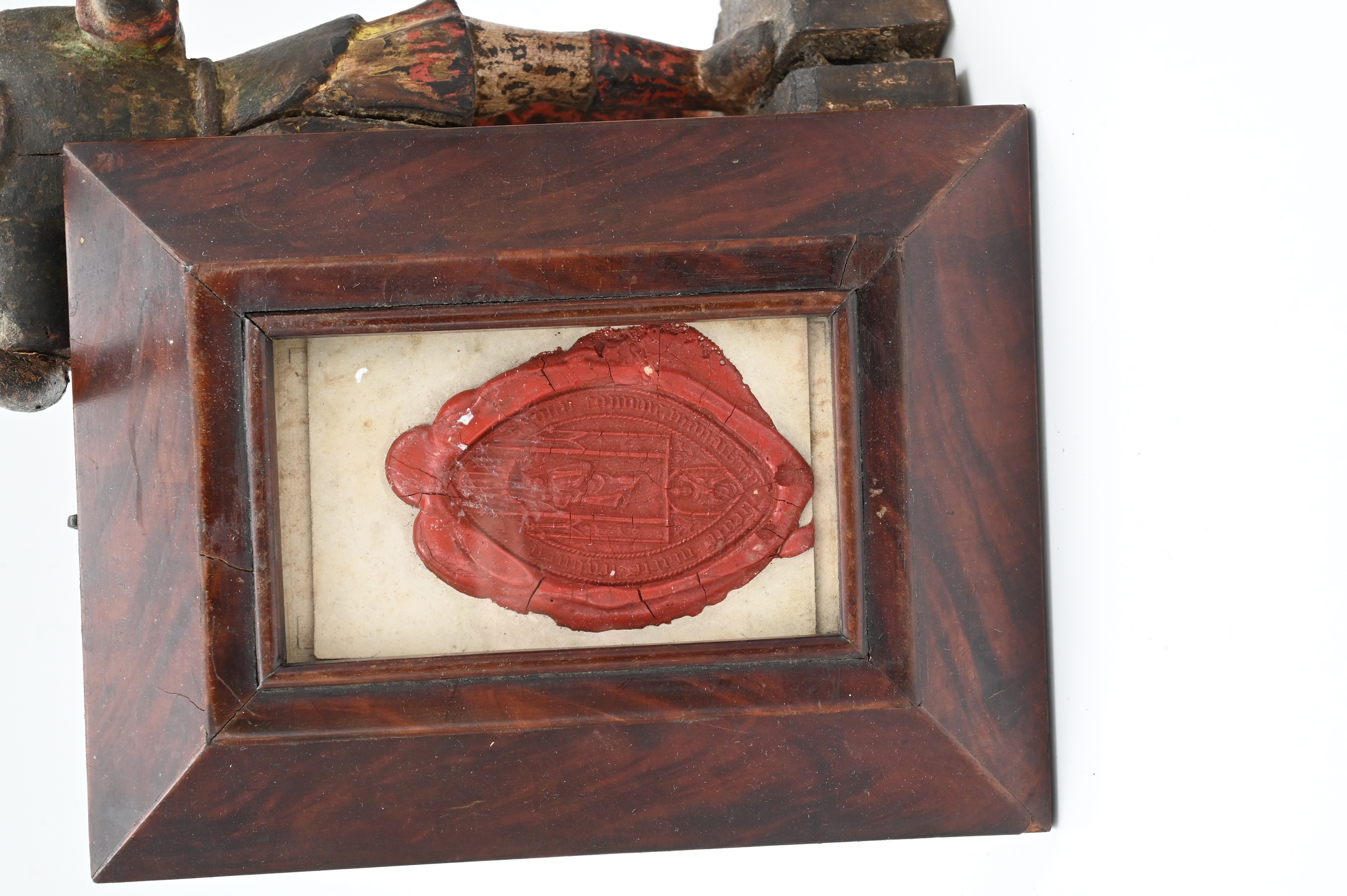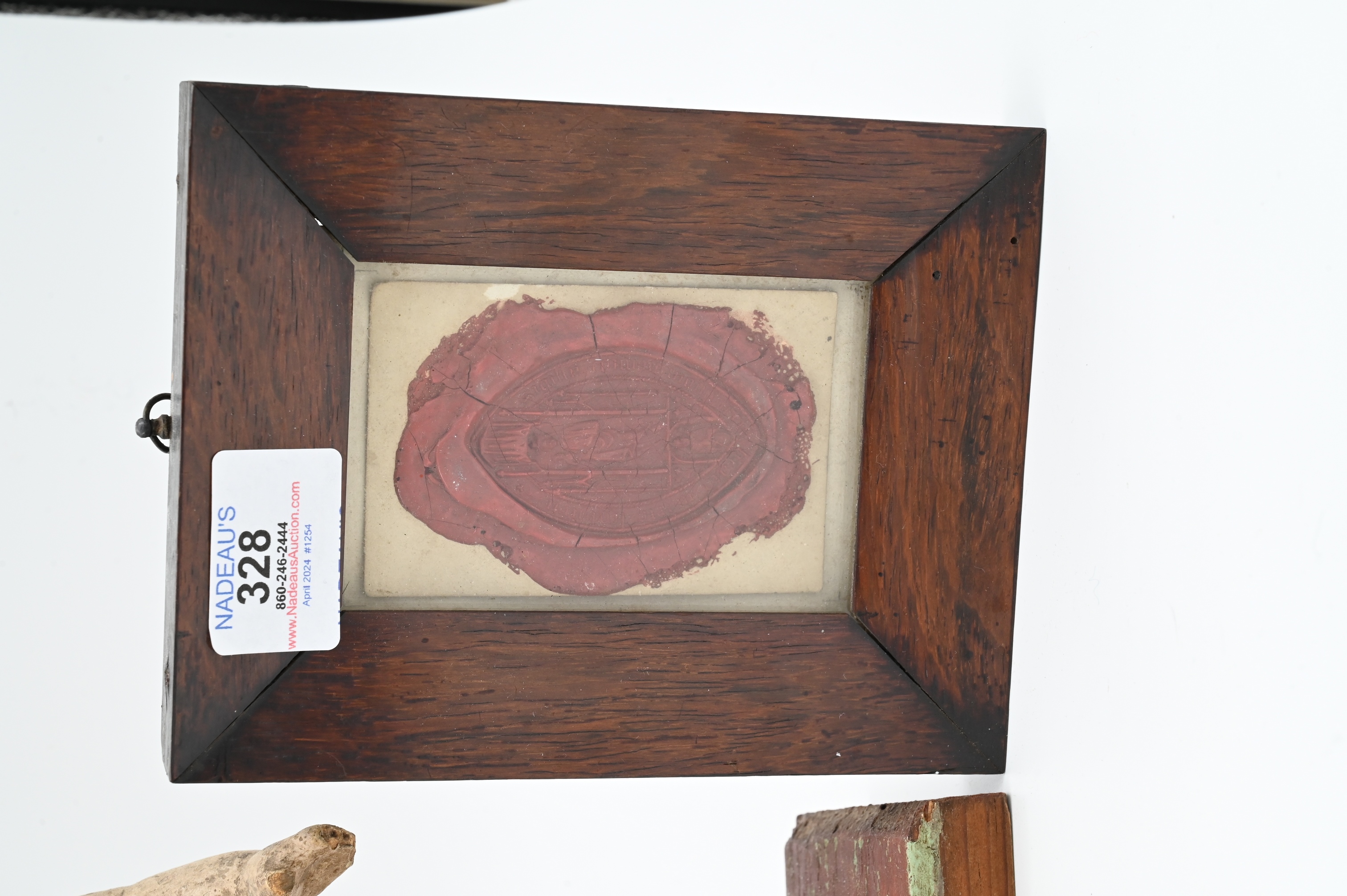 pair of early wax Monastic Vesica seals having Madonna and Child beneath an arch with robed religious figure below bordered in Latin inscription each wax seal impression framed, along with a primitive miniature watercolor on canvas of a woman in a bonnet