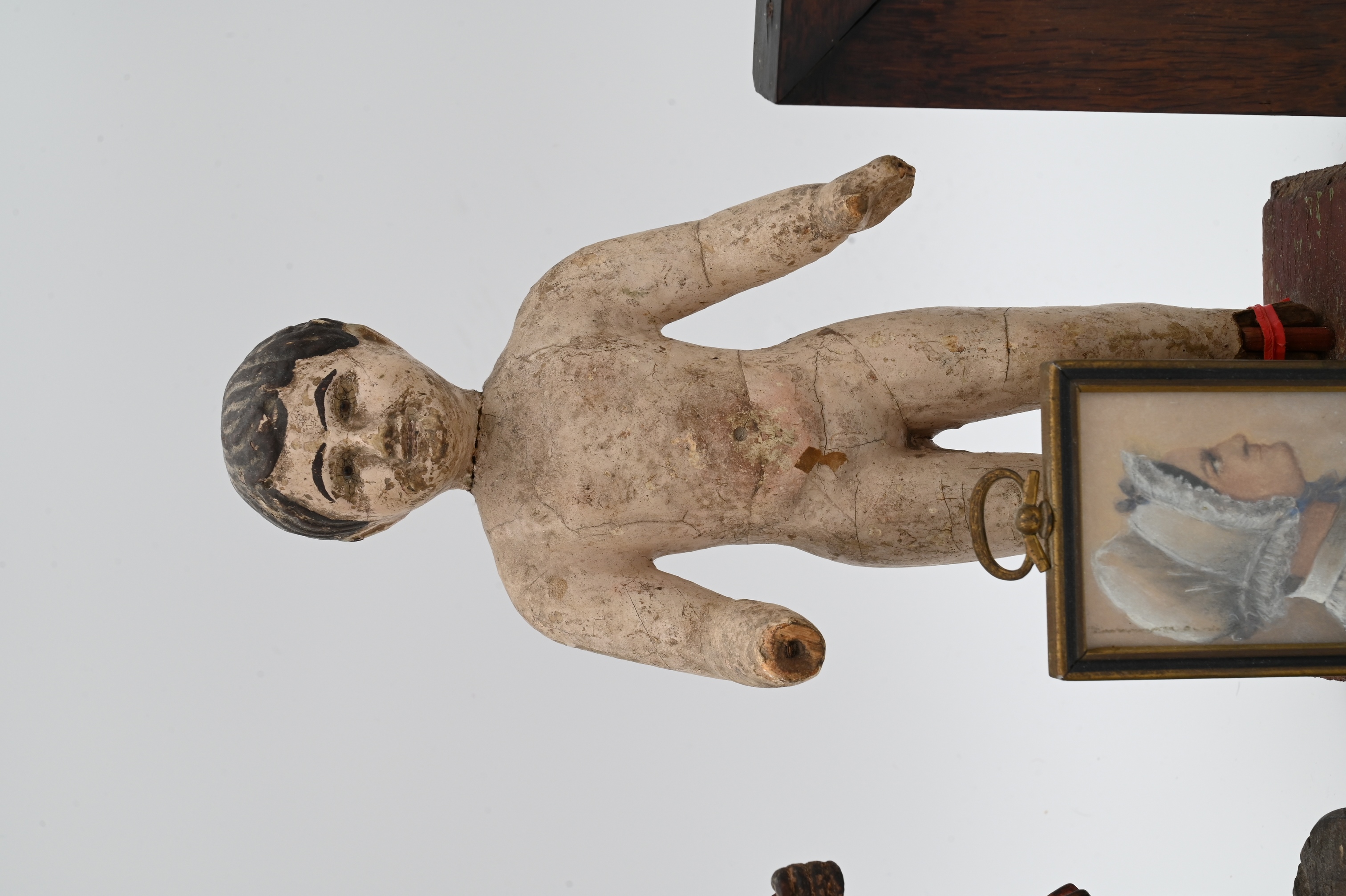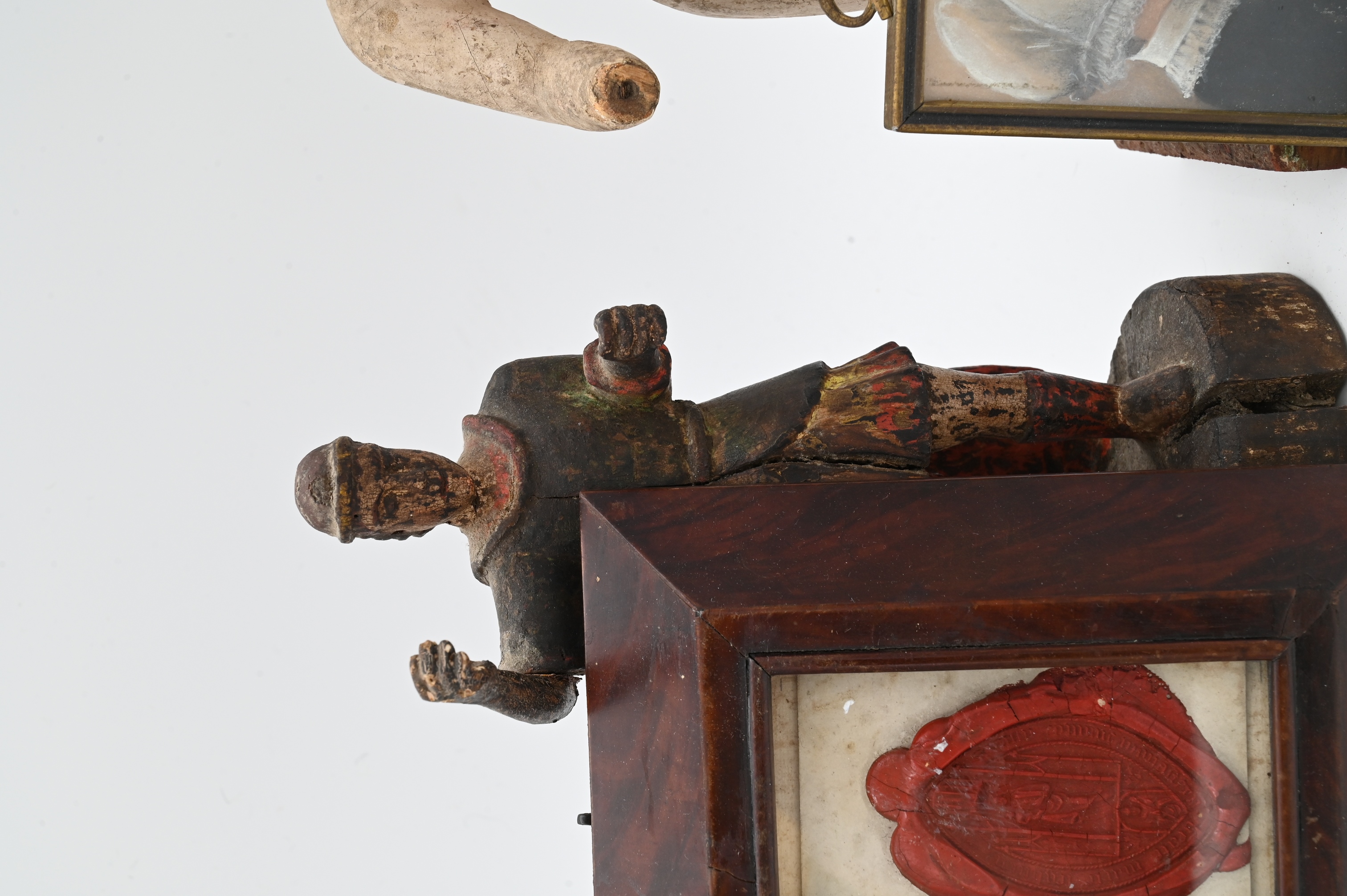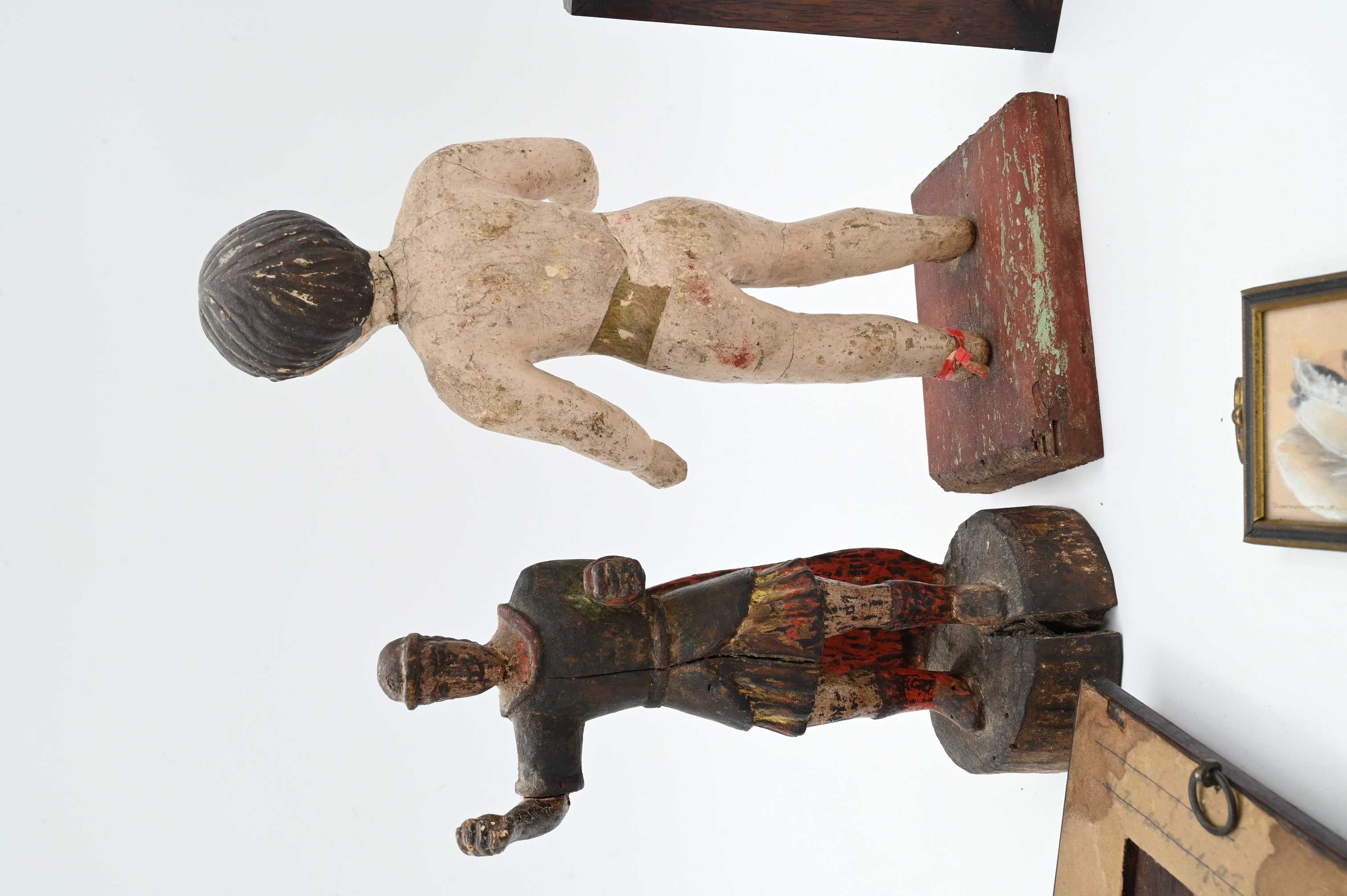 to include two early polychrome carved wood figures one figure having arms raised possibly to wield a sword, painted in red, blue, and yellow height 9 inches