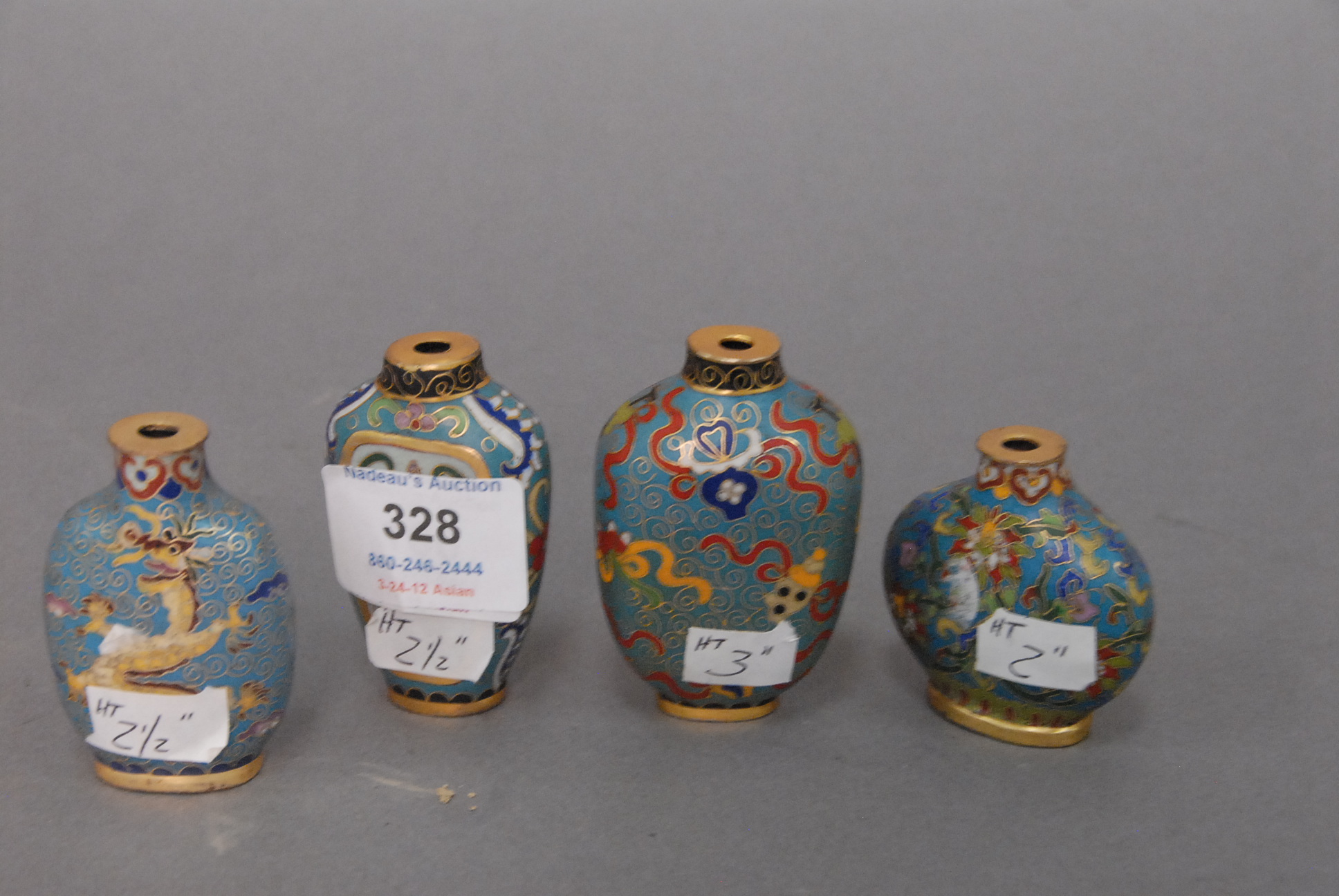 Lot 328: Group of four cloisonn snuff bottles two with character marks on the bottom, hts. 2in. – 3in.