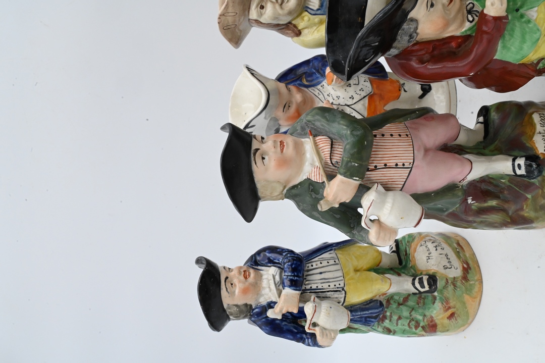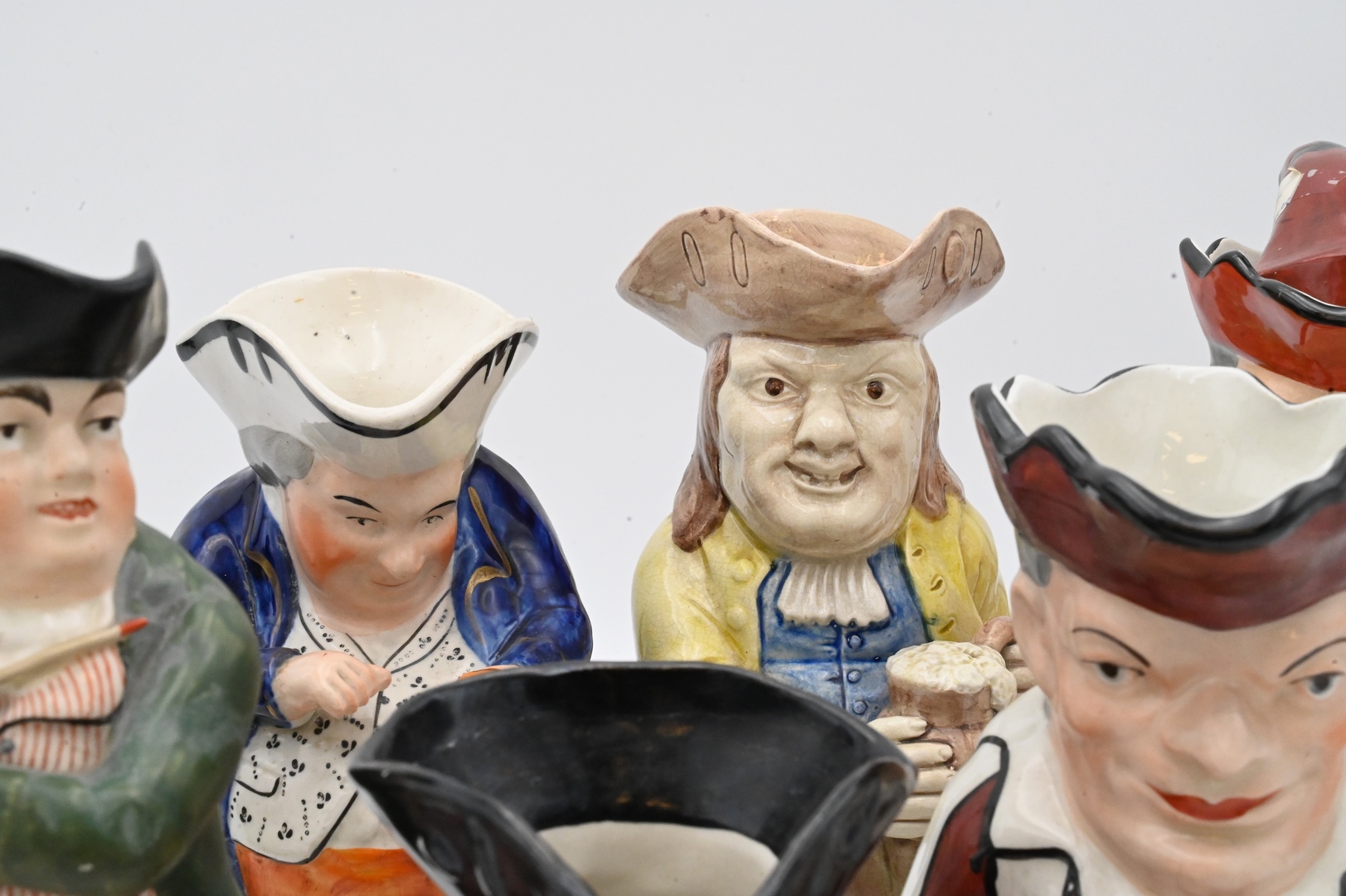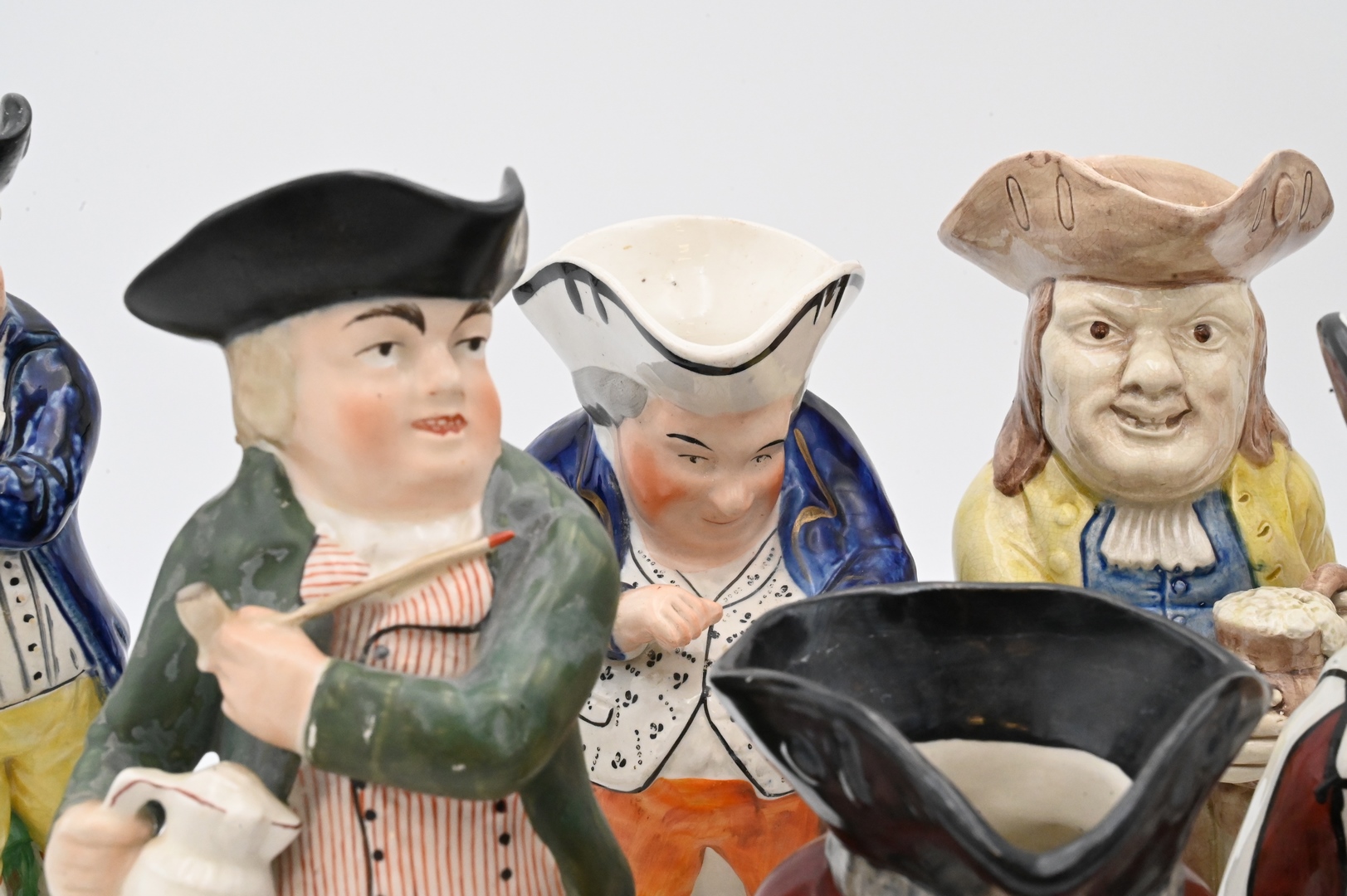 Group of Toby Jugs, to include a Pearlware Toby jug; a Ralph Wood, depicting a seated figure holding a beer, height 9 3/4 inches; three Staffordshire Toby jugs, to include jester with hat, Hearty Good Fellow along with Snuff Tanker, tallest 11 1/2 inches; along with three Staffordshire Toby Jugs, jester, Hearty Good Fellow, and Snuff Tanker, tallest 11 1/4 inches.
