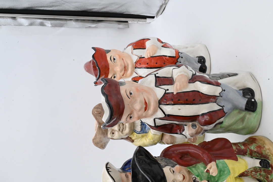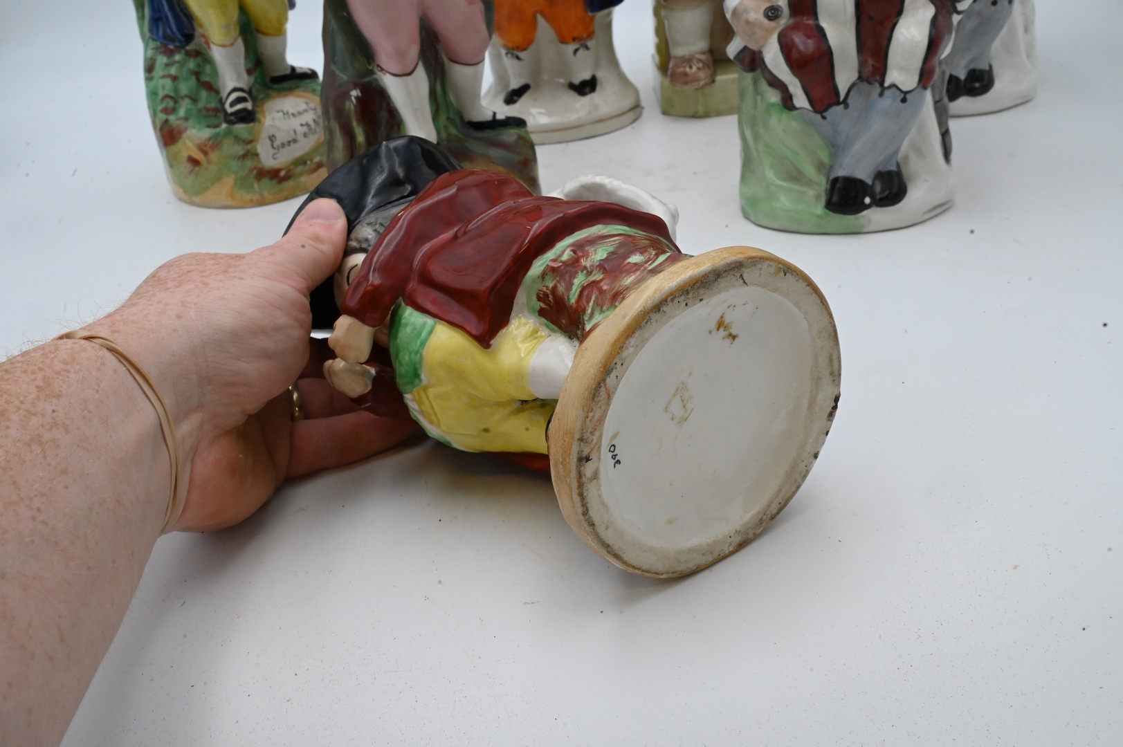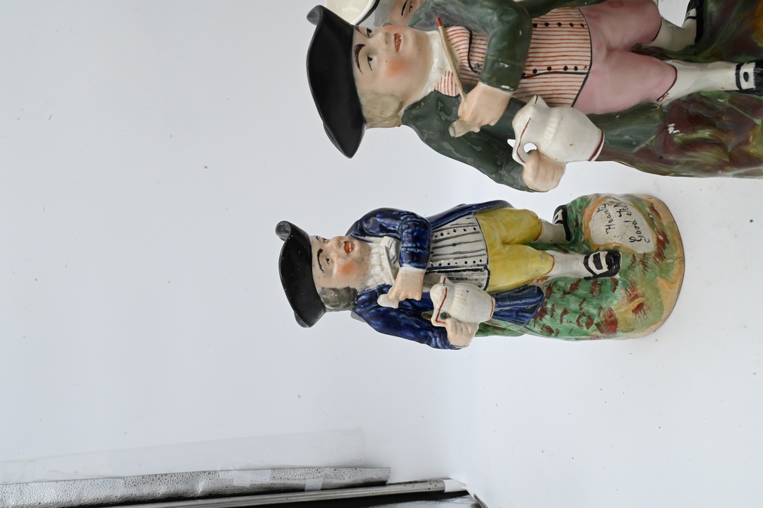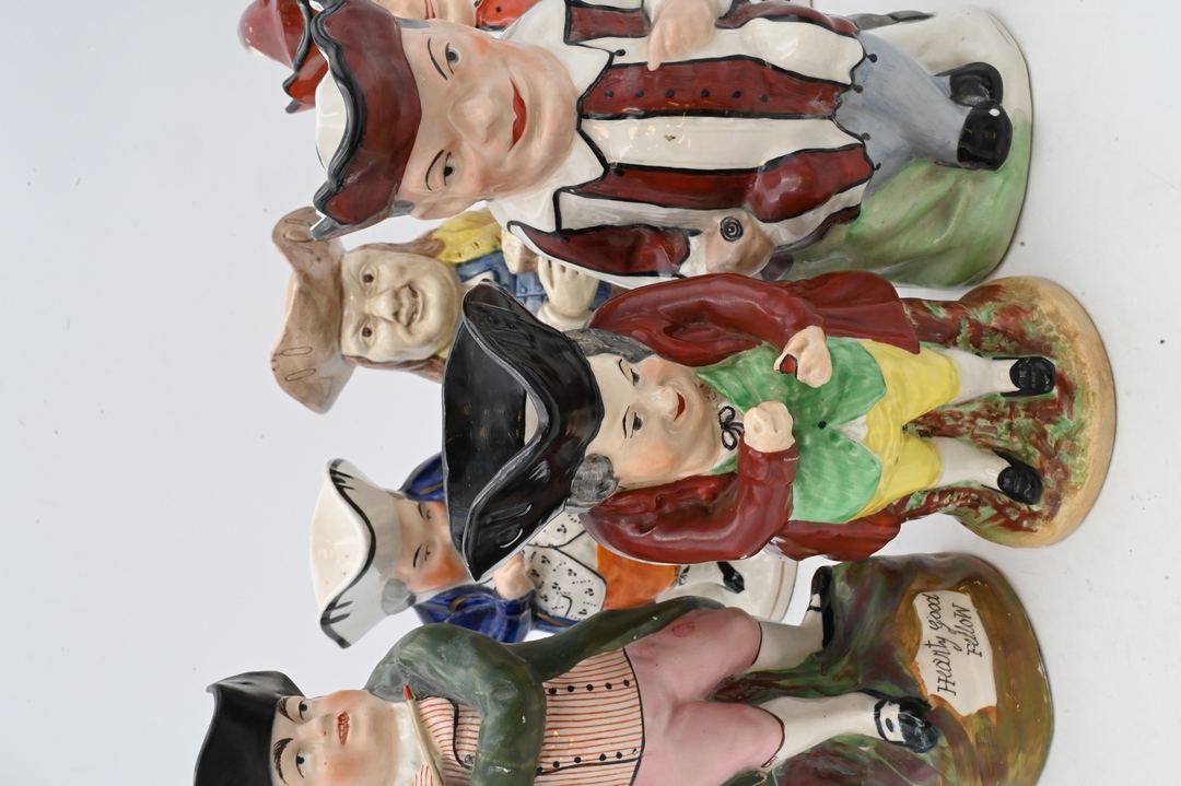 Group of Toby Jugs, to include a Pearlware Toby jug; a Ralph Wood, depicting a seated figure holding a beer, height 9 3/4 inches; three Staffordshire Toby jugs, to include jester with hat, Hearty Good Fellow along with Snuff Tanker, tallest 11 1/2 inches; along with three Staffordshire Toby Jugs, jester, Hearty Good Fellow, and Snuff Tanker, tallest 11 1/4 inches.
