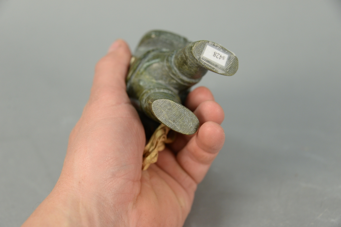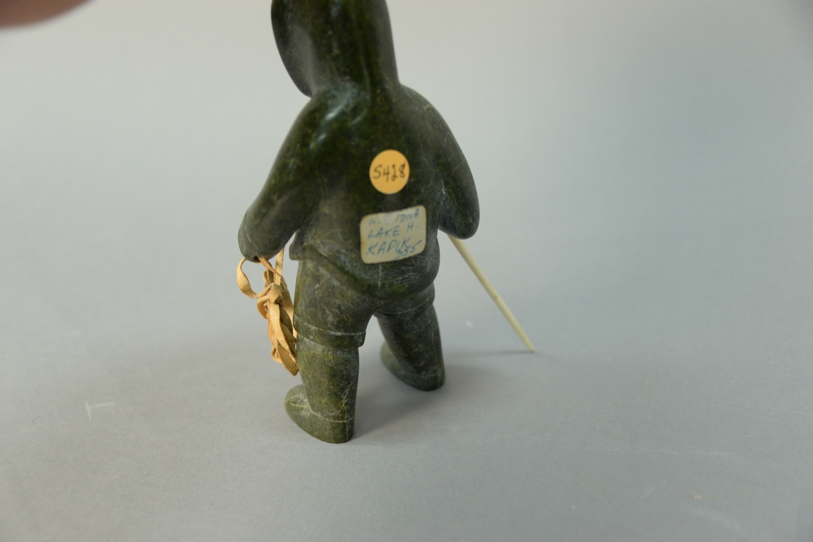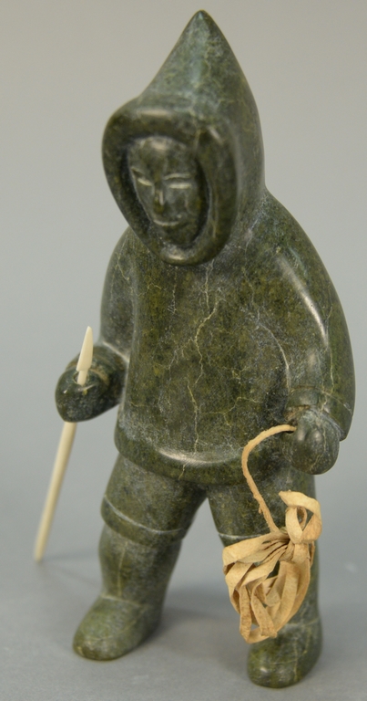 Lot 328: Inuit Eskimo carving Kapik Kolola 1926-1985 Kimmirut Lake Harbor dark green serpentine/hide Hunter with Spear.