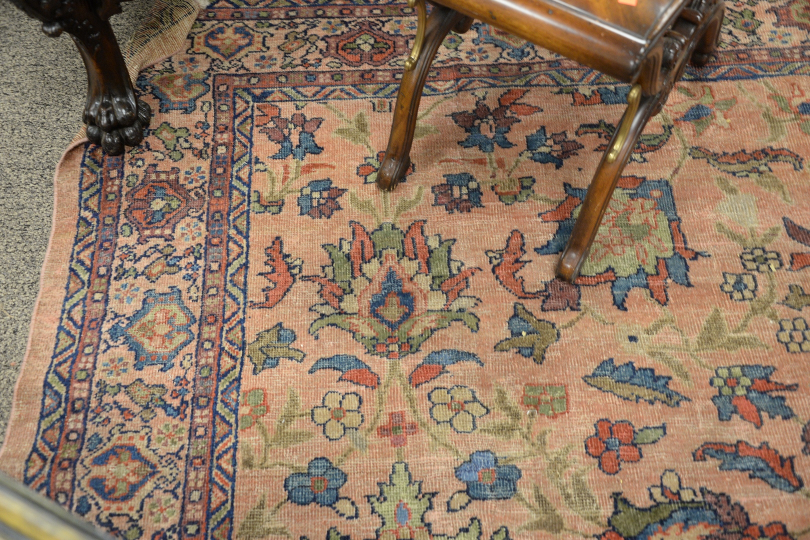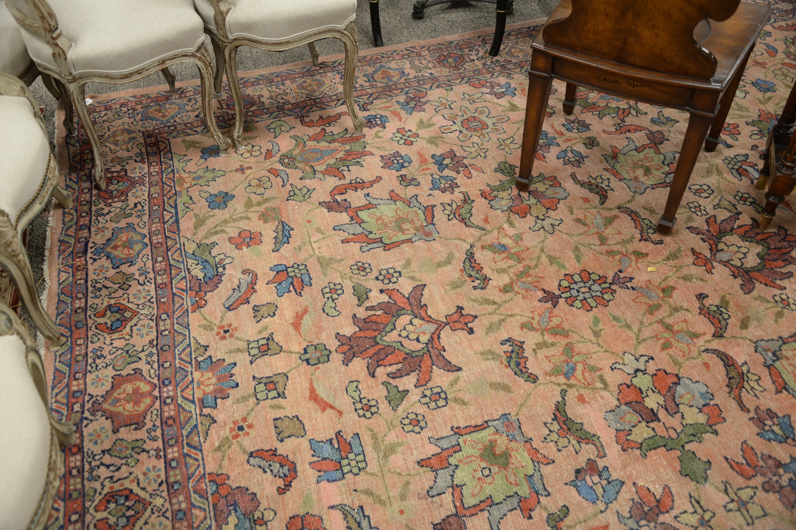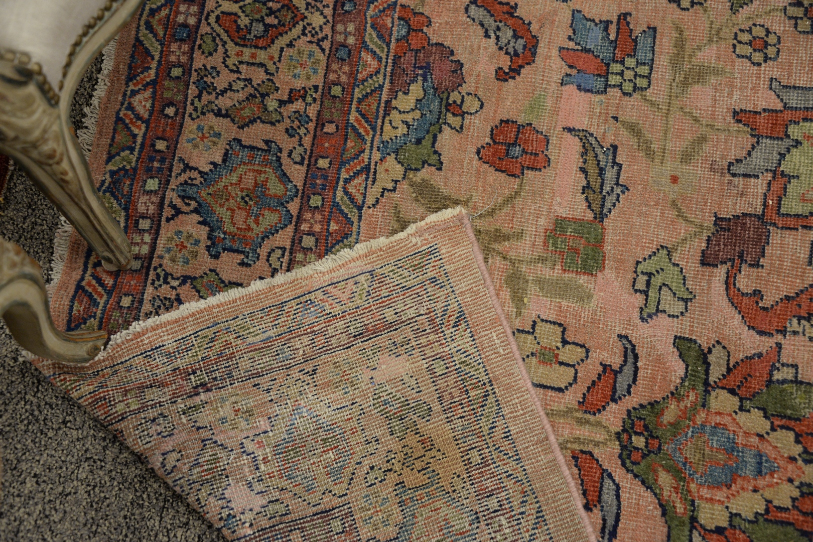 Mahal Oriental Rug, having all over design, 8′ 8 x 11′, with wear.