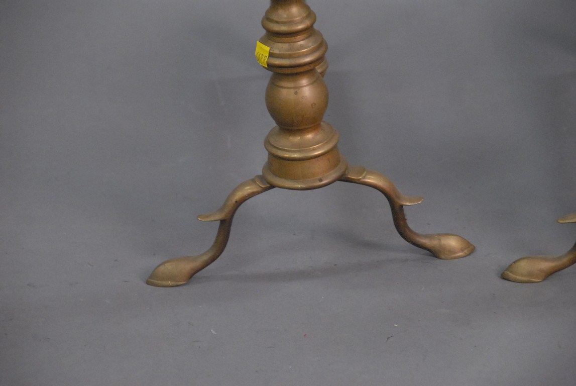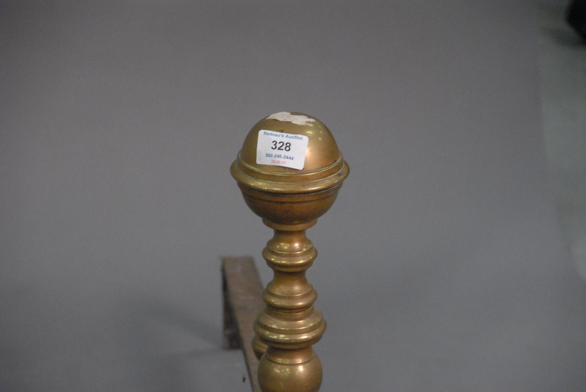 Lot 328: Pair of Federal brass andirons with log stops. ht. 14 1/2in. lg. 17 1/2in. Provenance: Estate of Judy McDonough Gengras of Stoner…..