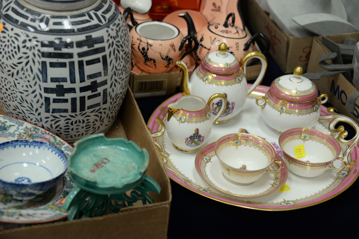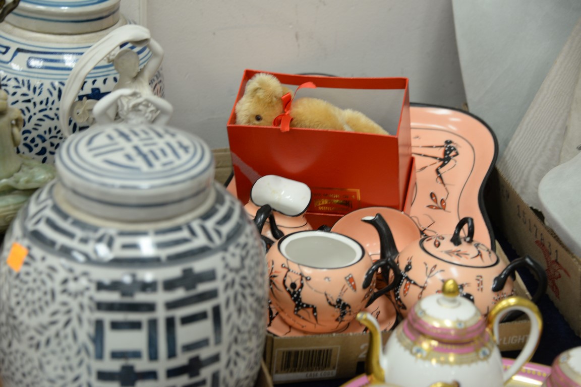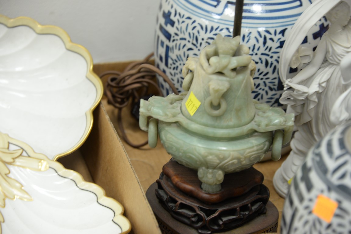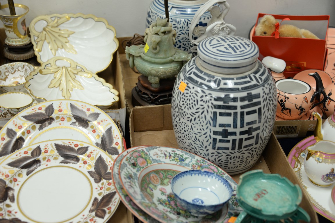 Seven box lots including Vista Alegre Mottahedeh Historic Charleston Canton blue tureen as is and a hot plate, Oriental figure, jade lamp with shade, pot, silver overlay Lenox salt and pepper, Wedgwood black and white, pair of blue and white ginger jars, Oriental plates, Staffordshire, two tea sets with trays.