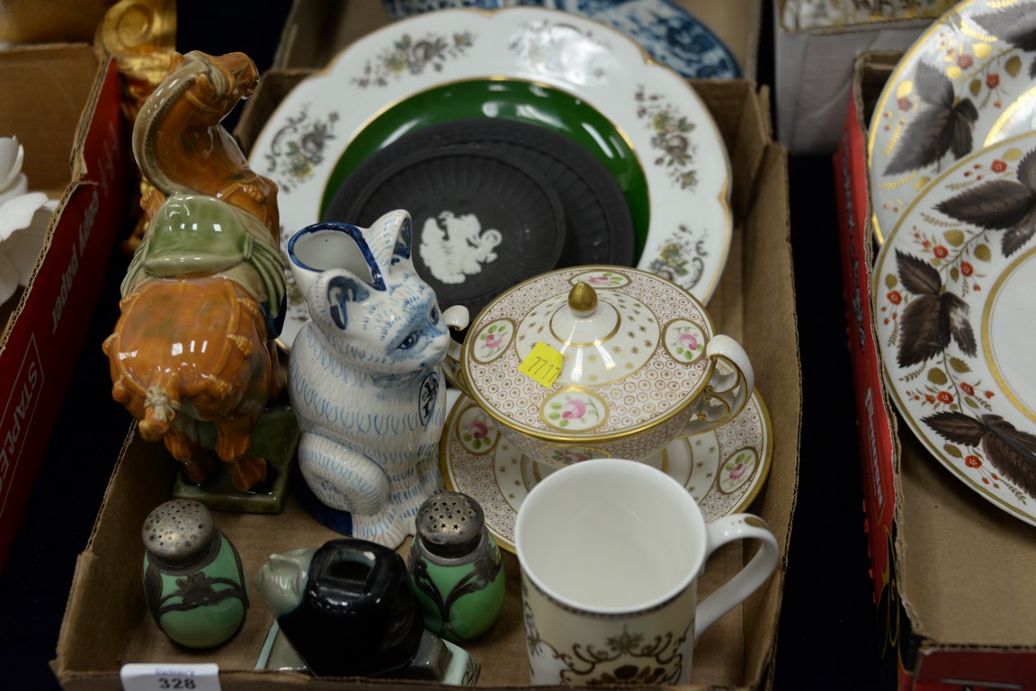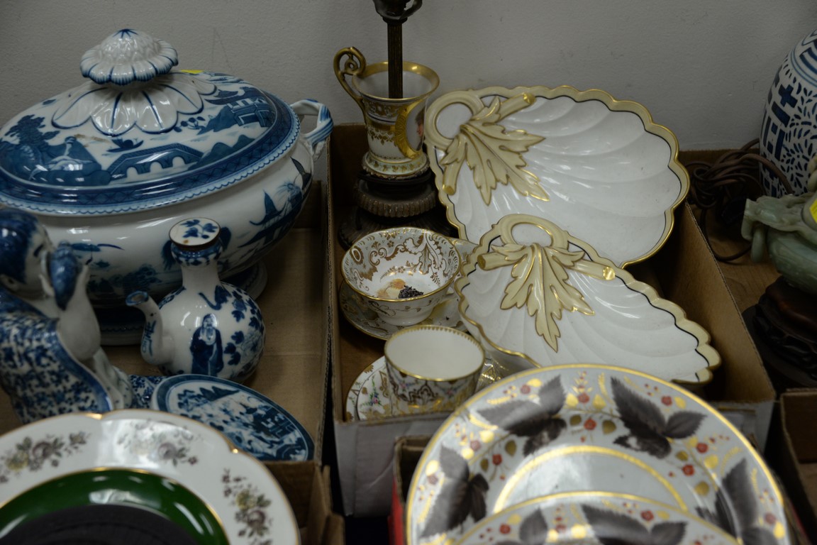 Lot 328: Seven box lots including Vista Alegre Mottahedeh Historic Charleston Canton blue tureen as is and a hot plate, Oriental figure, ja…