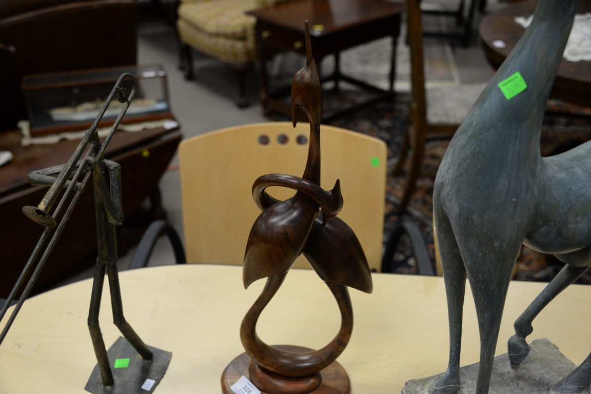 Lot 328: Seven piece group to include carved seagull, pair of carved animals signed D.J., courtship of cranes carved sculpture, bronze lilypa…