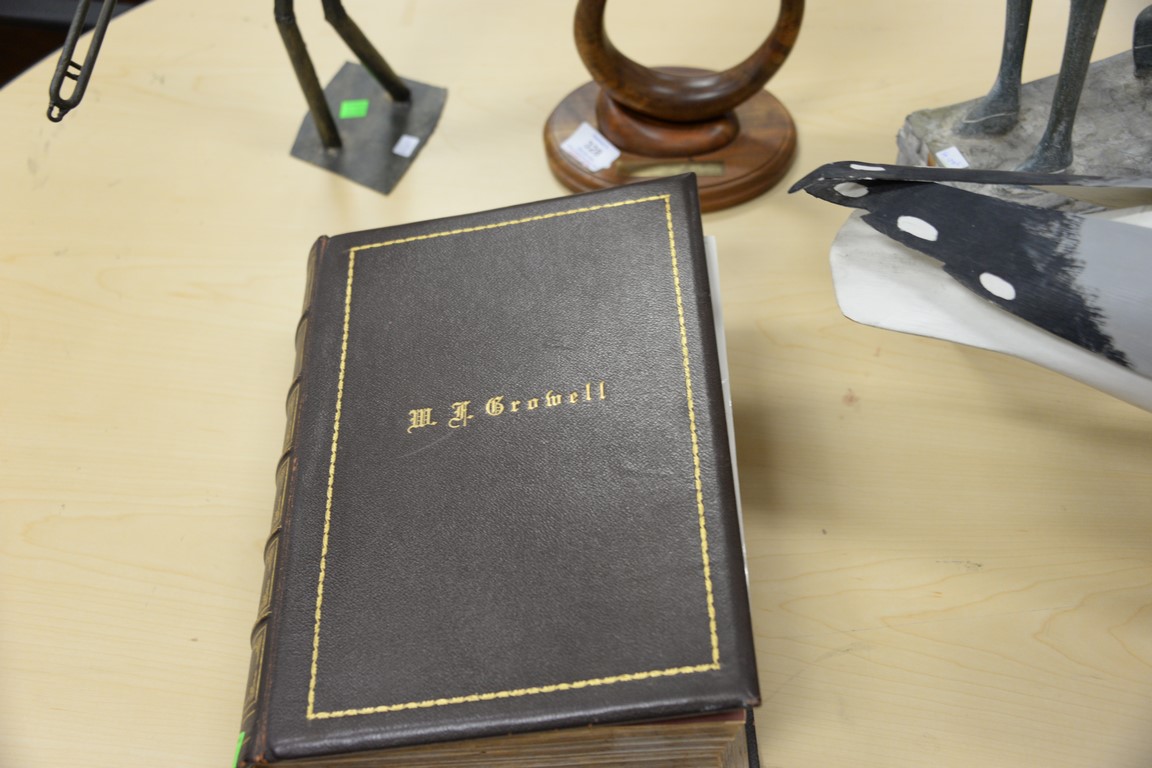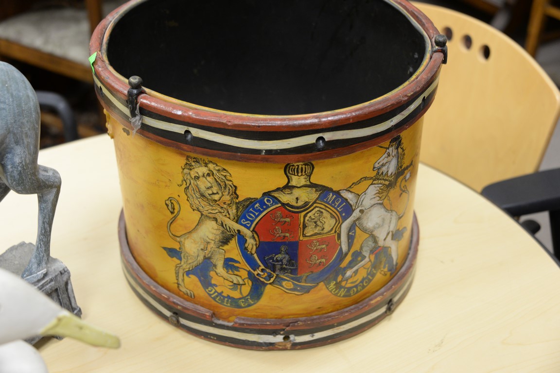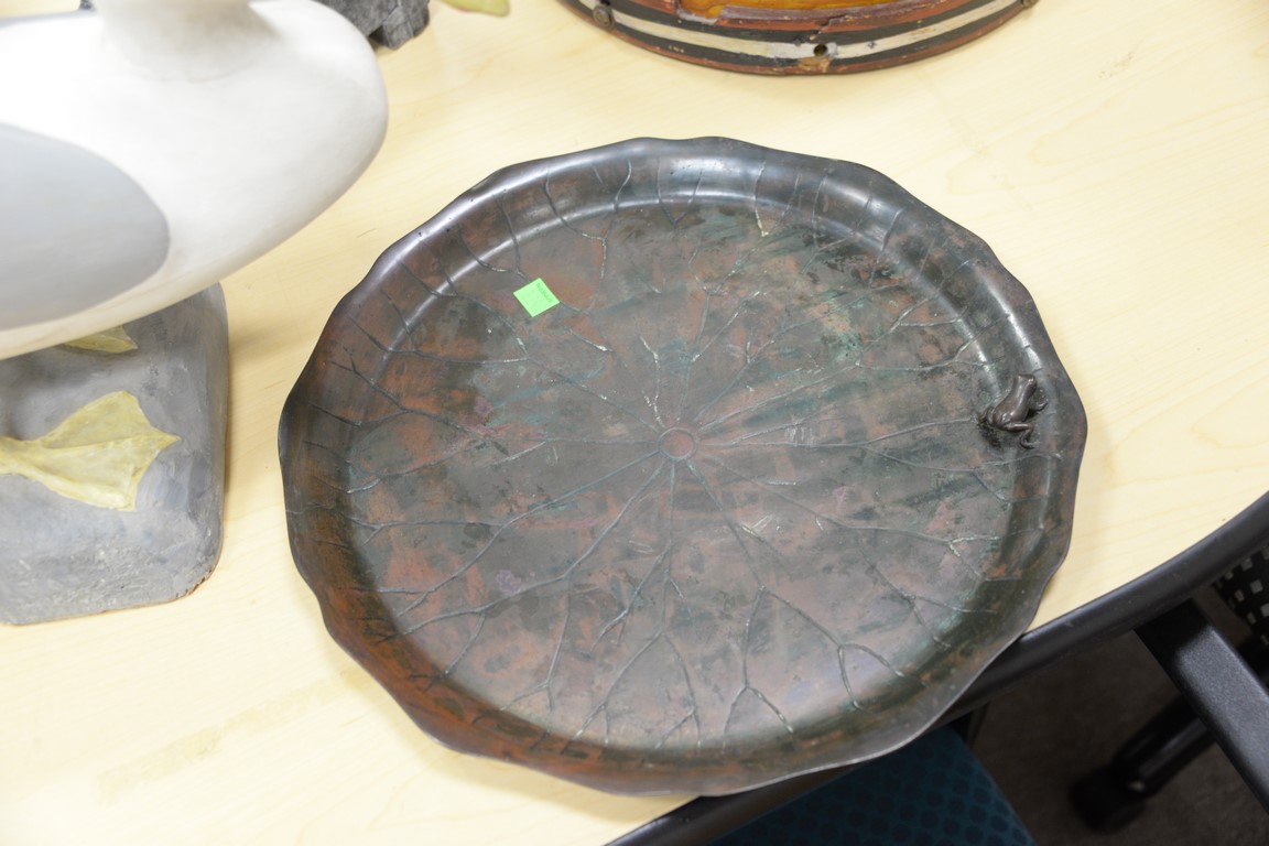 Seven piece group to include carved seagull, pair of carved animals signed D.J., courtship of cranes carved sculpture, bronze lilypad tray with small frog on it, an antique drum, and The Eagle and Brooklyn book. carved animals 29 1/2 and 21