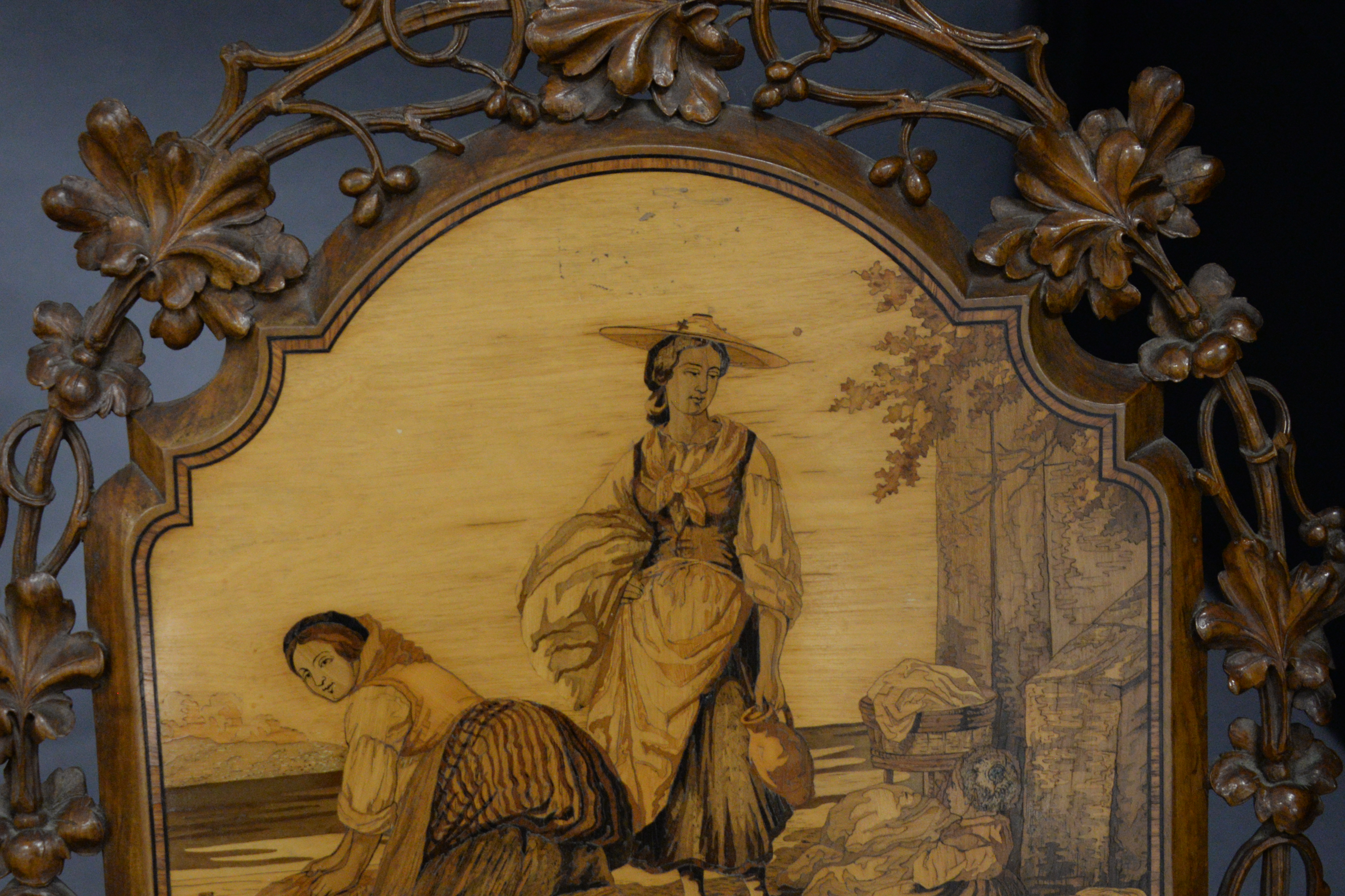 Depicting Two Peasant Women and a small washing laundry bordered by carved wood leaves and berries