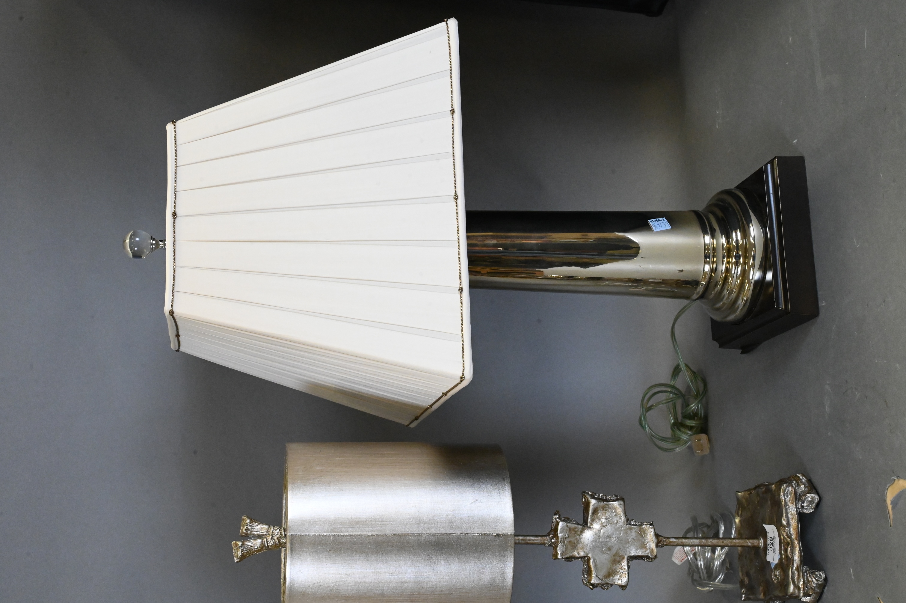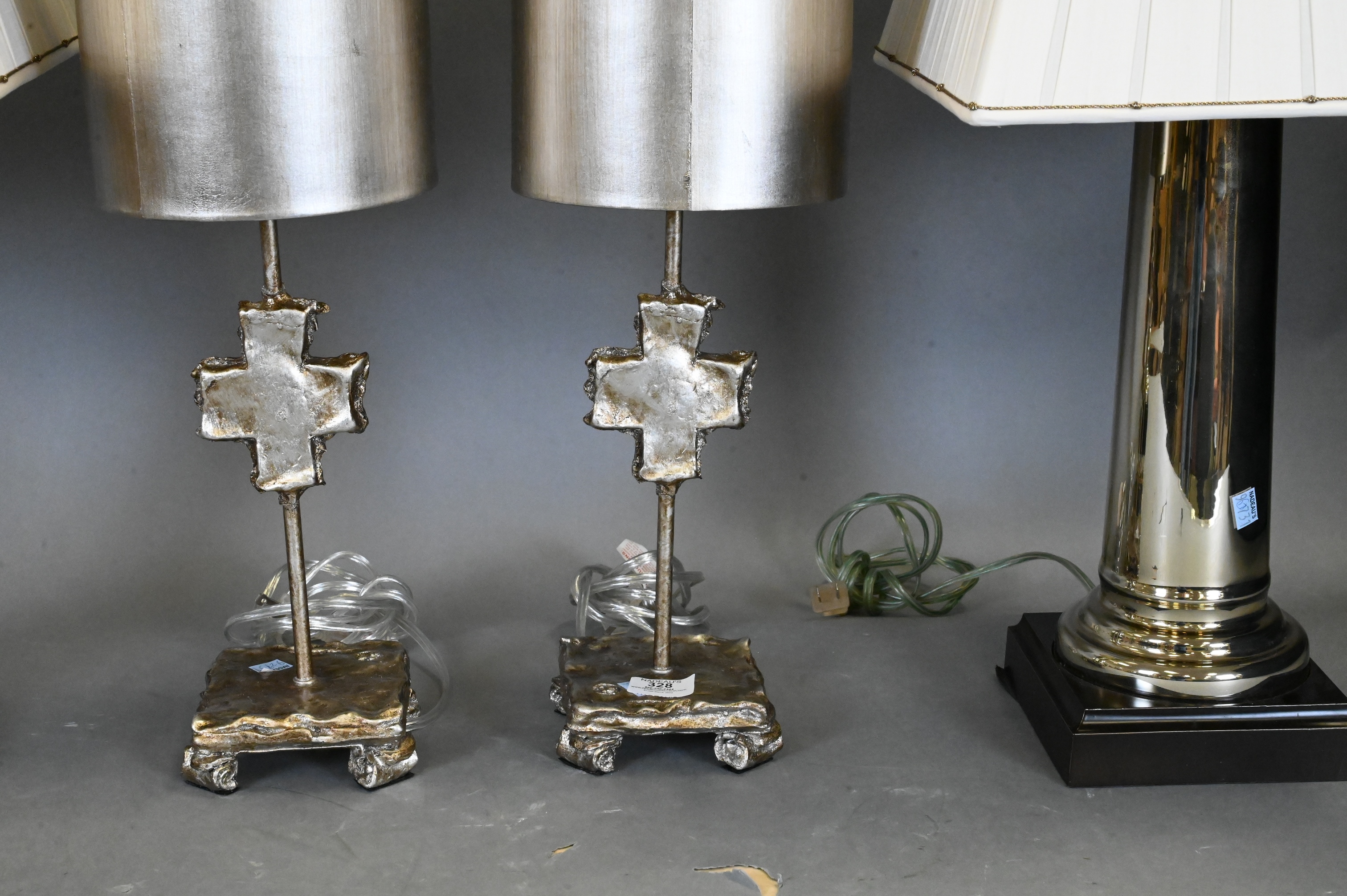 to include pair of Lucas and McKearn cross silver table lamps slim body set on raised square pedestal base, with center cross motif