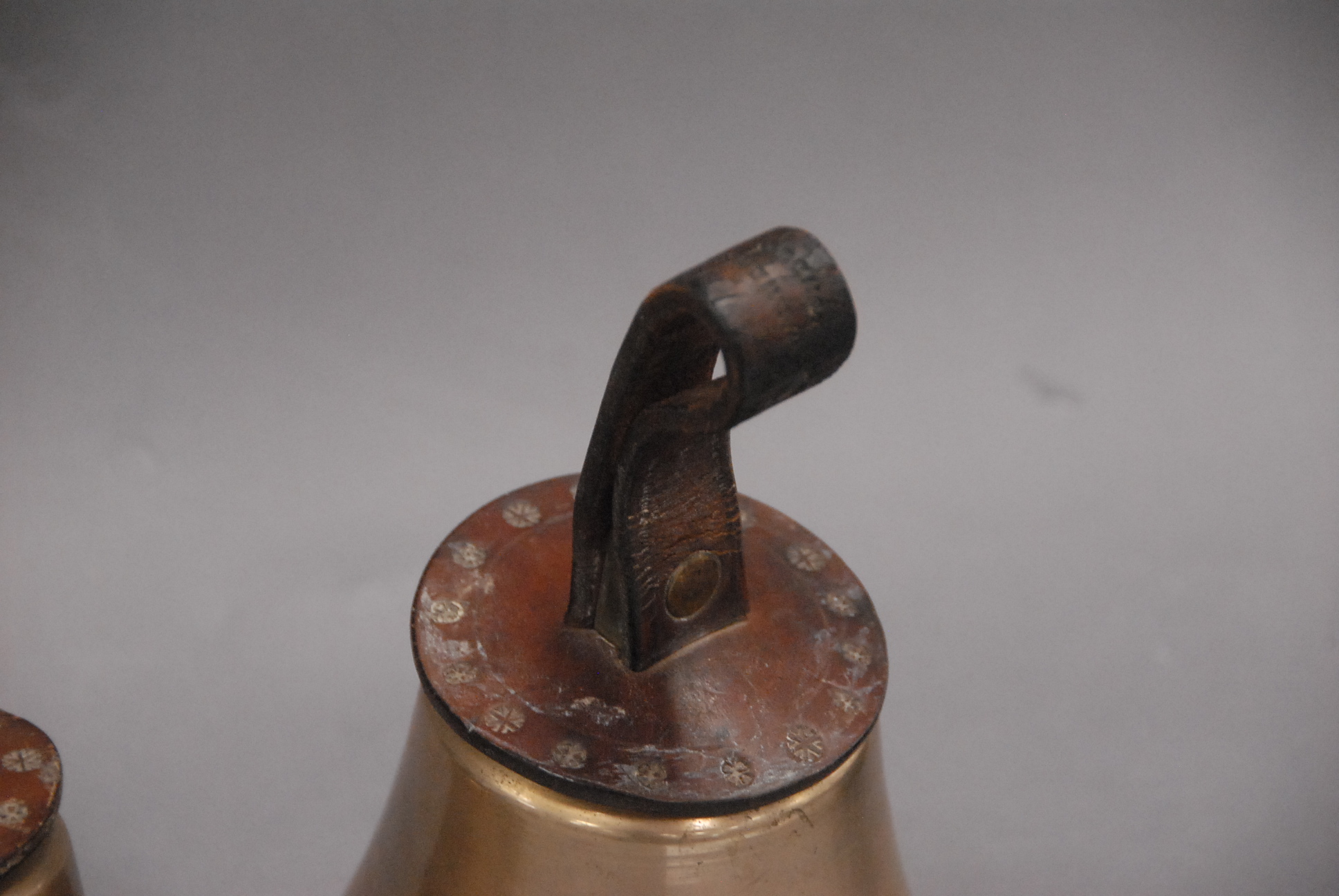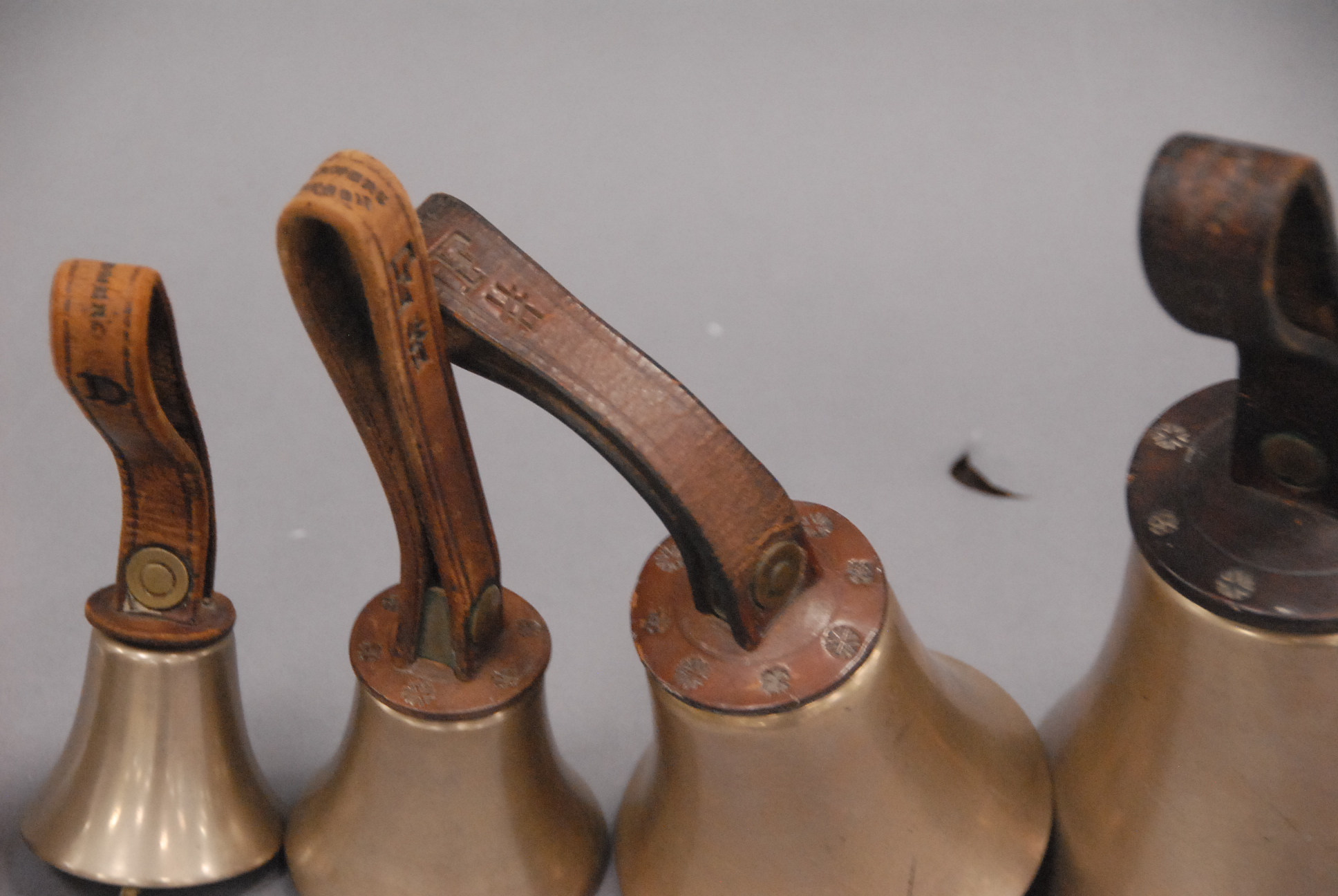 Collection of Warners London graduated hand bells with leather handles.