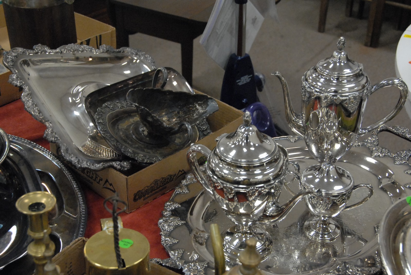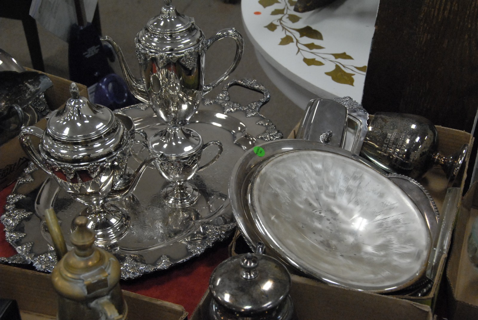5 tray lots plus trays all silver plate to include a 5 piece tea sets, brass candlesticks, brass pots, silver plated basket trays, gravy boat, and misc.
