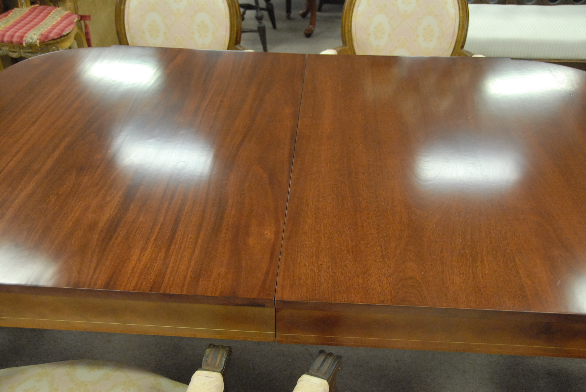 Beacon Hill custom mahogany Federal style dining table with two large leaves, very clean top, top: 68 x 44 with two 21in. leaves opens to 110.