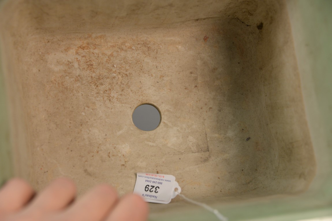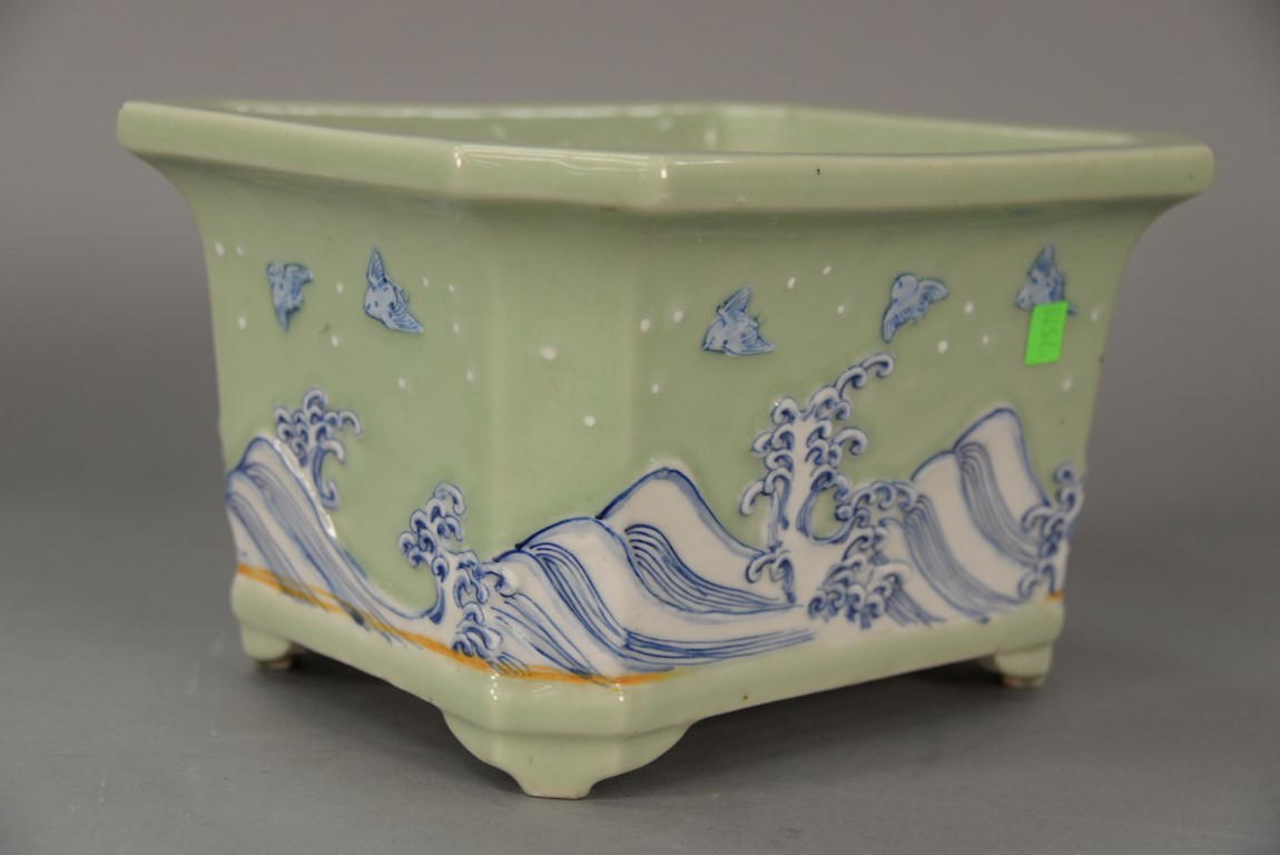 Lot 329: Celadon planter, rectangular, decorated with waves and birds. ht. 7 1/2 in. wd. 12 in. dp. 10 in.