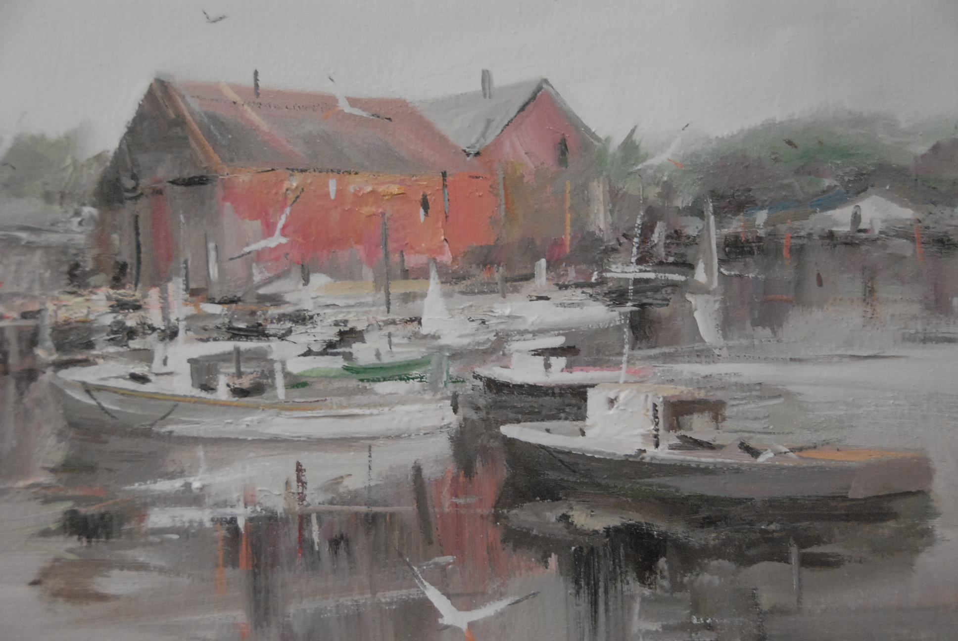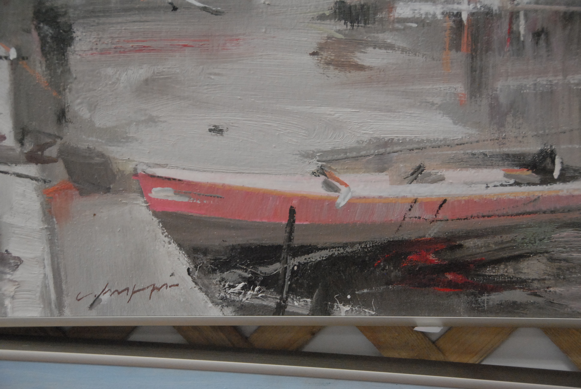 Charles C. Gruppe 1928 Harbour scene oil on board signed lower left C. Gruppe, 23 x 35.
