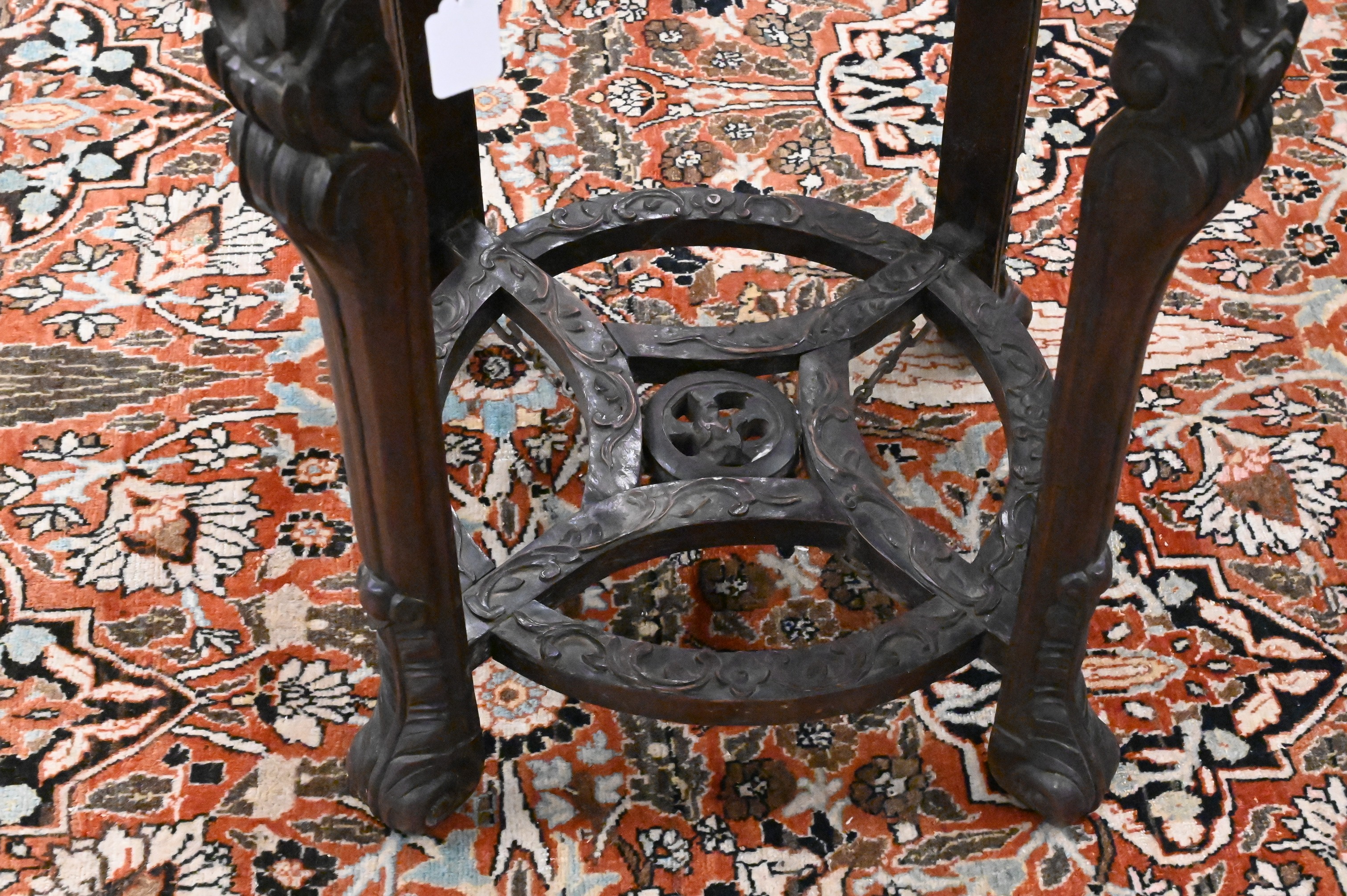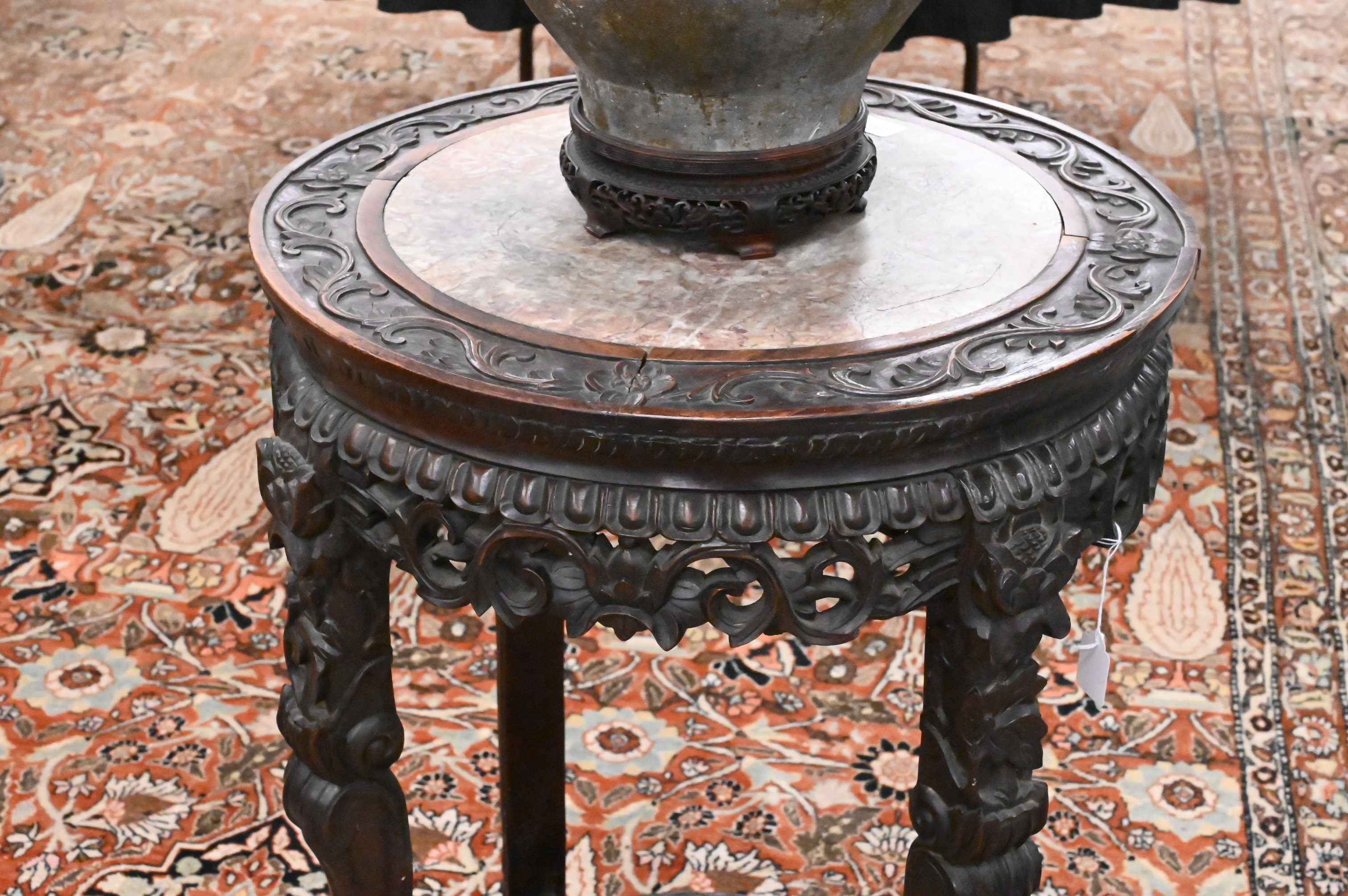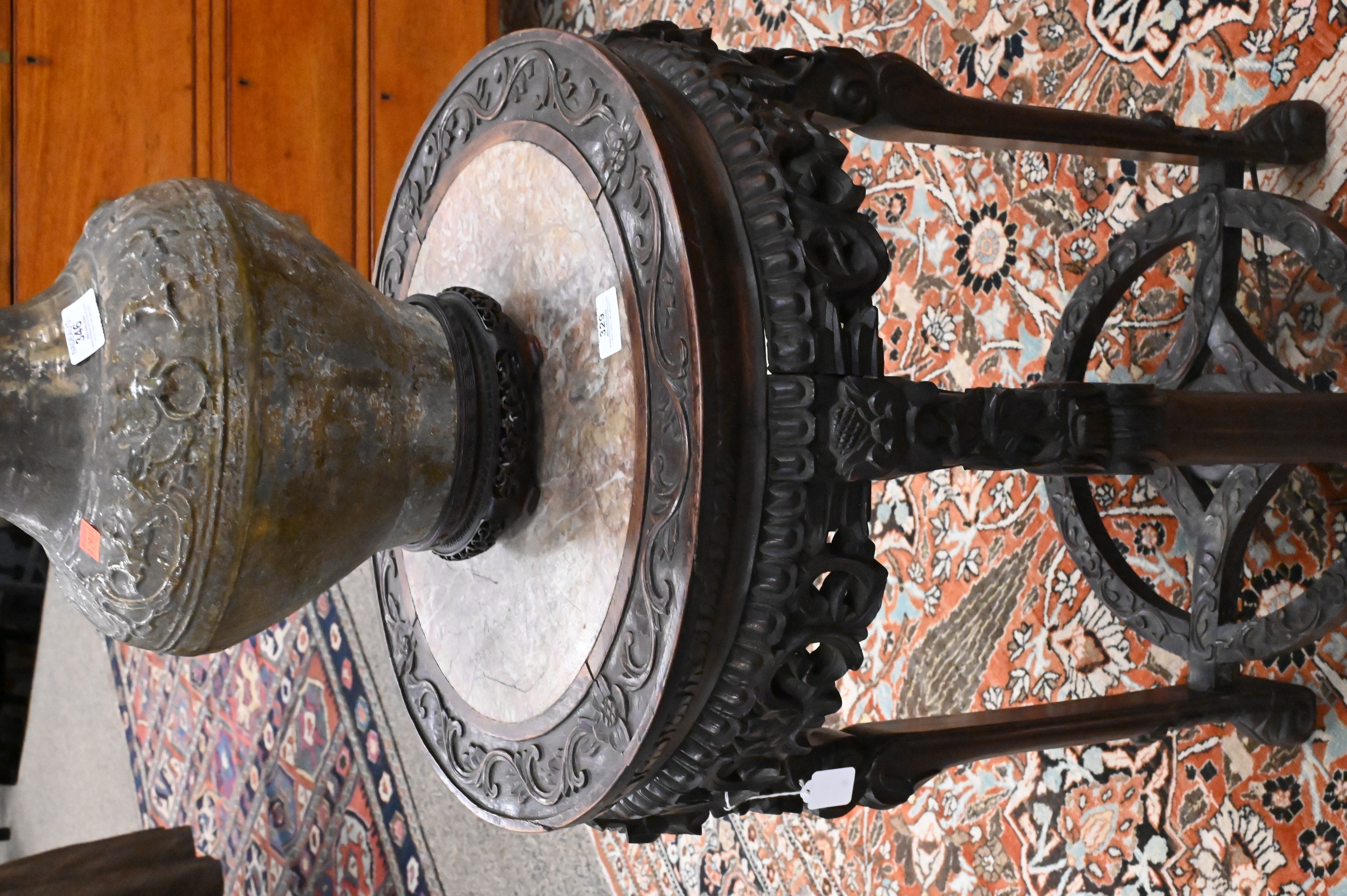 A finely carved hardwood stand with circular marble inset top, the shaped apron with openwork floral and foliate carvings, raised on four cabriole legs joined by a circular pierced stretcher, terminating in scrolled feet.