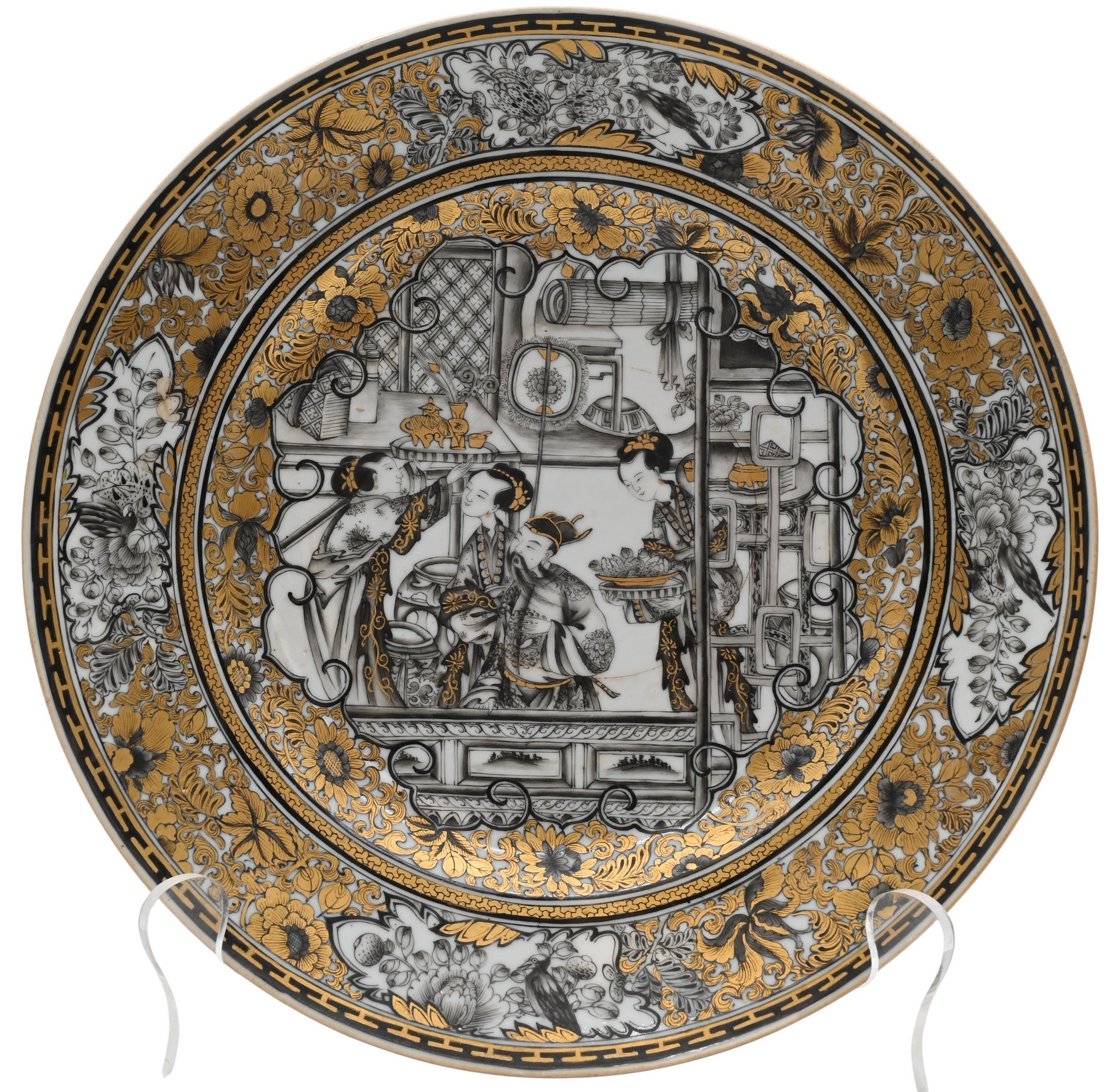 Lot 329: Chinese Porcelain Grisaille and Gilt Figural Dish
