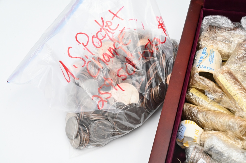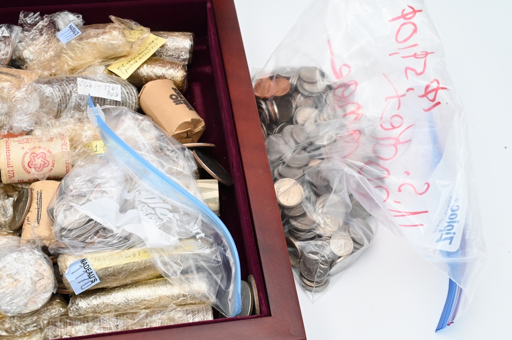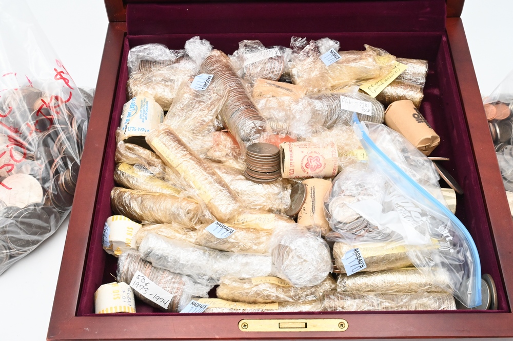 Dollars, Half-Dollars and Quarters, along with wood box.