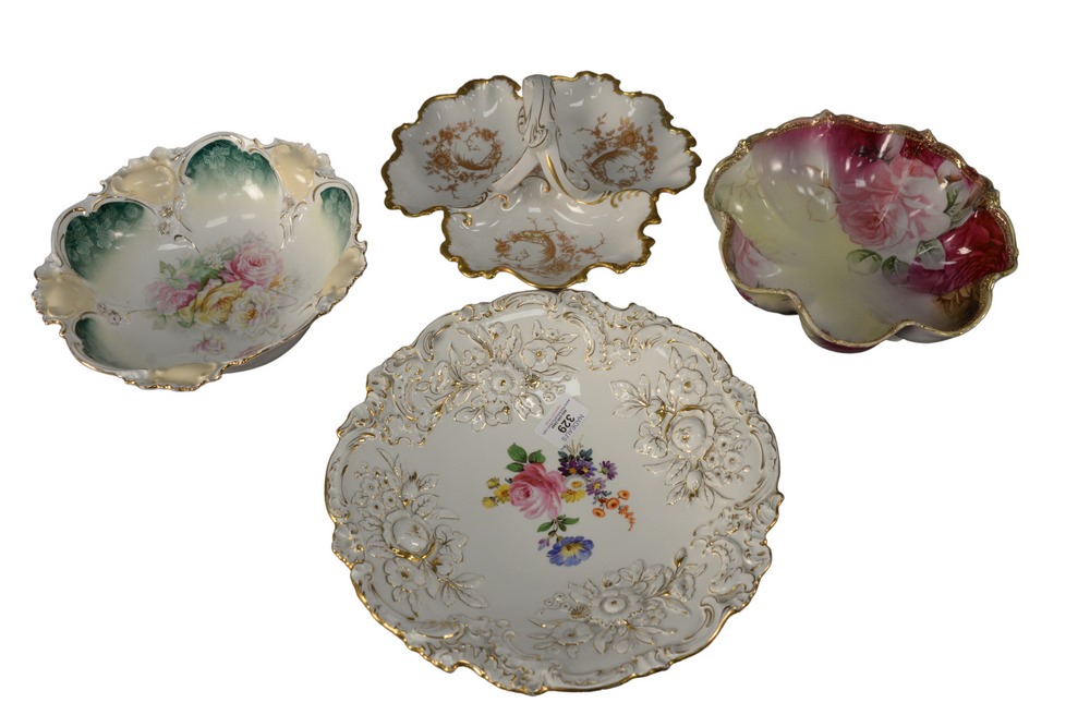 Lot 329: Four Piece Lot of Porcelain, to include R.S. Prussia bowl having rose and gilt decoration; Meissen bowl having floral center and gil…