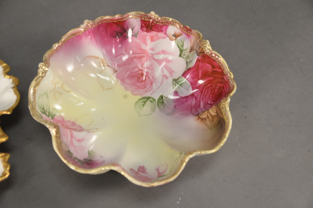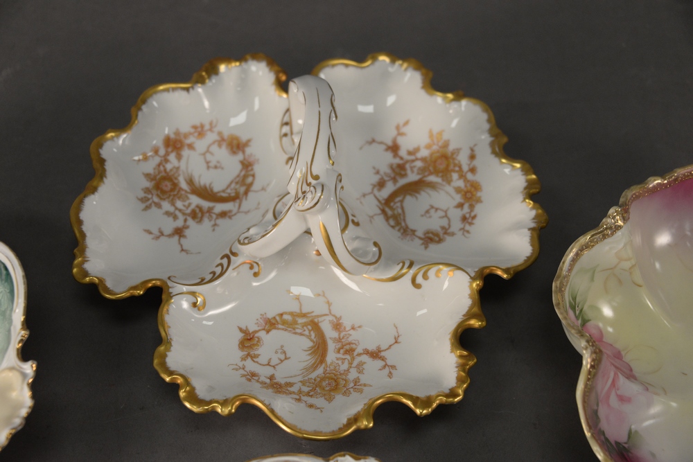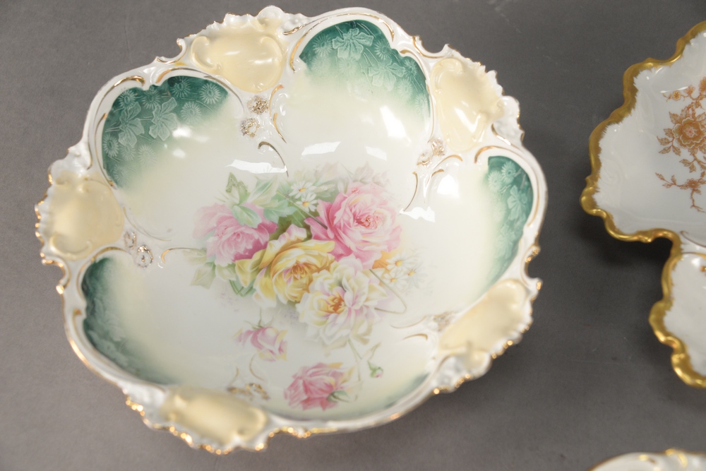 Four Piece Lot of Porcelain, to include R.S. Prussia bowl having rose and gilt decoration; Meissen bowl having floral center and gilt rim; along with a Limoges three part handled tray having gilt game bird motif, Meissen diameter 12 inches.