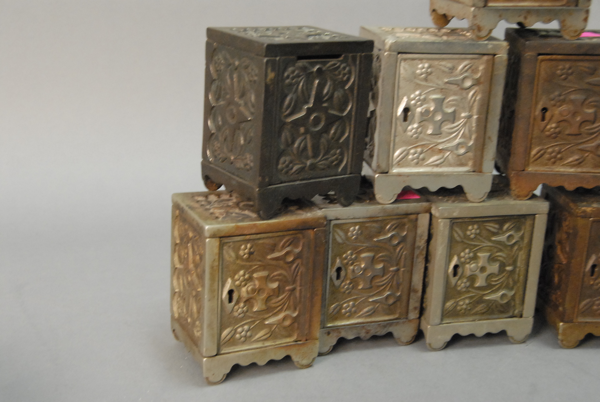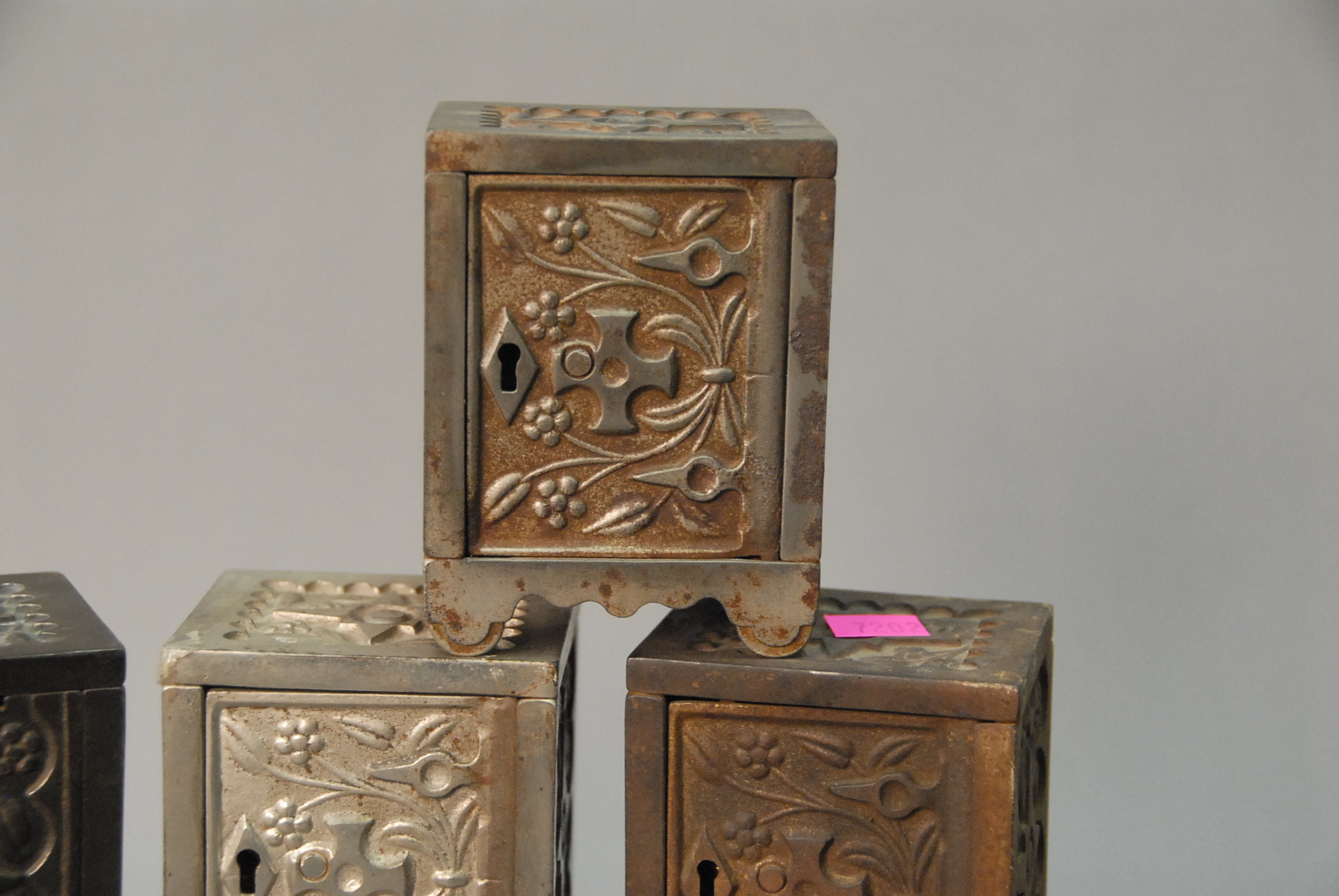Group of eight cast iron key lock banks by Stevens Company Cromwell CT 1890. ht. 4in.