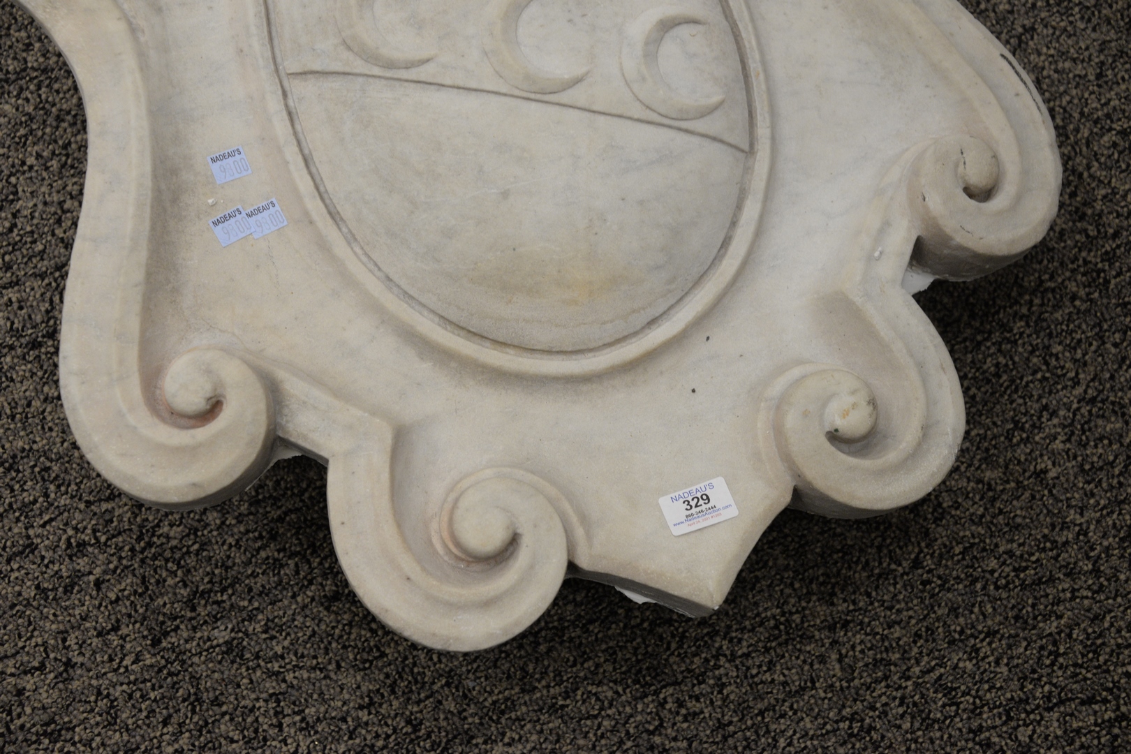 Lot 329: Italian White Marble Armorial, having three carved crescent moon design, height 26 inches, width 23 inches.