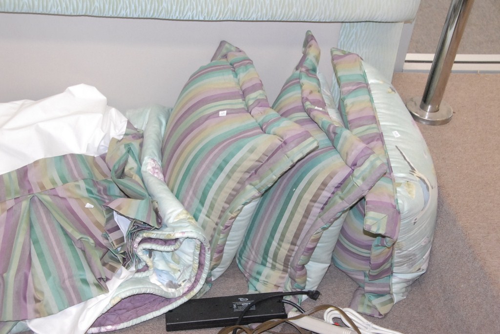 King size upholstered headboard with comforter, skirt, and matching pillows.
