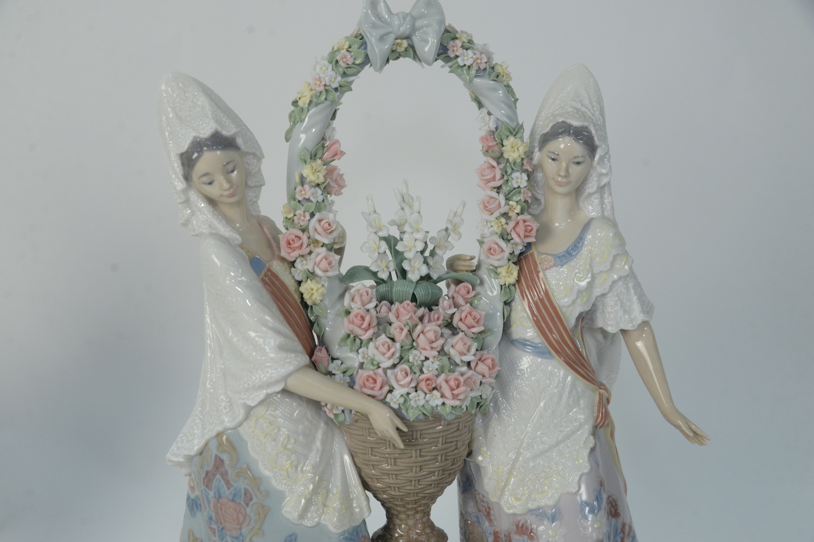 Lot 329: Large Lladro Porcelain Figure, two women holding a flower basket, signed on the underside ‘I. Huertas’ and ‘V. Navarro’, No. 132, height 15 inches.