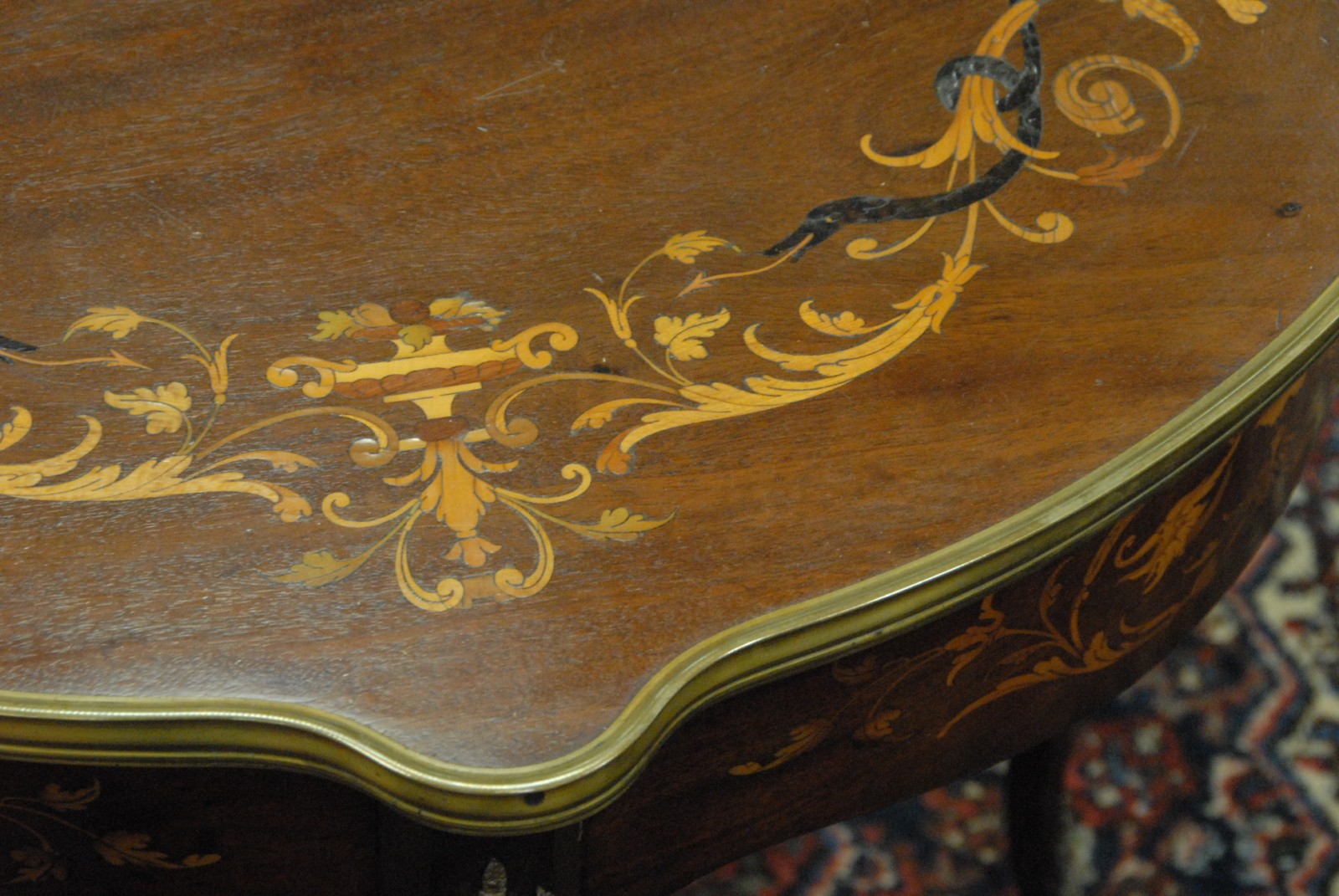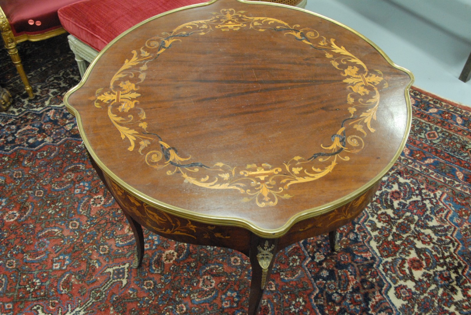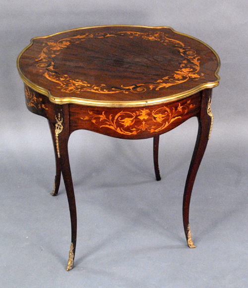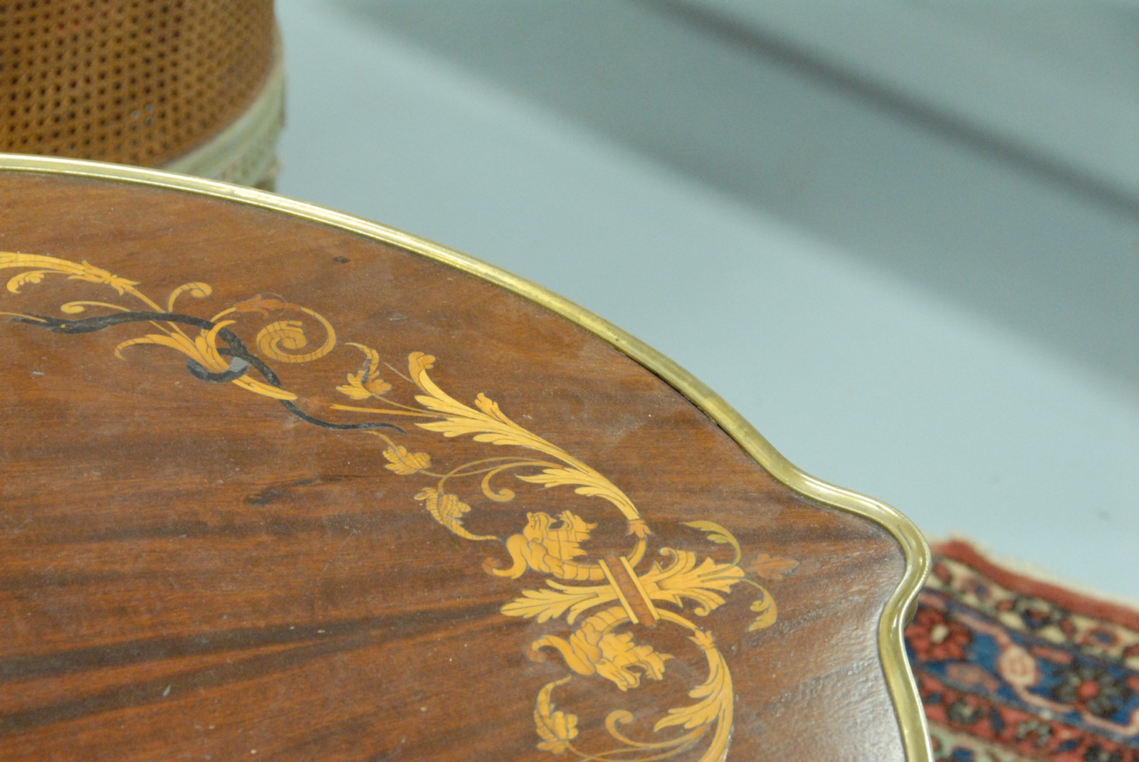 Marquetry inlaid mahogany shaped top table with brass trim and mounts.