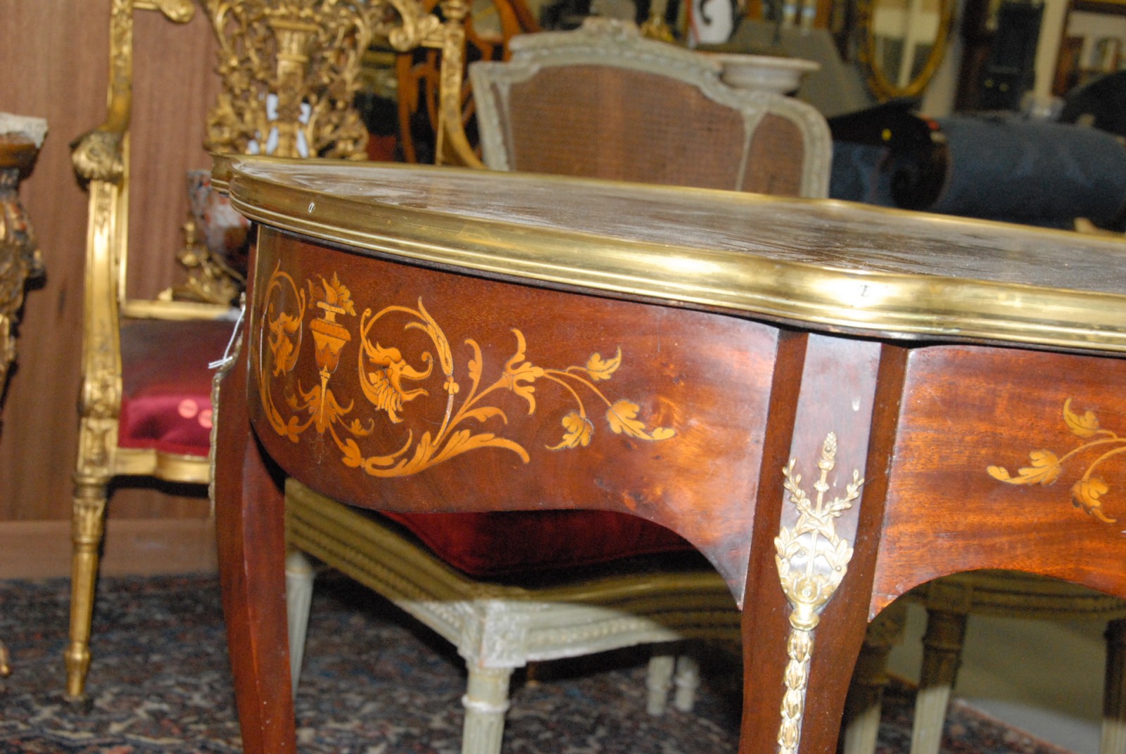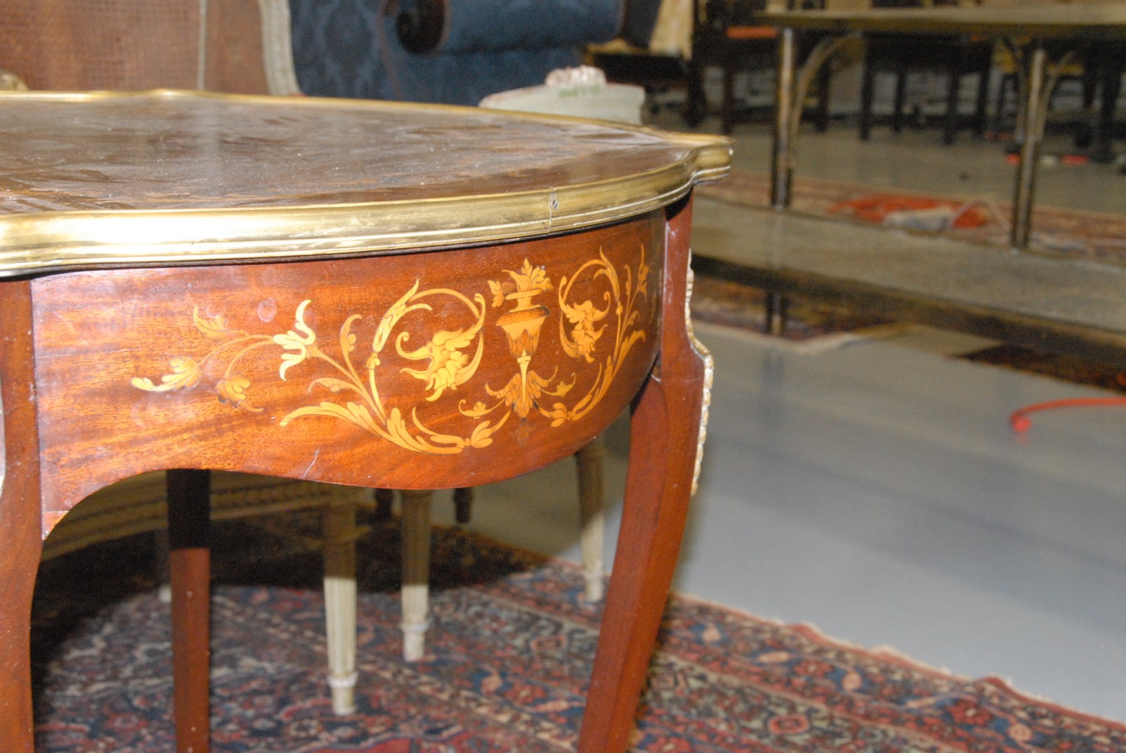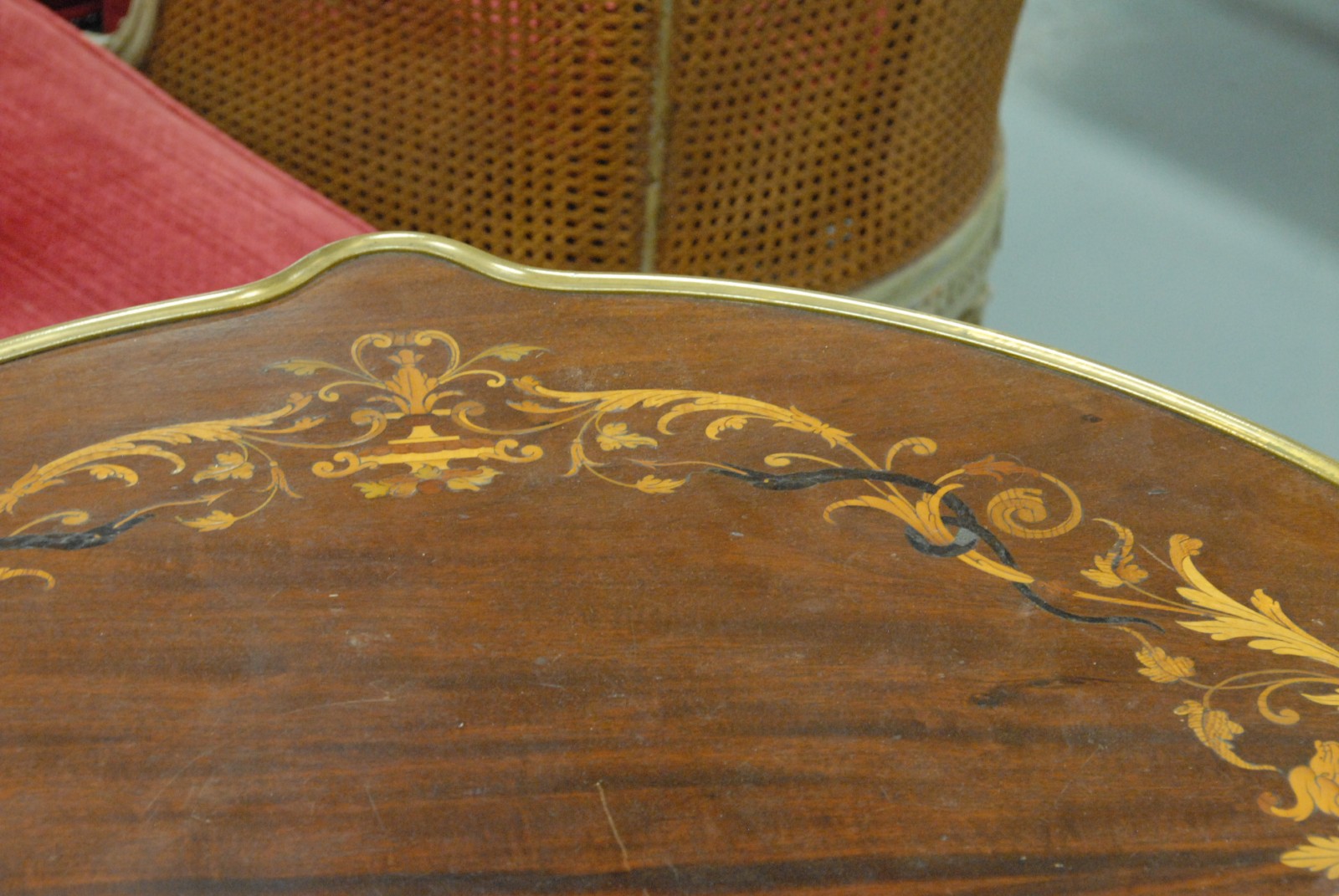 Marquetry inlaid mahogany shaped top table with brass trim and mounts.