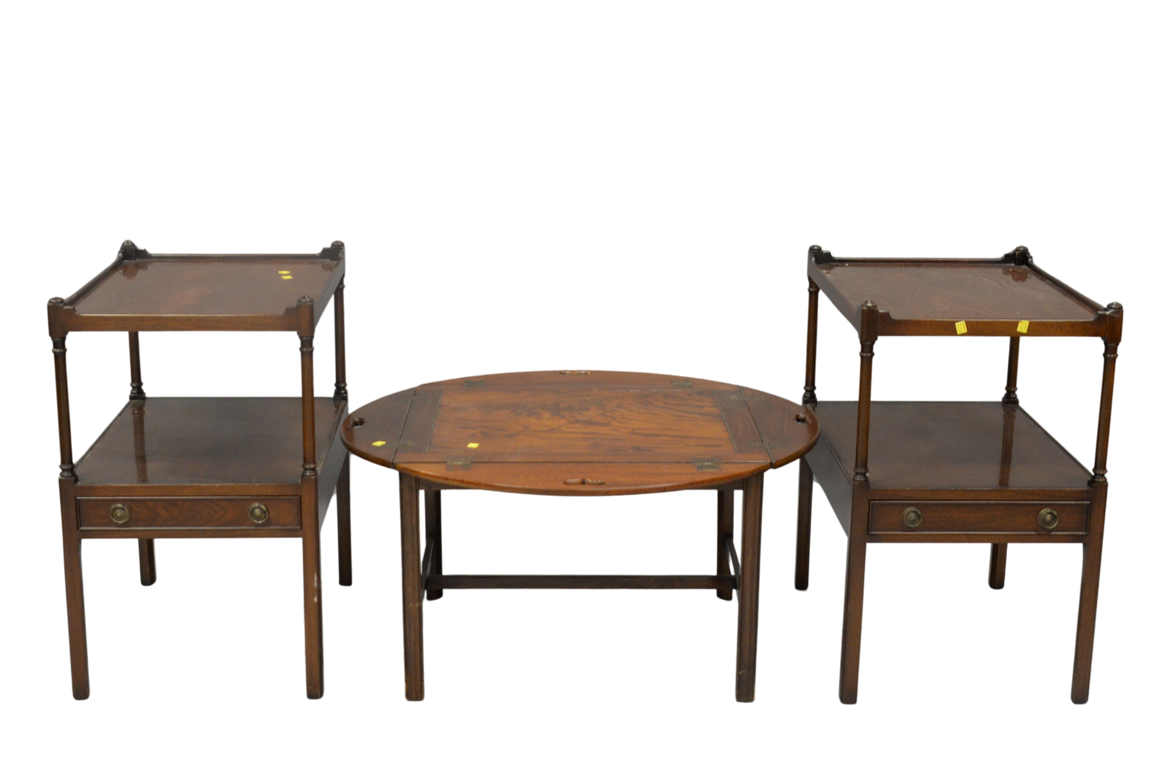 Three Piece Furniture Lot, to include pair of two tier side tables each having one drawer, along with a mahogany butlers cocktail table , height of side tables 28 1/4 inches, side table top 18″x 24″