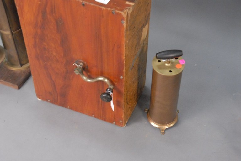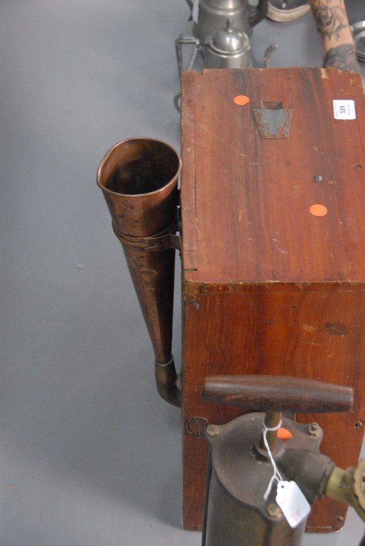 Three piece lot to include large nautical signal horn with wood case and wooden handle crank having side mounted horn and two hand pump whistles. ht. 14in. ht. 22in. ht. 24in.