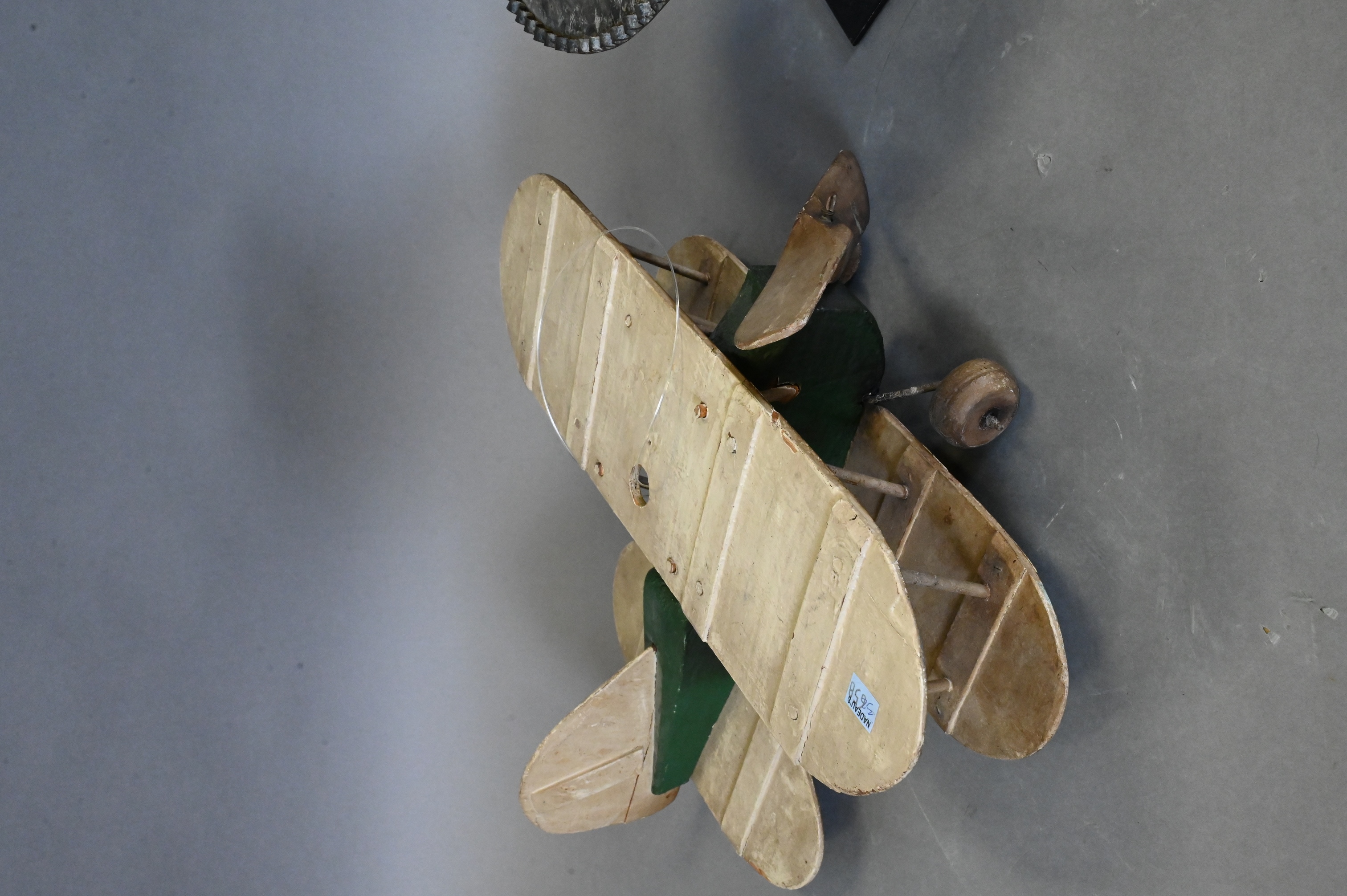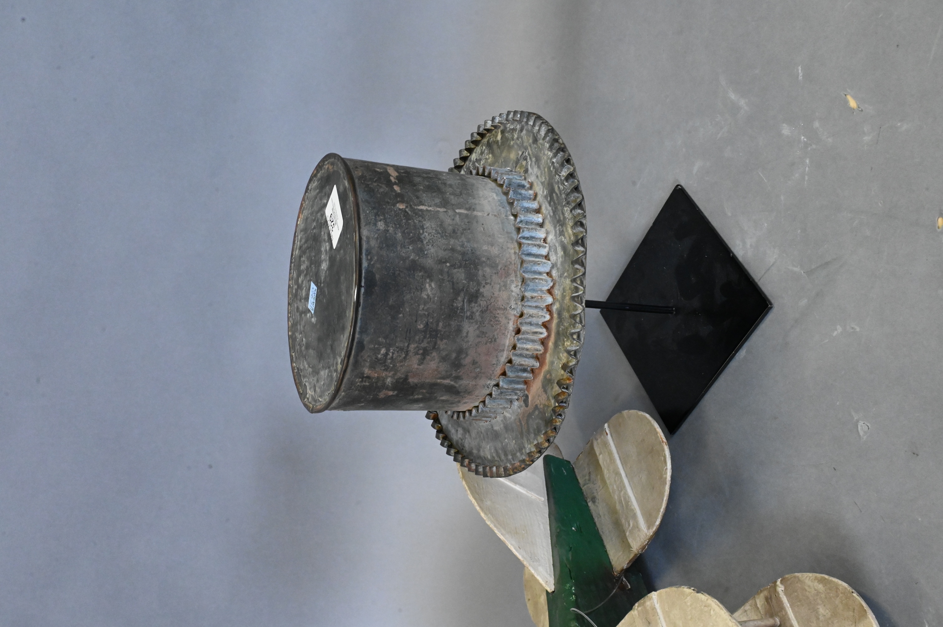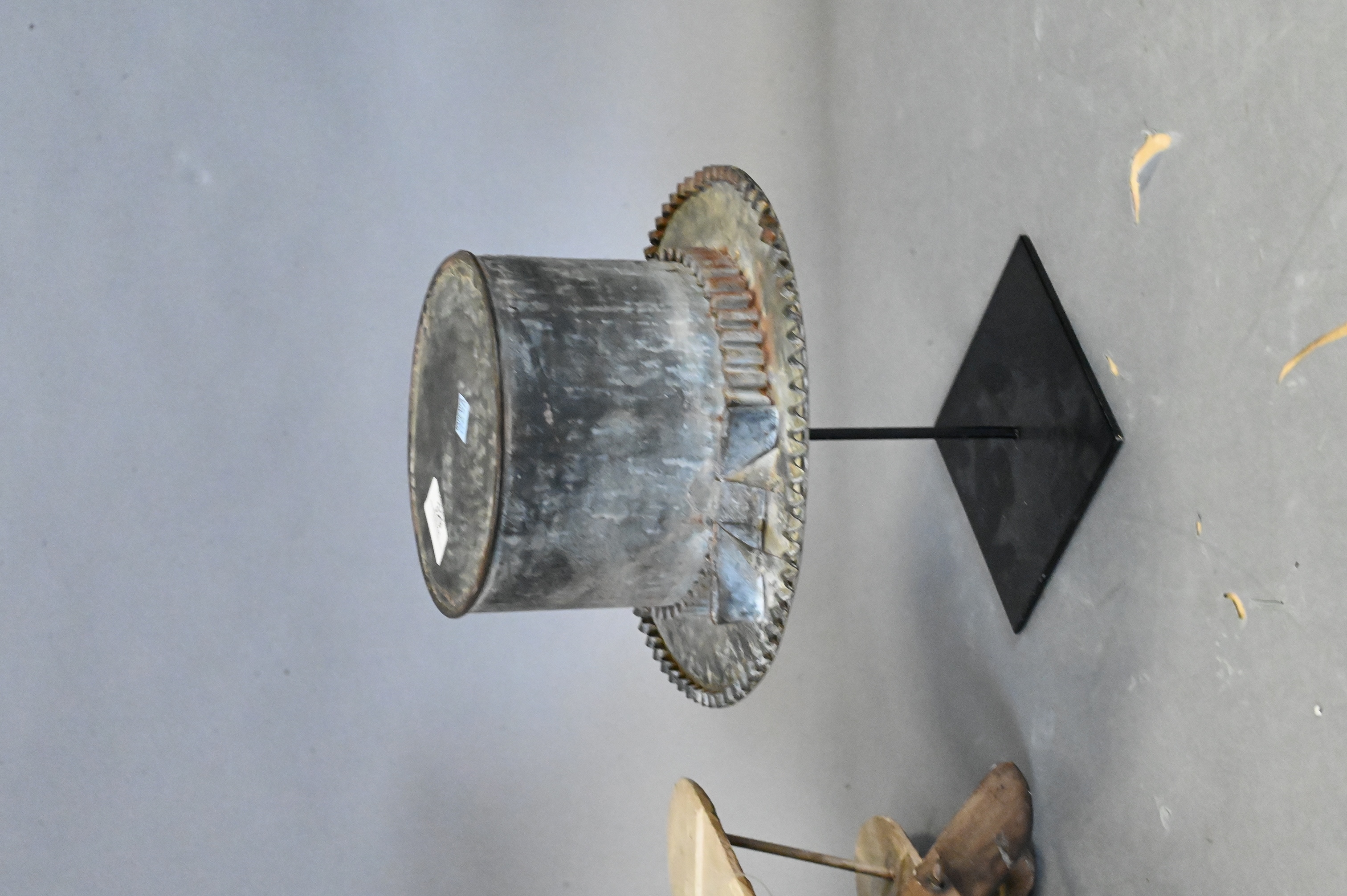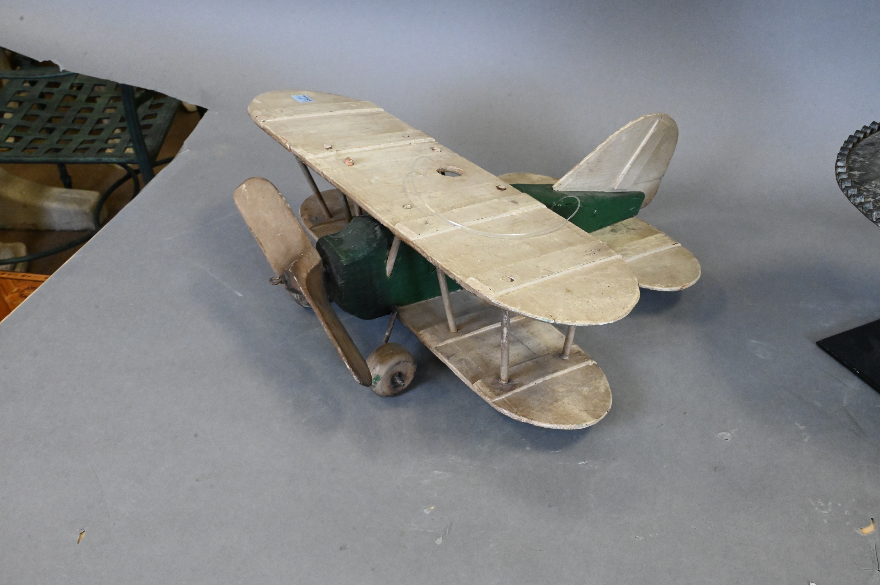 to include carved and painted hanging wooden airplane whirligig, and tin top hat having ribbed rim and bowtie mounted on iron stand